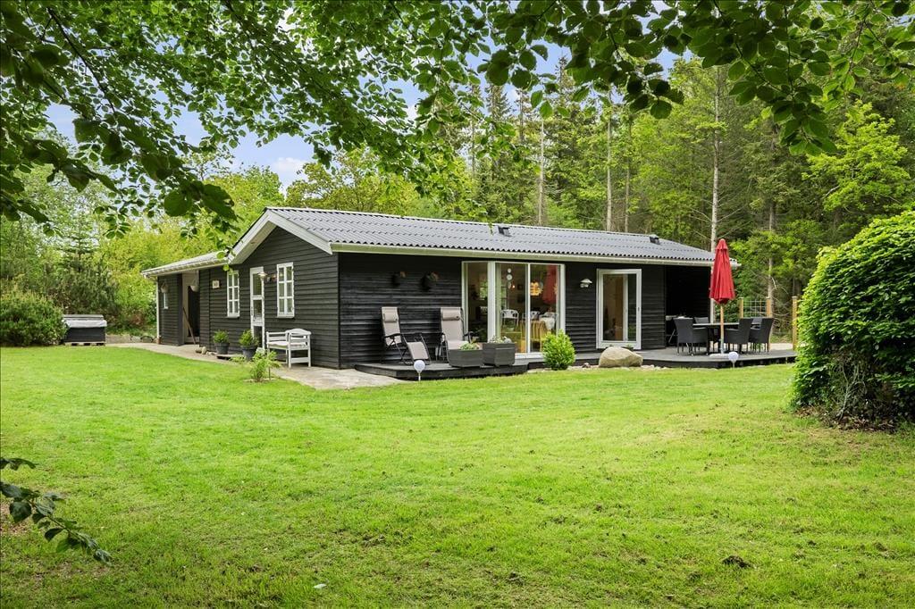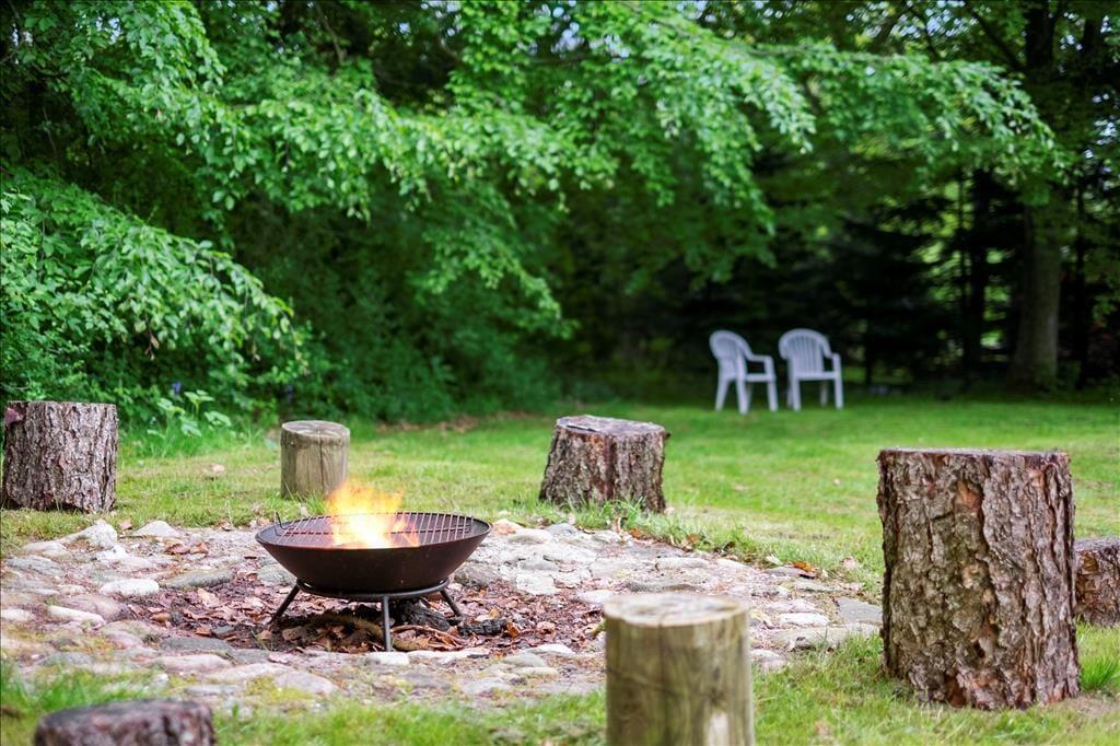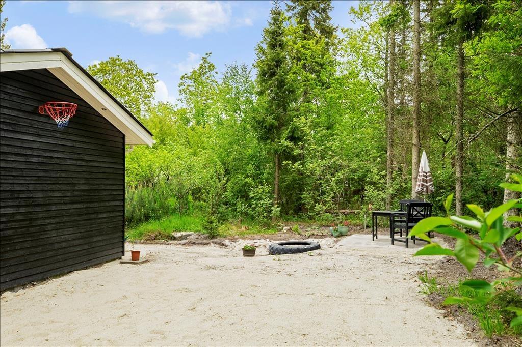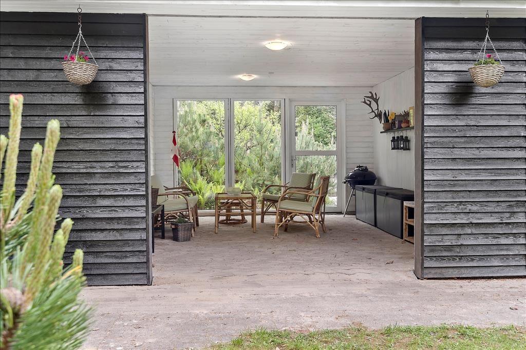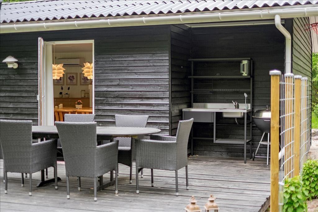 Når vejret indbyder til havespil og udendørs driverliv, kan du og dine kære ikke finde et meget bedre sted at være end her på Mollysvej 10. Naturgrunden er stor, og den skærmes af høje træer, så udearealerne føles meget ugenerede og private. Græsplænen indbyder til boldspil, vejrmøller og andre fysiske udfoldelser, og der er også et bålsted, hvis I vil slutte dagen af med at bage snobrød eller riste skumfiduser under stjernehimlen. Sommerhusets dejlige terrasser er også skønne opholdssteder, uanset om det er vejr til at sidde i solen på et af de åbne arealer, eller om I foretrækker at rykke ind på det overdækkede område. Den overdækkede terrasse er afskærmet til tre sider, så det føles nærmest som at sidde i en udestue, og den kan derfor være med til forlænge udesæsonen både forår og efterår. Sidst, men ikke mindst skal det nævnes, at der er udekøkken, og hvis der er lystfiskere i familien, kan de passende rense dagens fangst her, inden den skal på grillen.