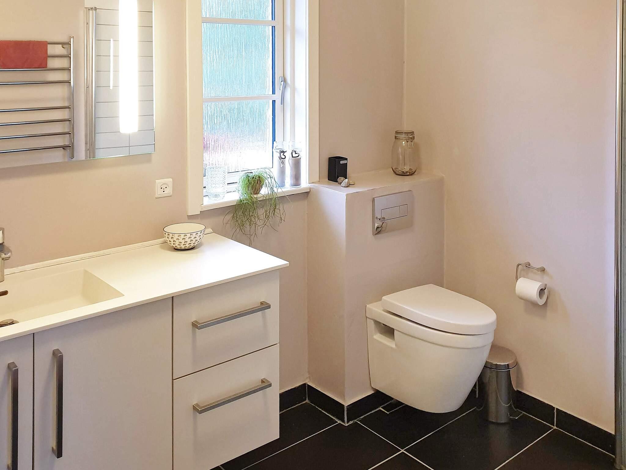 Badeværelse med badekar, bruser, toilet, samt gulvvarme. Der er også et gæstebadeværelse. Til huset hører desuden bryggers med vaskemaskine, tørretumbler og separat fryser. Der er weekendseng og højstol til de mindste.