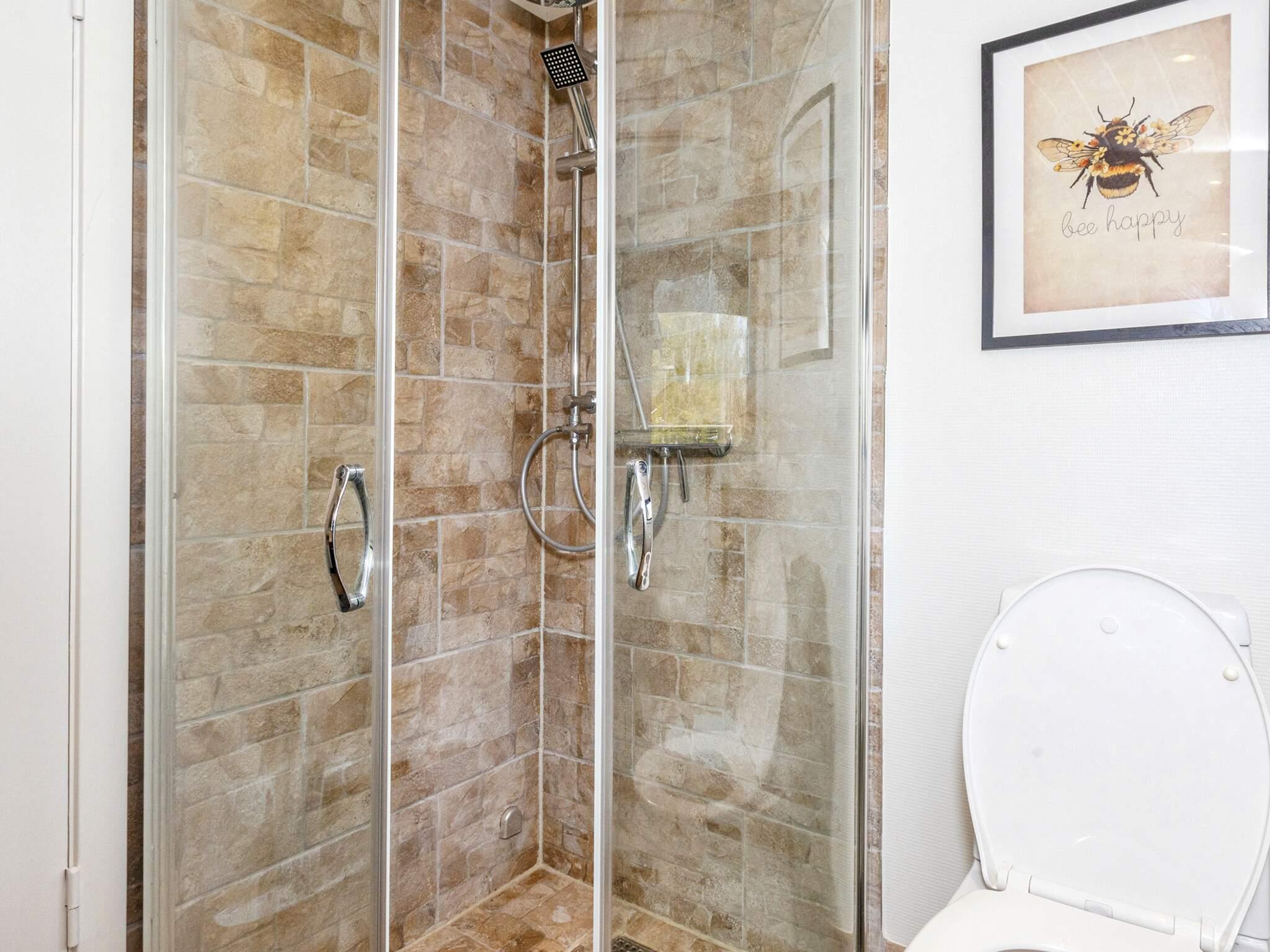 Lyst og stilfuldt badeværelse med bruser, badekar og toilet.