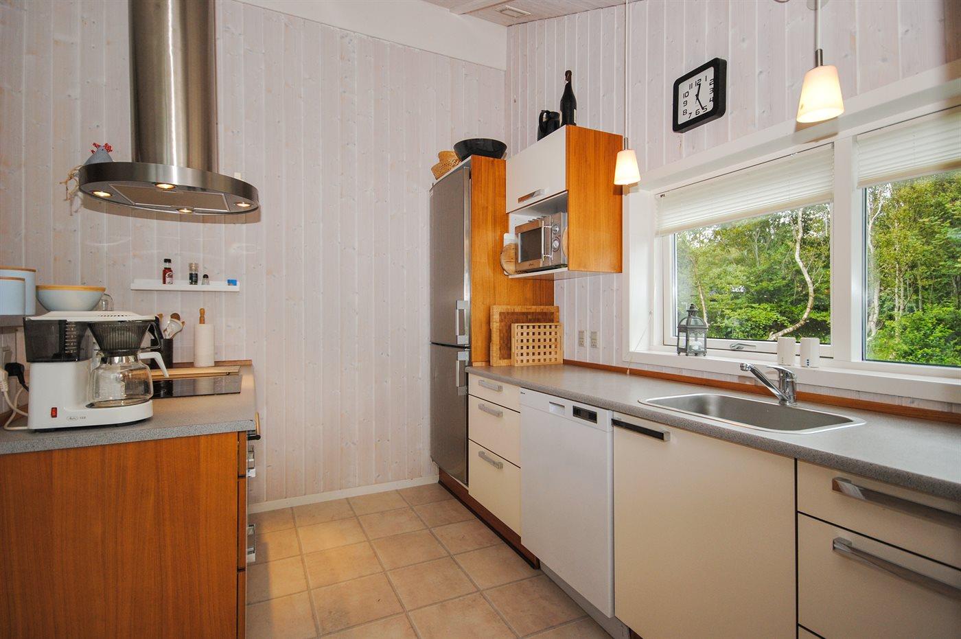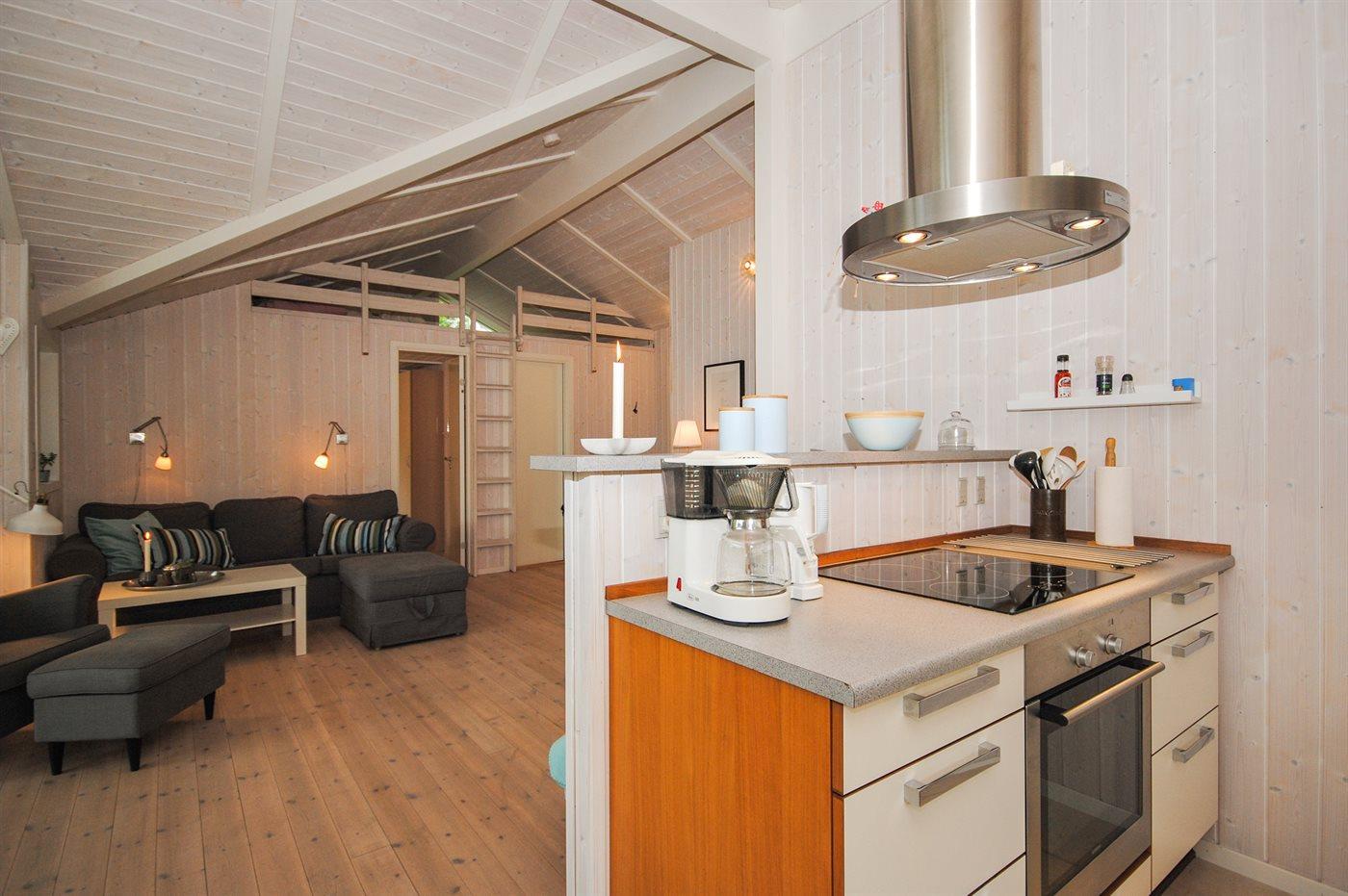 Køkkenet er udstyret med 1 køleskab. Der er 4 keramiske kogeplader, varmluftovn, mikrobølgeovn samt opvaskemaskine.