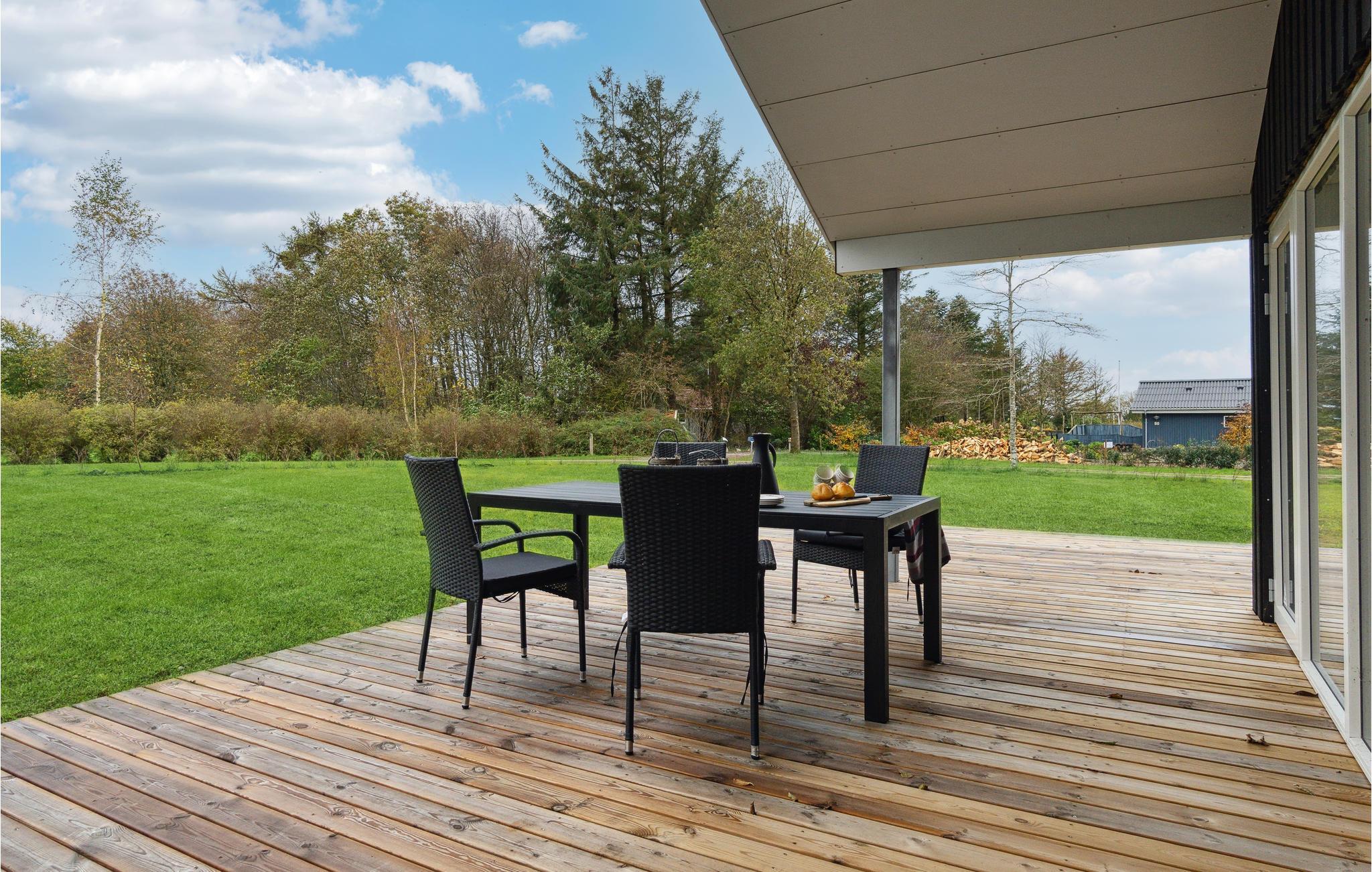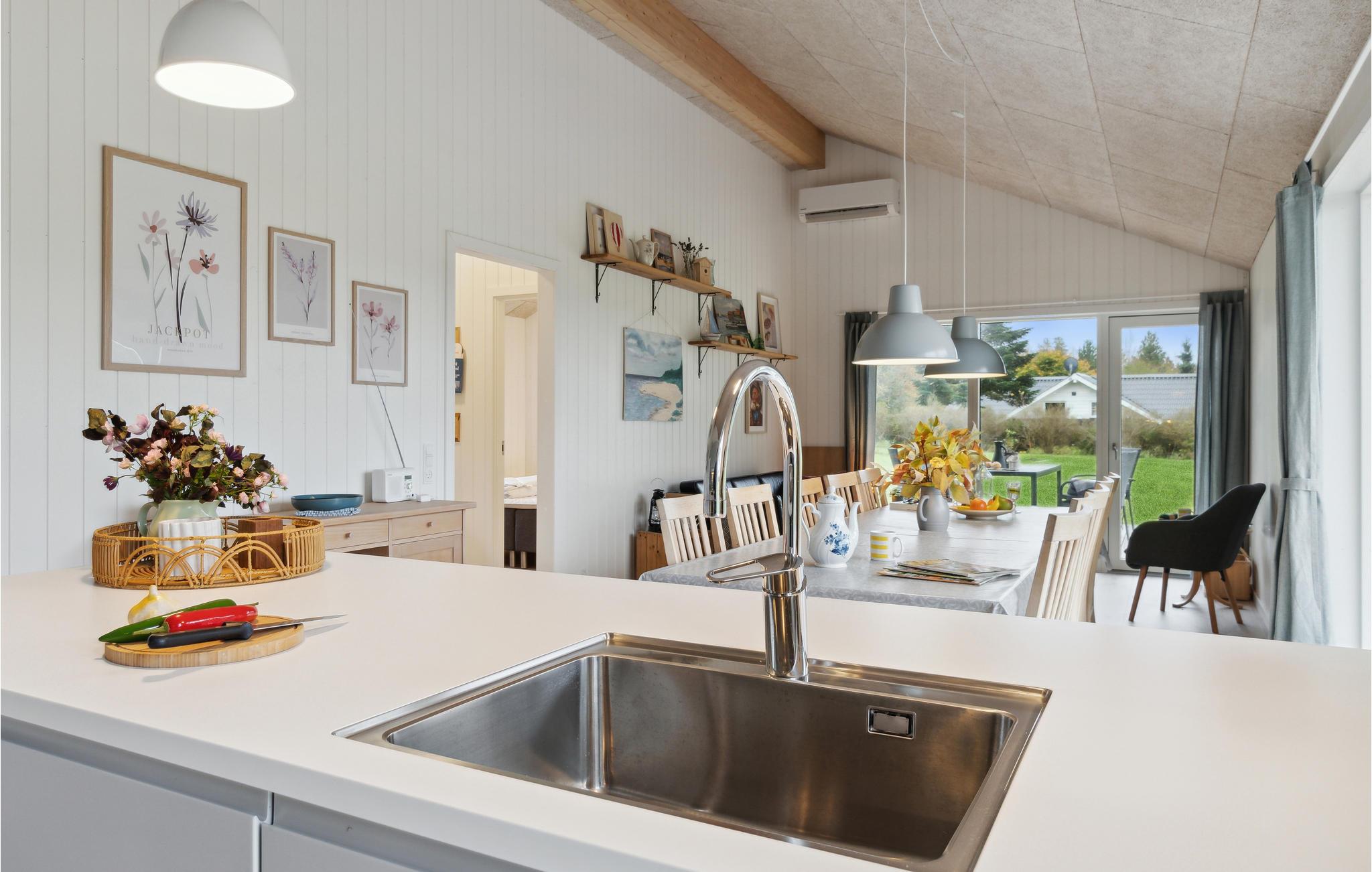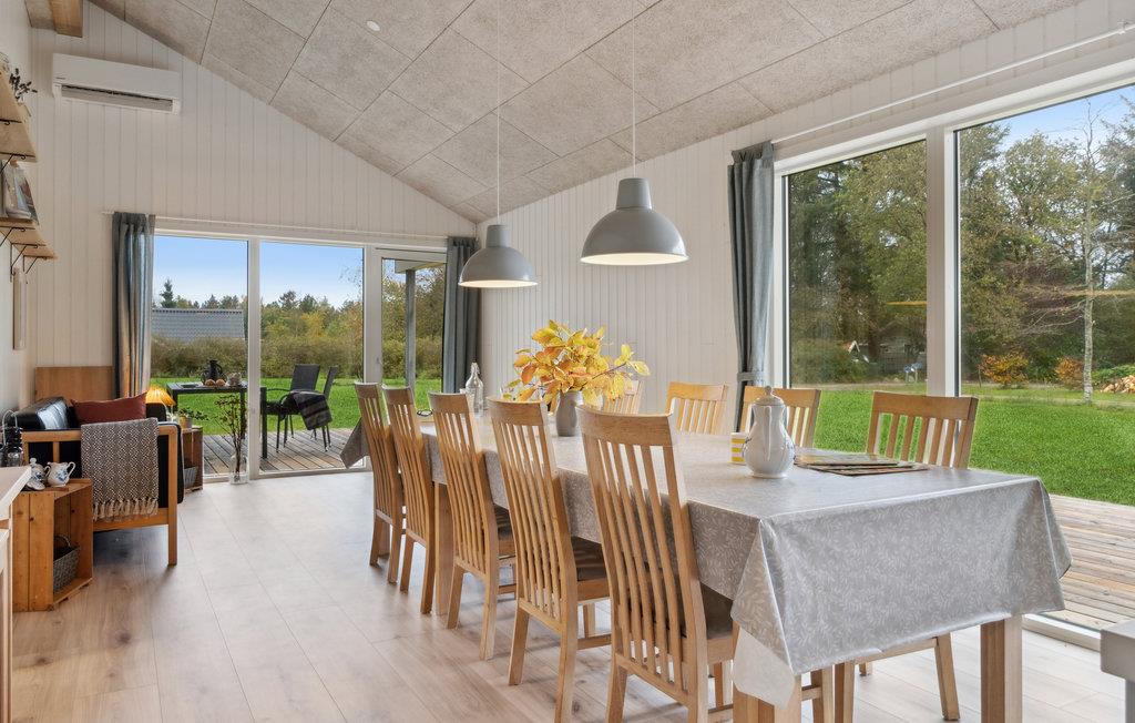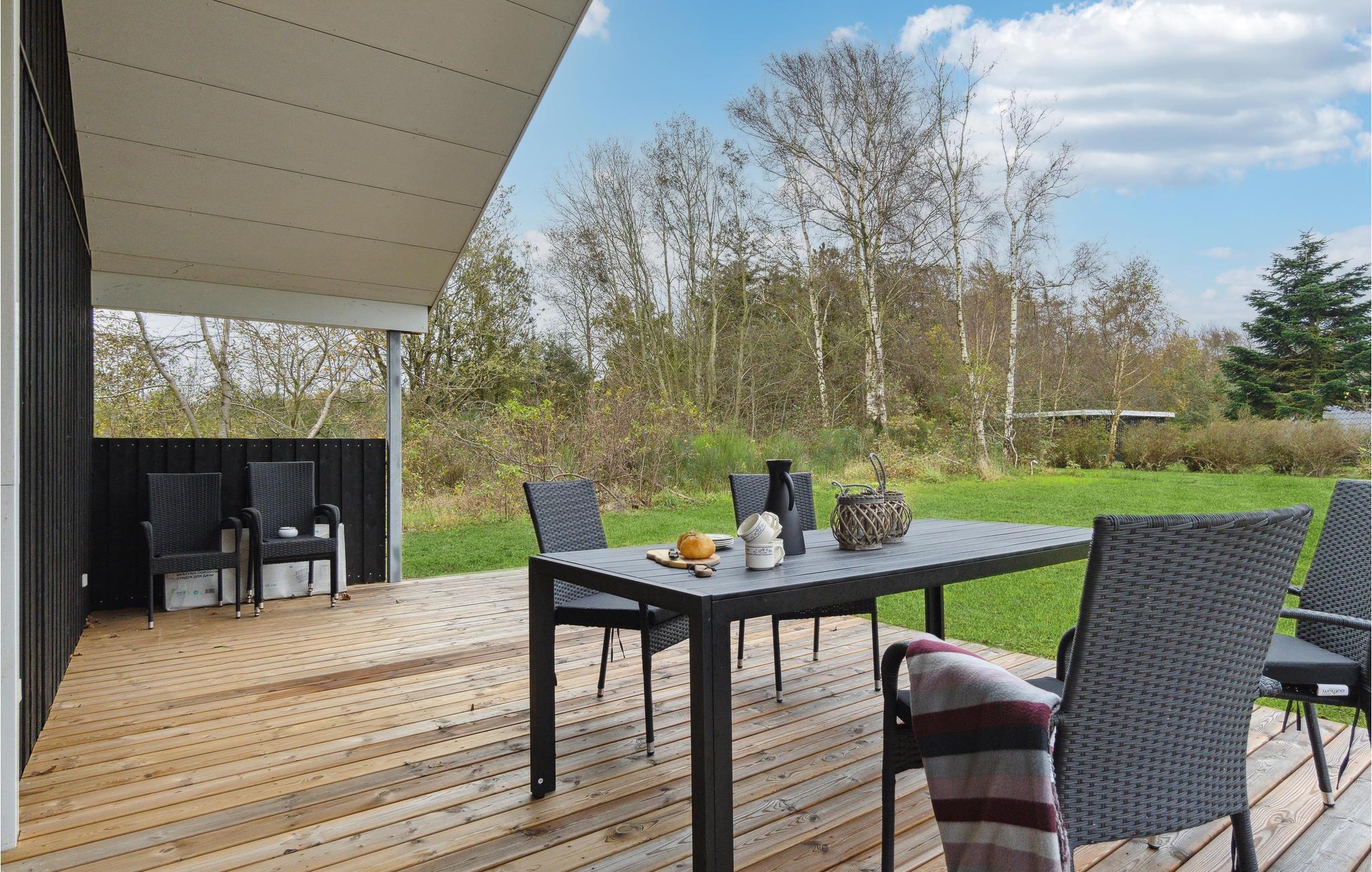 Velkommen til herligt ophold i Trend, hvor I kan holde ferie med den store familie eller jeres gode venner. Her bliver dette indbydende sommerhus jeres base. Vinduespartierne går fra gulv til loft og får fællesrummene til at smelte sammen med den grønne have, så den kan I nyde udsigten til i al slags vejr. Boligen er lyst, moderne og hyggeligt indrettet, hvilket giver jer gode rammer til at slappe af. Fyld dagene med brætspil ved spisebordet, rolige stunder i sofaen og fælles madlavningsprojekter i det åbne køkken.