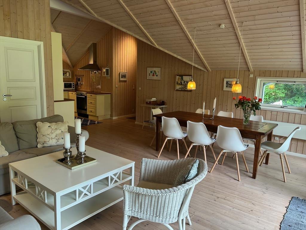 Du vil føle dig godt hjemme og godt tilpas i den hyggelige og smagfuldt indrettede stue med loft til kip, og du har flot panoramaudsigt til den store grund gennem terrassevinduerne. Hele familien kan samles ved spisebordet, og her kan I også samles om et godt familiespil som Matador/Monopoly, Sequence eller Yatzy.