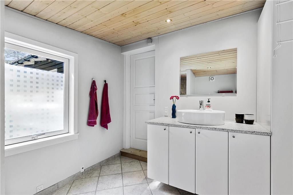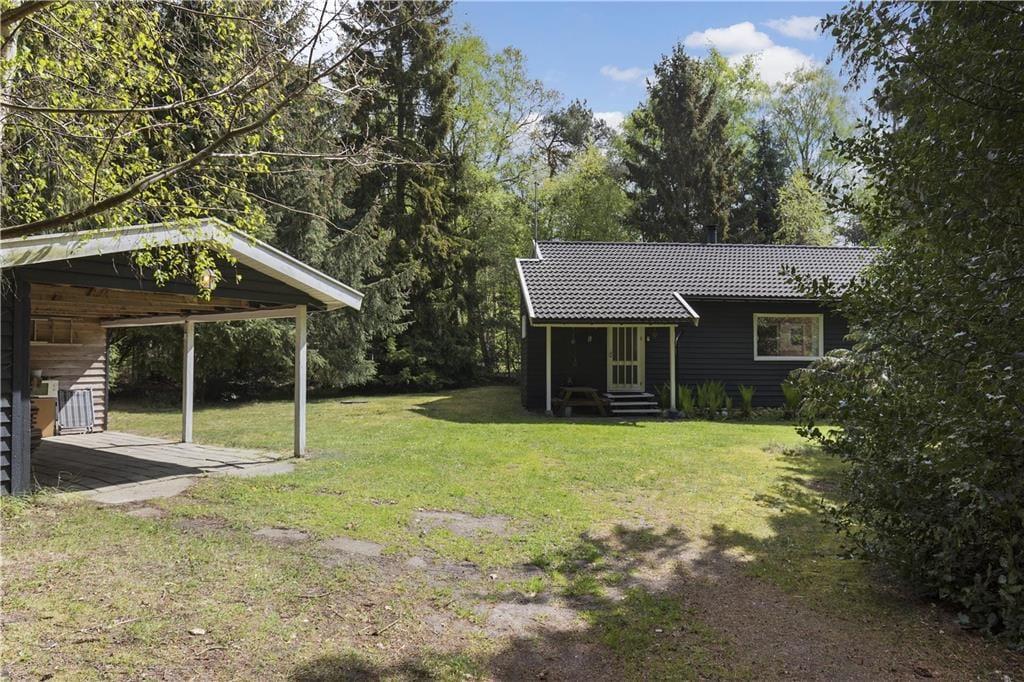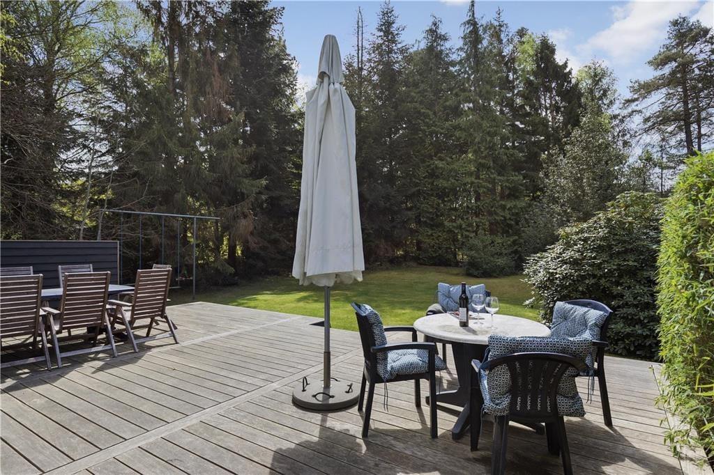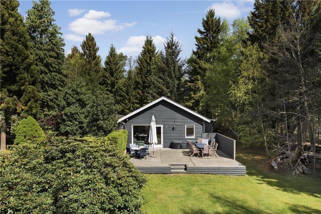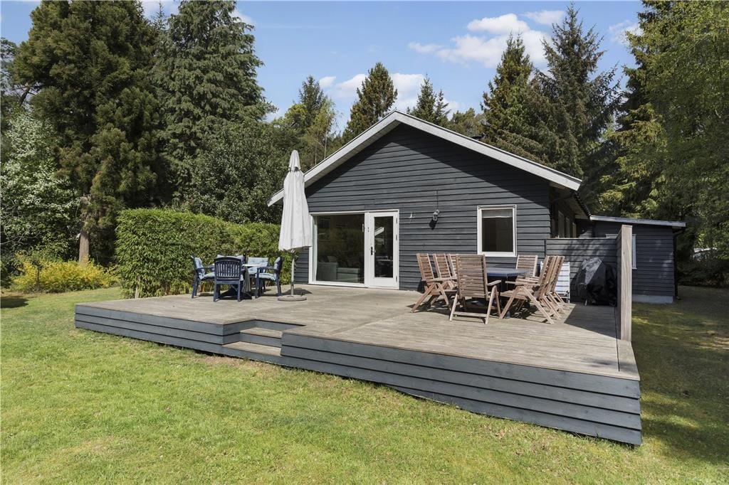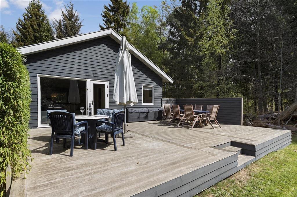 Terrassen har sol hele dagen og er stor nok til både børn og voksne. Den omgivende naturgrund er perfekt til både solbadning og leg. De høje træer på grunden skaber en følelse af privatliv, mens I stadig er tæt på lokale faciliteter.