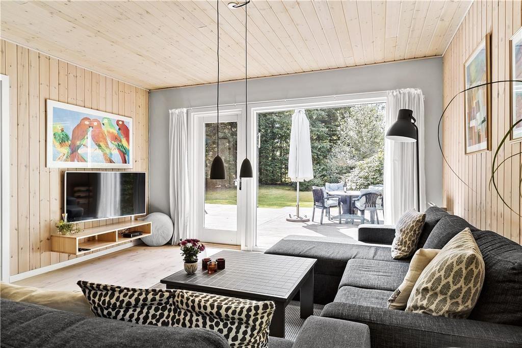 I den store hjørnesofa med chaiselong kan der nemt blive kamp om pladserne, for her har I panoramaudsigt til den på en gang åbne og lyse samt tæt bevoksede naturgrund, hvor råvildt og fugle ikke er sjældne gæster. Men bare rolig – der er plads til alle.