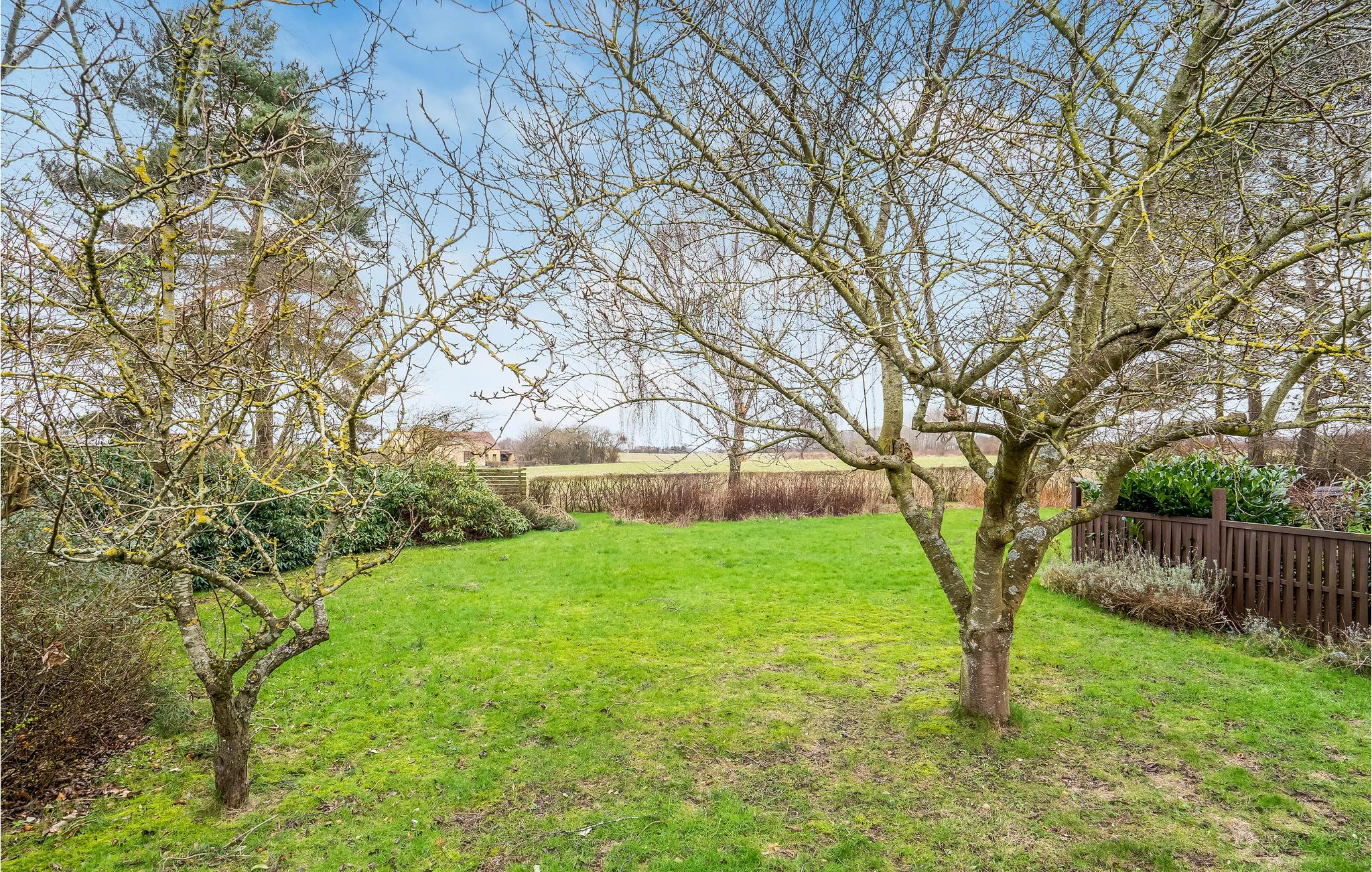 Hyggeligt feriehus i Tullebølle med dejlig have, udsigt over marker og plads til hunde i rolige omgivelser.