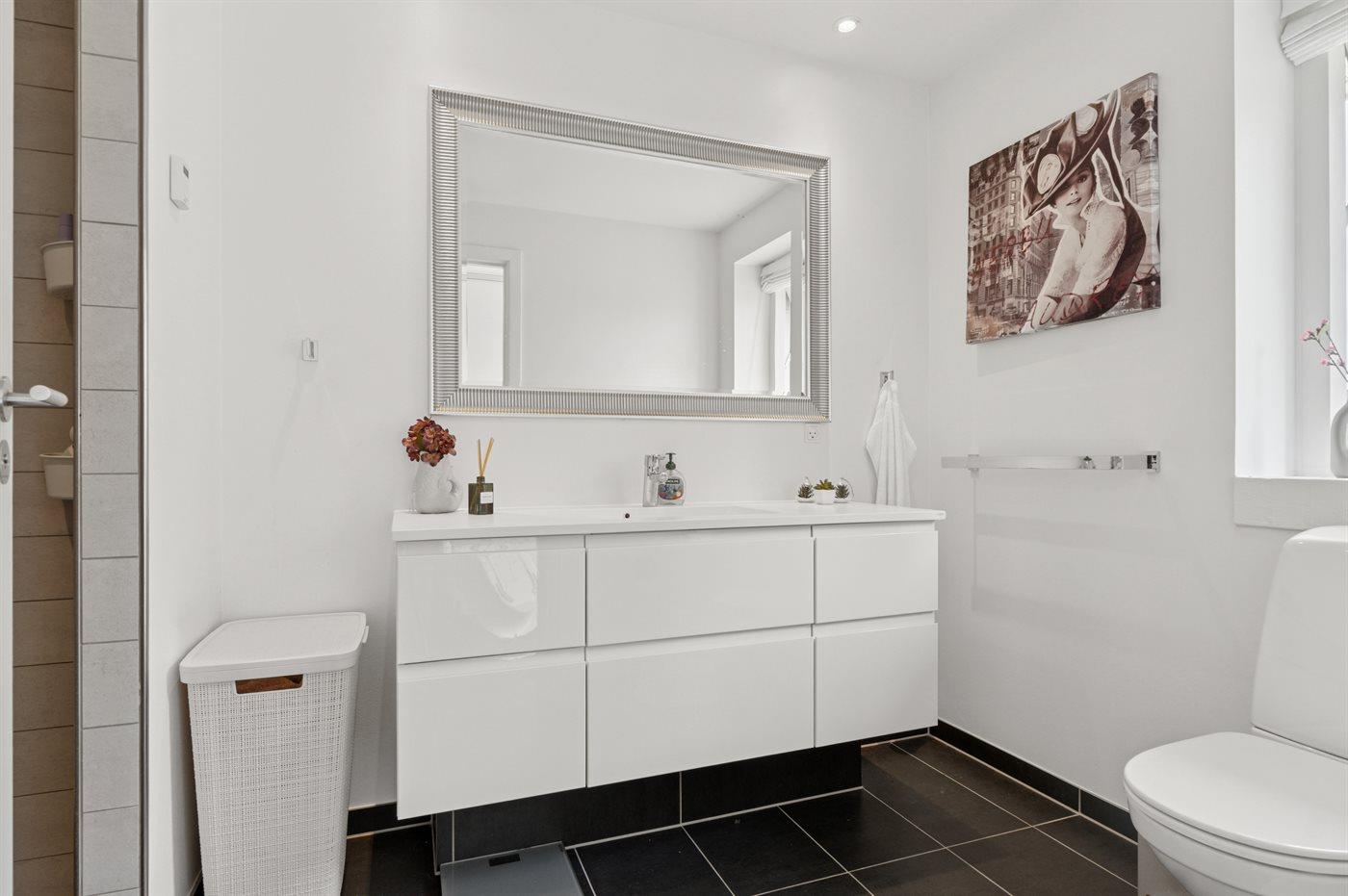 Der er 2 badeværelser med bruseniche og 2 toiletter. Der er gulvvarme på 2 badeværelser.