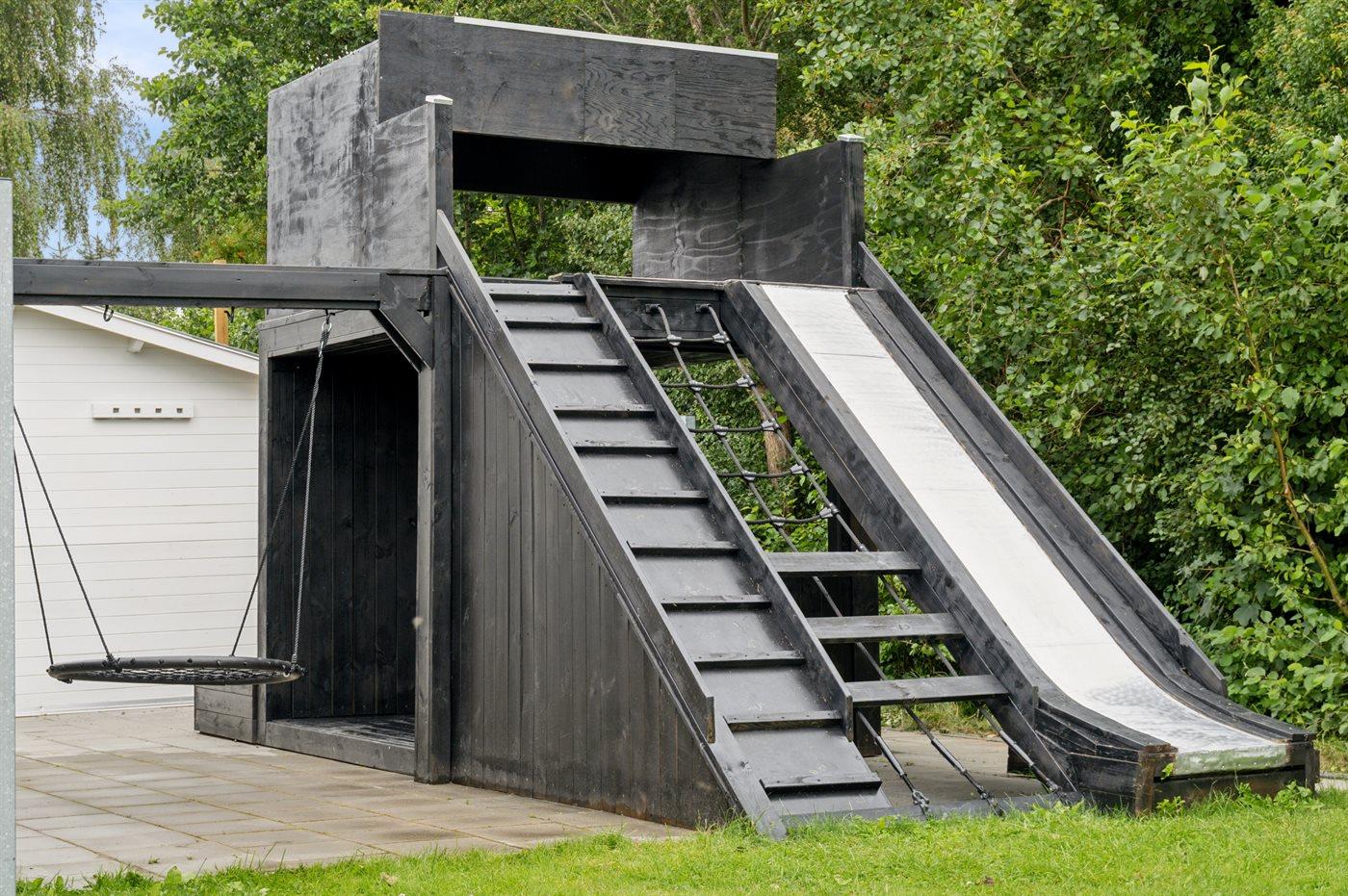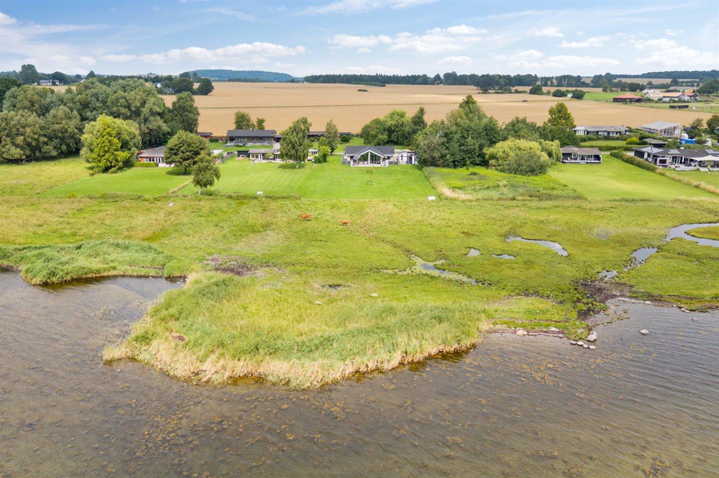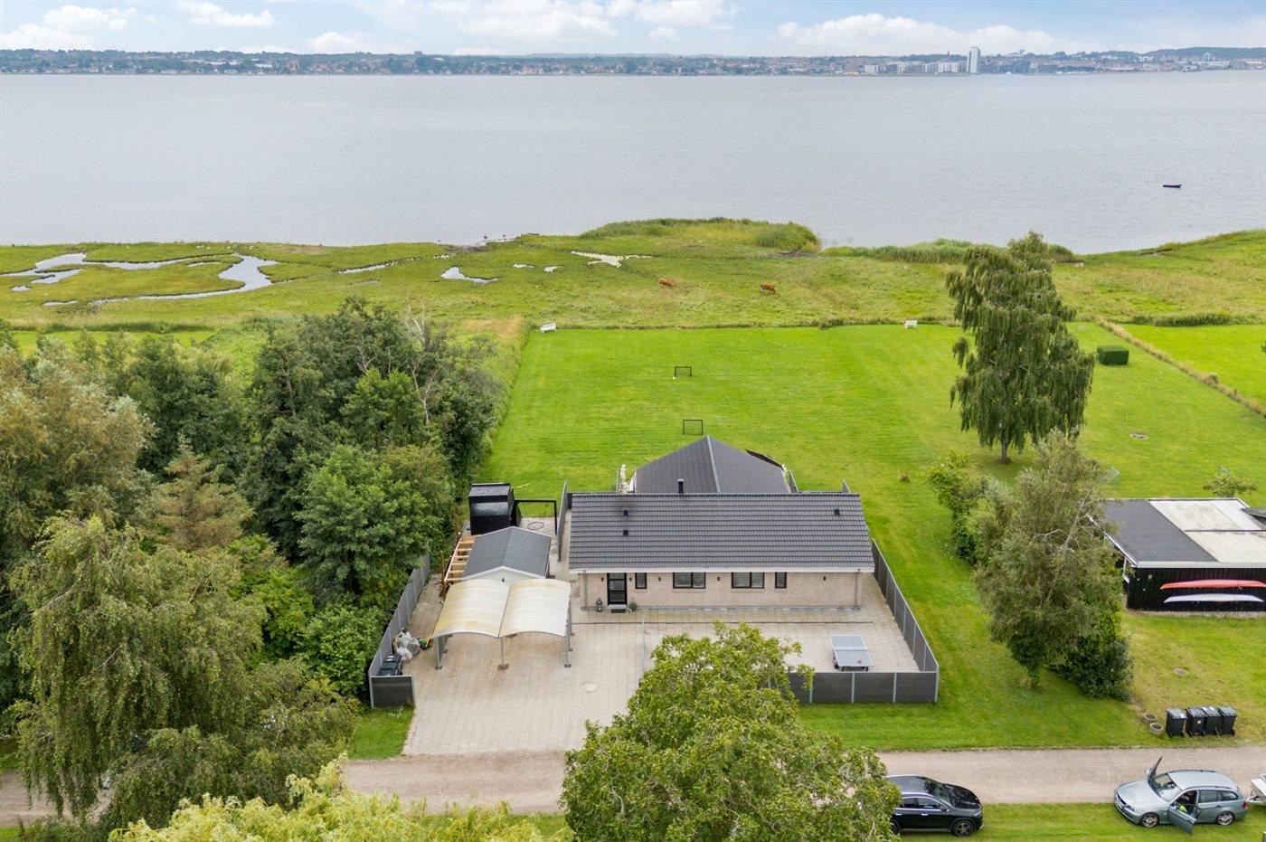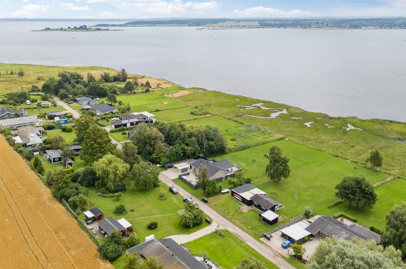 Ferieboligen er beliggende på en 22436 m² stor havegrund. Der er 50 m til fjorden. Nærmeste forretning er beliggende i en afstand af 2600 m. Til ferieboligen hører 300 m² terrasseareal. Desuden er der 19 m² overdækket terrasse. Der er redskabsrum. Sandkasse. Legetårn. Rutchebane. Grill til rådighed. Der er carport til rådighed. Der er installeret stik til opladning af elbil. Type 2 stik. Parkering ved ferieboligen.