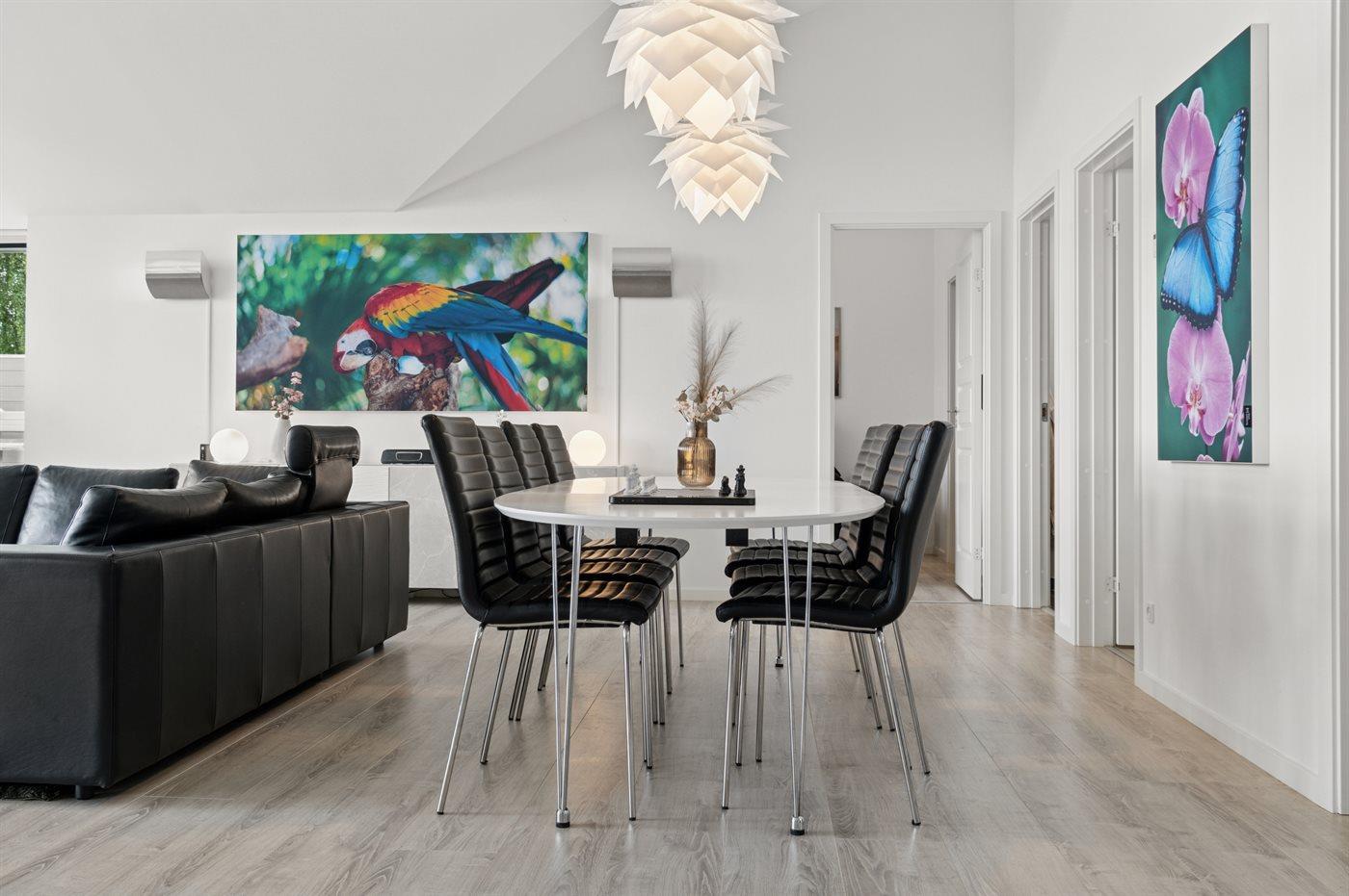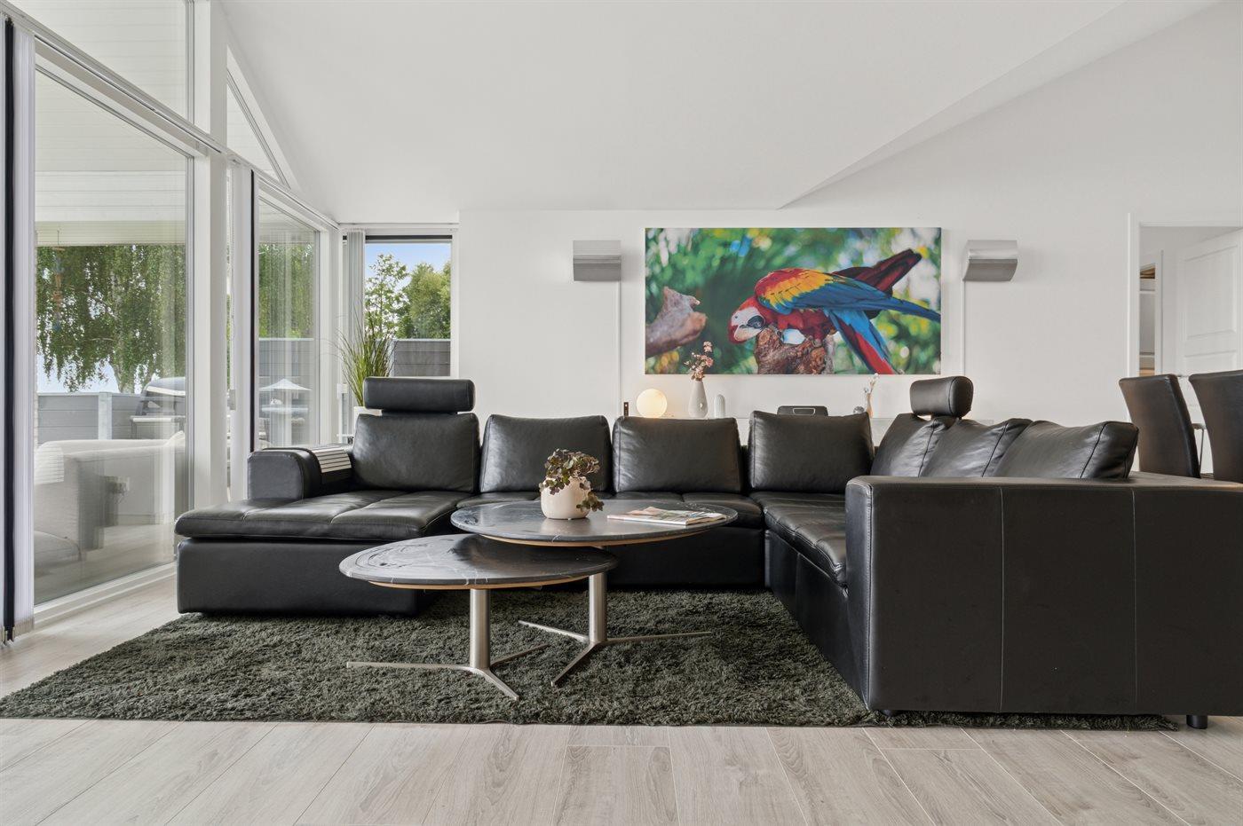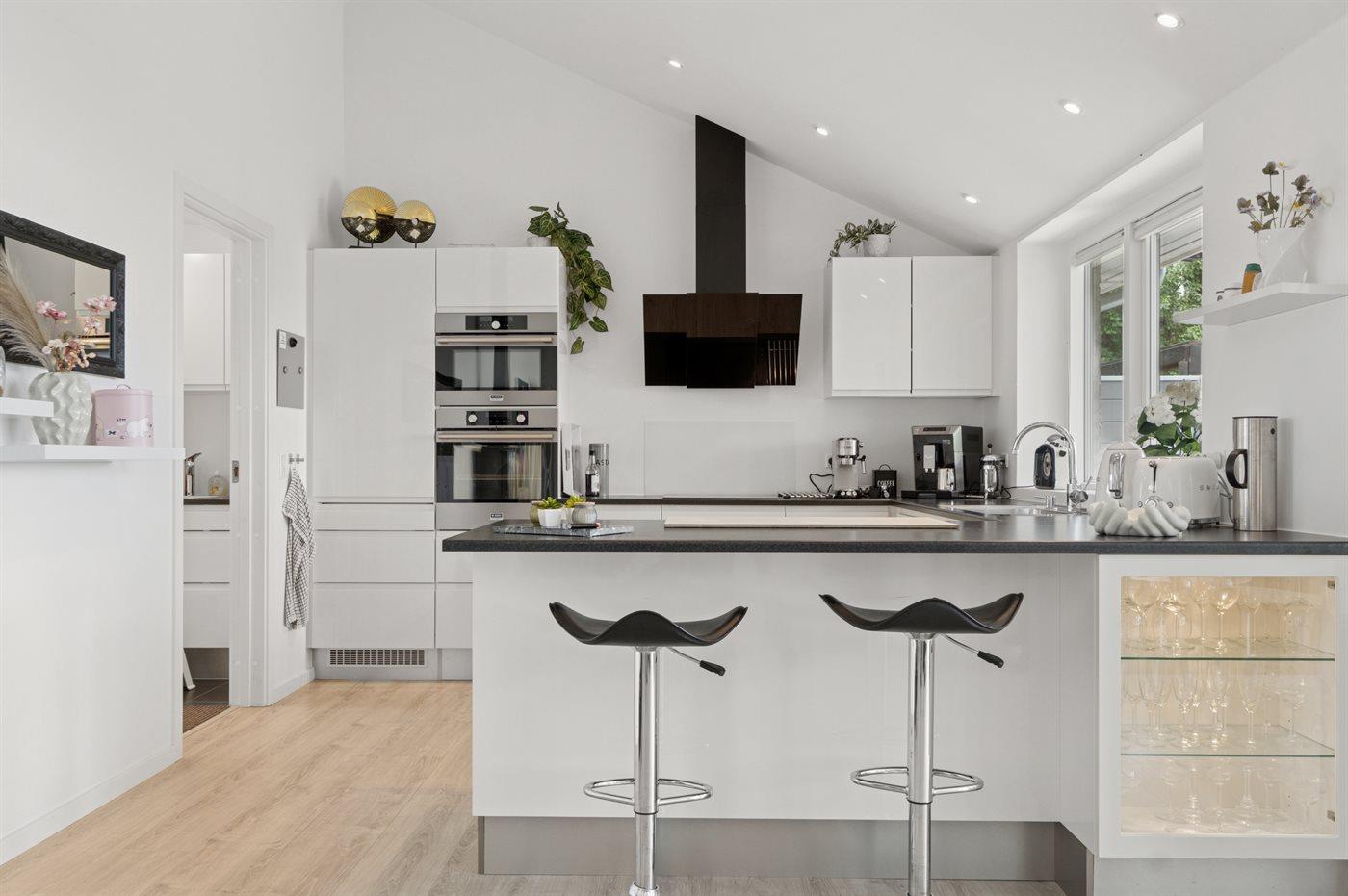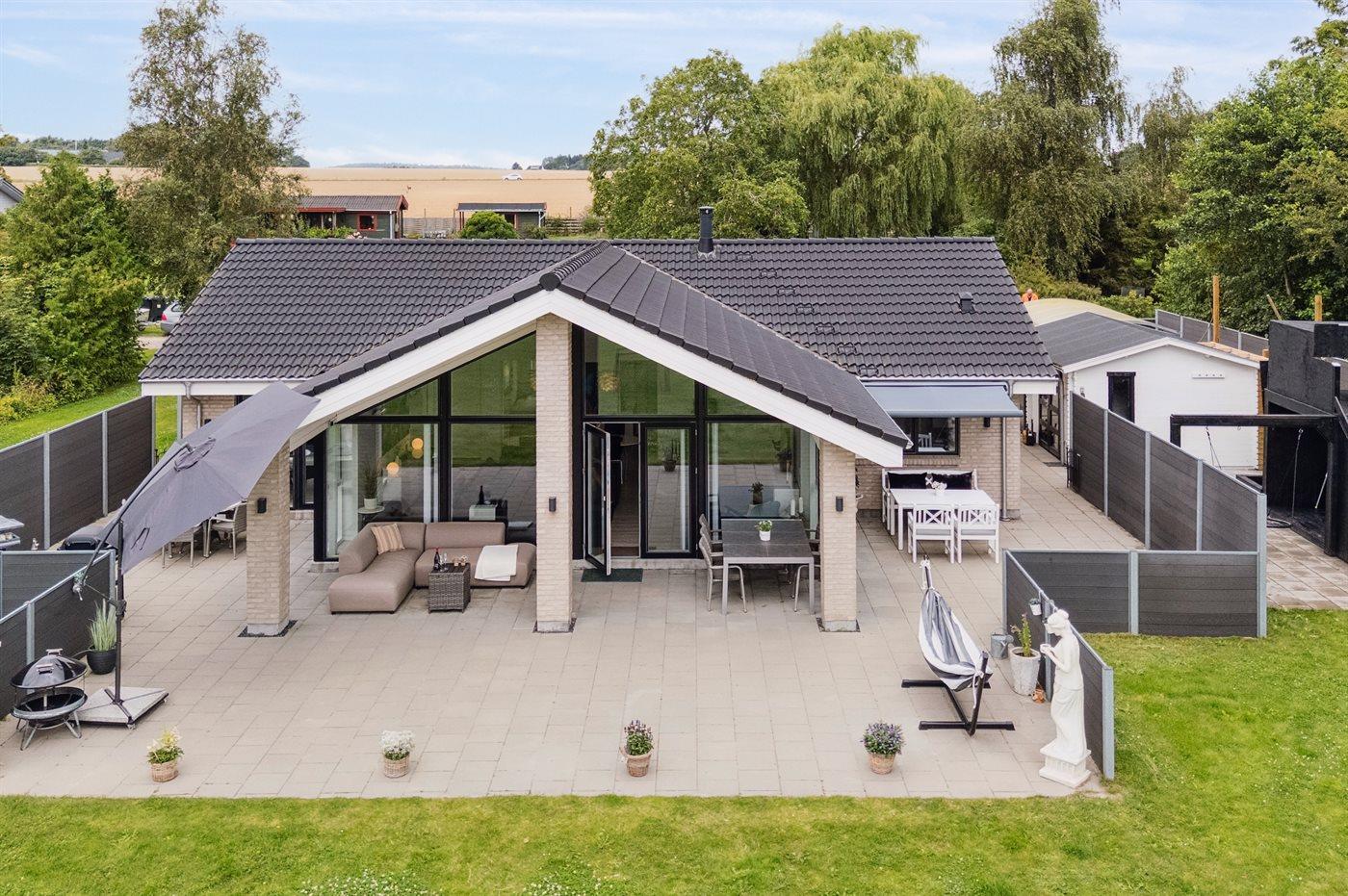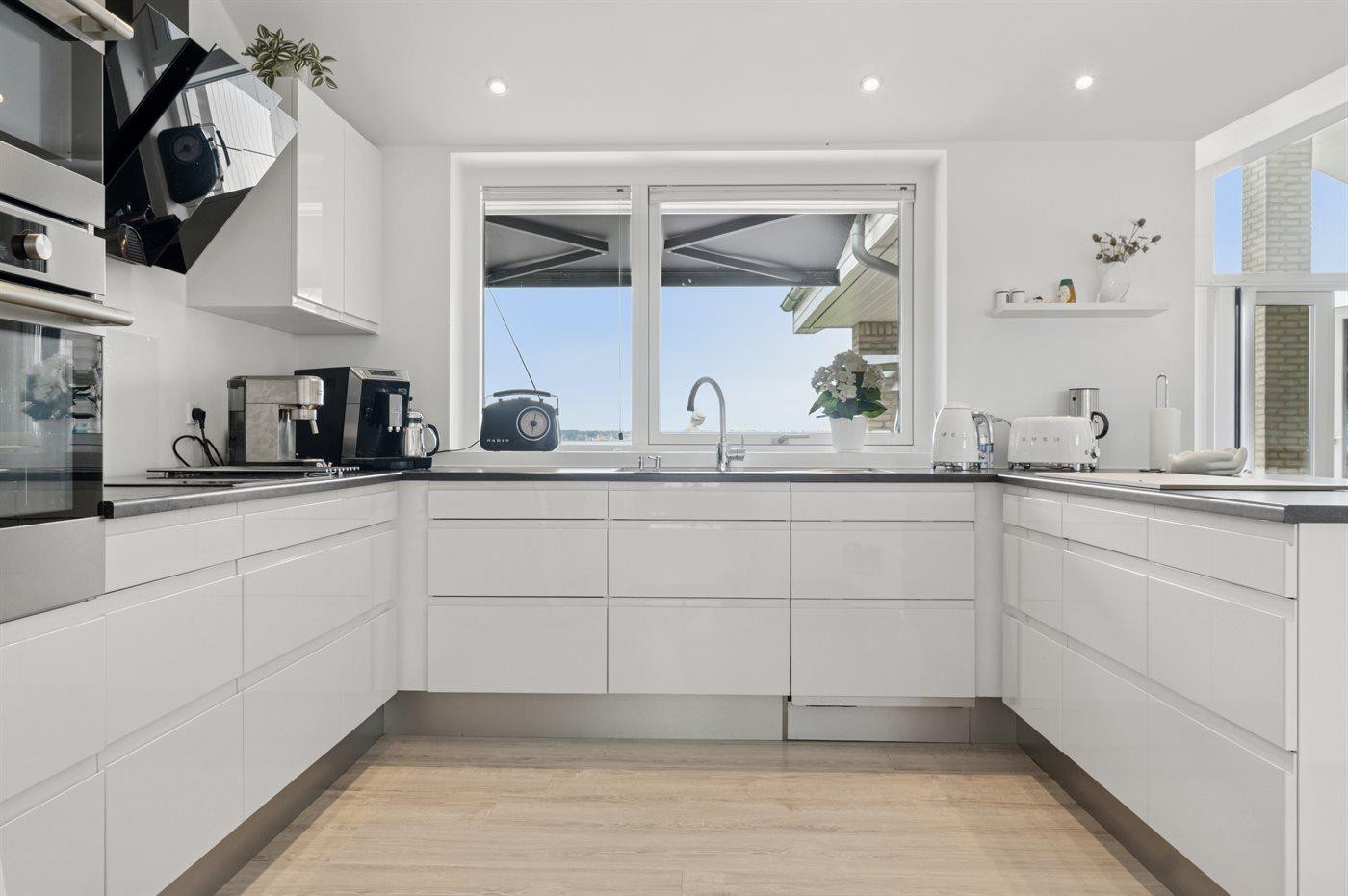 Det imponerende køkkenalrum med et stort praktisk køkken, som ligger i forbindelse med stuen udgør det naturlige samlingssted for hygge og samvær med venner og familie. Herfra er udgang til et stort sydvendt terrasseområde med en overdækket del. Der findes brændeovn til de hyggelige stunder.