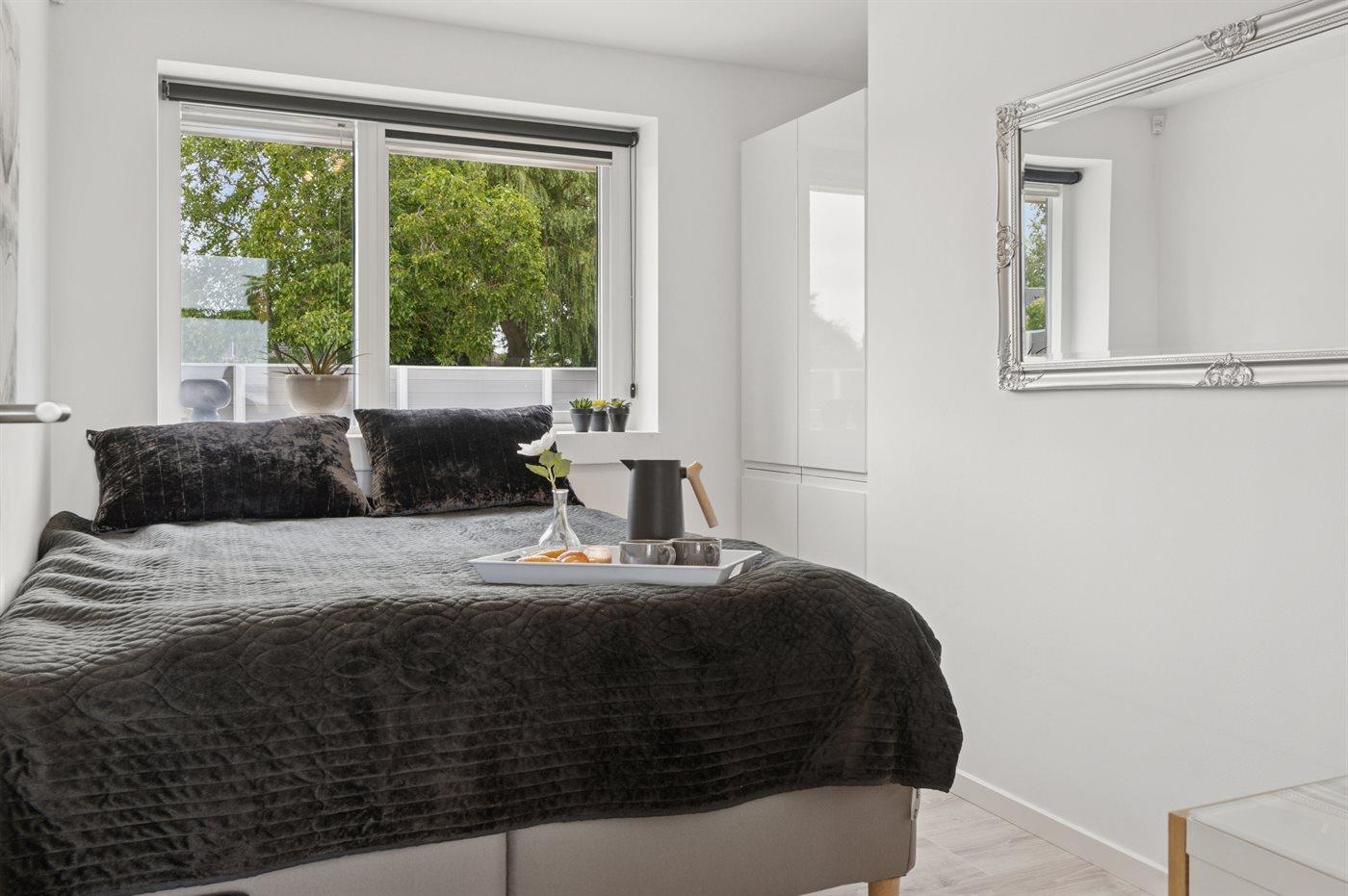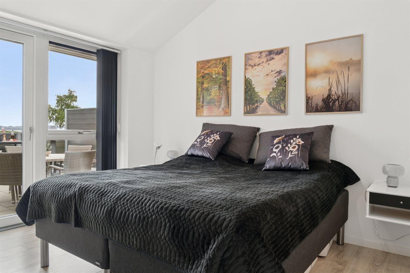 Der er 3 soveværelser med dobbeltsenge. Fra det ene af soveværelserne er der udsigt og udgang til terrassen. Der er 2 badeværelser, som begge er med bruseniche og gulvvarme. I det praktiske bryggers er der vaskemaskine og tørretumbler.
