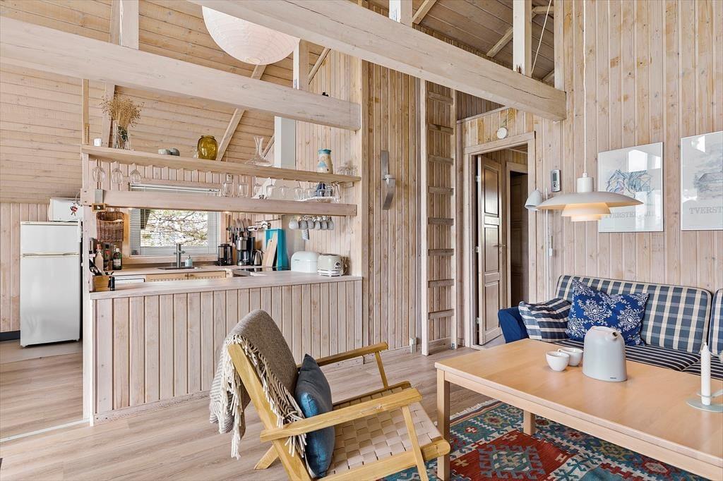 Indenfor byder sommerhuset på en lys og venlig indretning, der med loft til kip og et stort vinduesparti inviterer sollyset helt ind i stuen. Her kan I samles om hyggelige måltider ved spisebordet eller synke ned i sofaen til en rolig aften, mens naturens farver og årstidens skift spiller med i baggrunden. Det åbne køkken giver en god fornemmelse af samvær, så I kan tale sammen, mens maden tilberedes. Et ekstra plus er det tilhørende anneks, hvor der både er dobbeltseng, eget bad og wc – perfekt til dem, der ønsker lidt privatliv, men stadig være tæt på fællesskabet.