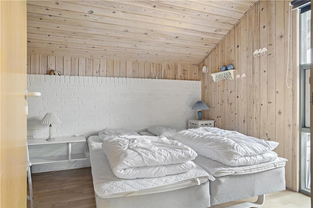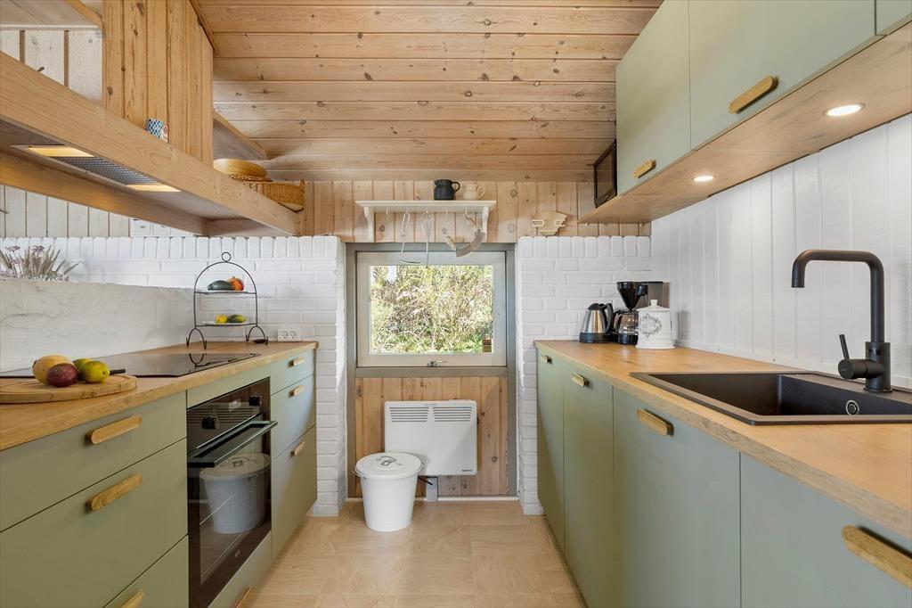 Træd indenfor i dette charmerende sommerhus, hvor du straks mærker en indbydende og lys atmosfære. De store vinduespartier i stuen lukker naturen ind og giver et smukt kig ud over det omkringliggende landskab. Indretningen er enkel og hyggelig med en åben forbindelse mellem køkken og stue, så familien kan være sammen, uanset om der laves mad eller slappes af med en god bog i sofaen. Her er plads til både ro og samvær, og huset er ideelt til dig, der ønsker en ferie væk fra hverdagens stress og jag.