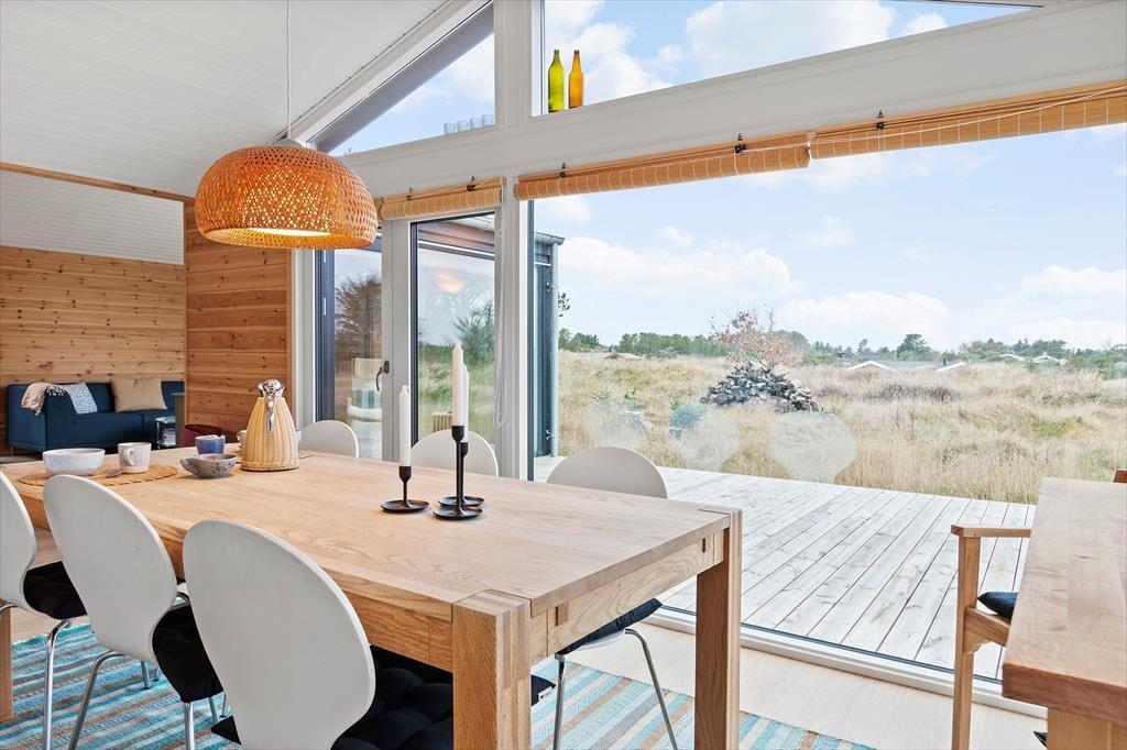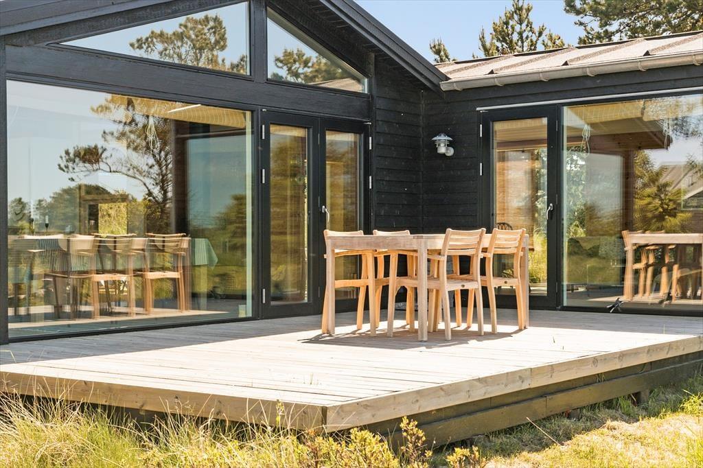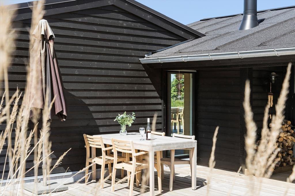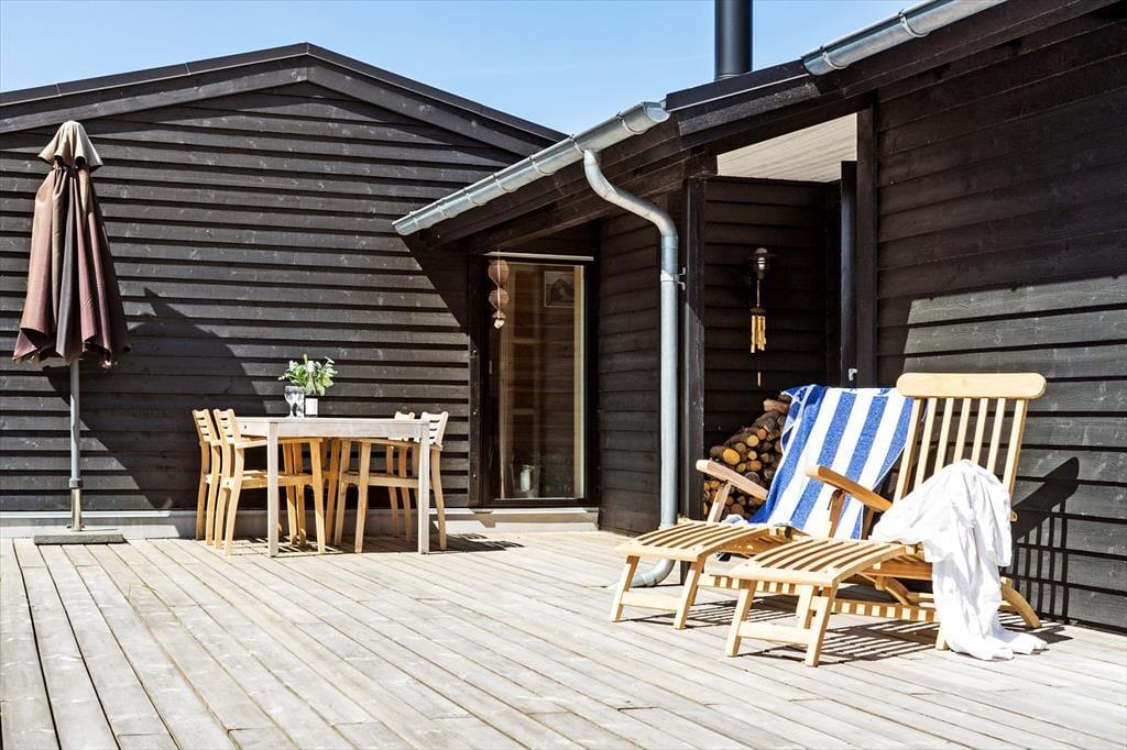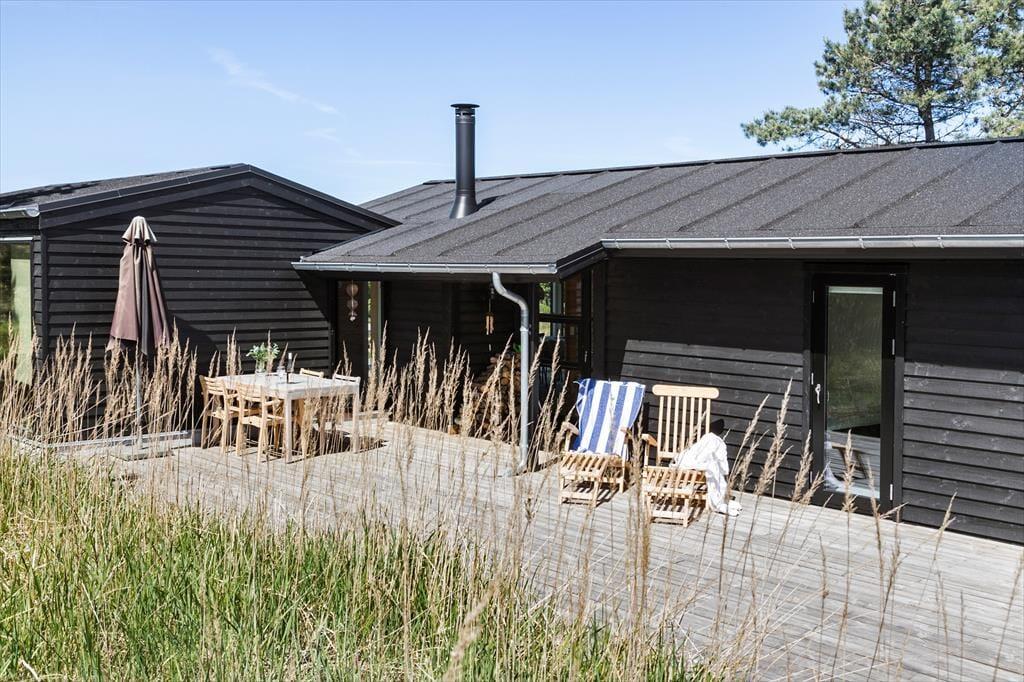 Sommerhusets skønne indre rammer bliver flot akkompagneret af et lækkert terrassemiljø i det fri. Der er tre gode opholdsområder at vælge imellem, når I vil sole jer eller slappe af i parasollens skygge, og om aftenen kan I grille, mens solen farver himlen over Tversted i orangerøde nuancer. Udsigten over husets egen naturgrund og videre ud over det åbne landskab er betagende, og hen over klitterne kan I nyde udsigten til Vesterhavet.