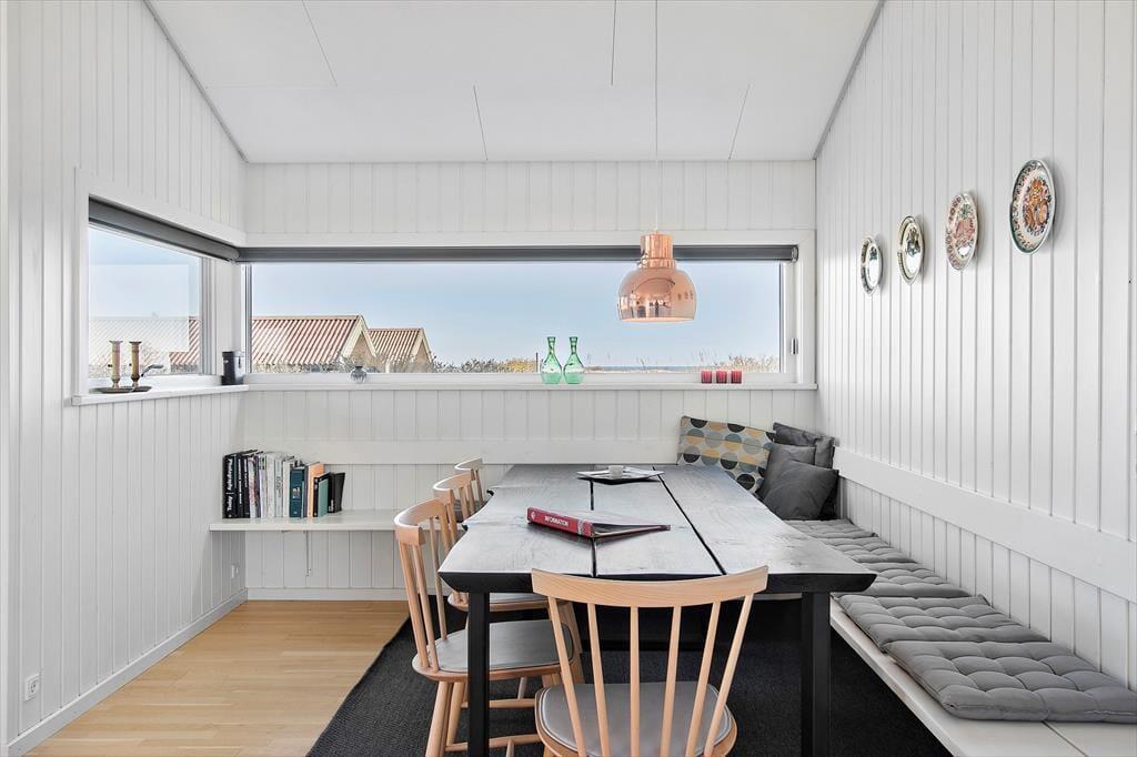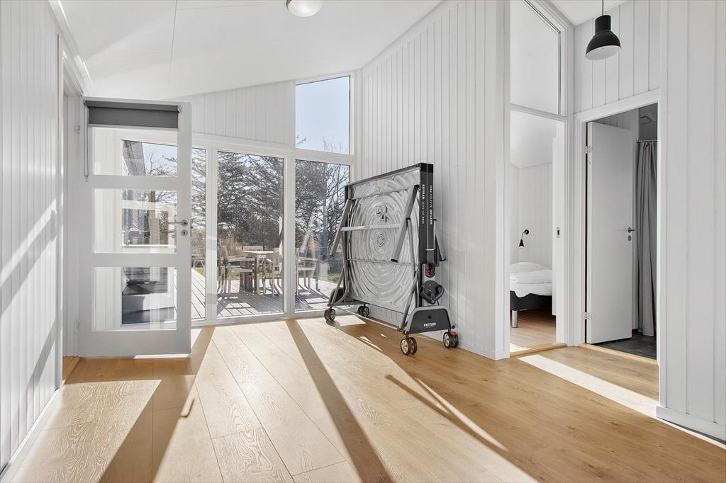 Når du træder ind i sommerhuset, mødes du af et lyst og indbydende hjem, hvor loft til kip og store vinduer skaber en behagelig og rummelig atmosfære. Den hyggelige stue indbyder til afslapning foran fjernsynet eller med en god bog, mens brændeovnen spreder varme på kølige aftener. Det åbne køkken gør det nemt at tilberede lækre måltider, samtidig med at du kan være en del af samtalerne i stuen. Sommerhusets indretning balancerer på smukkeste vis mellem det funktionelle og det hyggelige, så du straks føler dig hjemme.