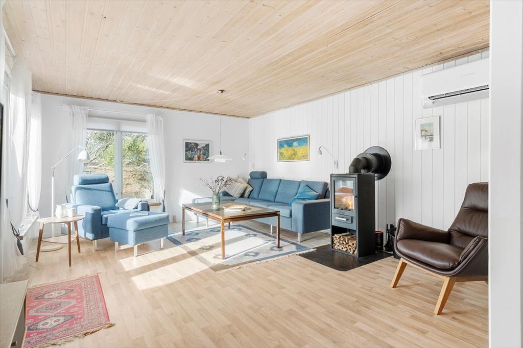 Huset ligger på en dejlig naturgrund, hvor du kan nyde den friske havluft og lade skuldrene falde ned. Terrassen giver dig mulighed for at starte dagen med en kop kaffe i morgensolen eller afslutte dagen med en lækker grillmiddag under den lyse aftenhimmel. Her er der gode havemøbler, så du kan læne dig tilbage og bare nyde roen omkring dig. Den naturskønne grund skaber en dejlig ramme om udelivet, hvor både store og små kan slappe af og lege. Hvis du medbringer din hund, vil den elske at snuse rundt på grunden og gå på opdagelse i det omgivende landskab. Og når de køligere aftener melder sig, kan du trække indenfor og lune dig ved brændeovnen eller lade varmepumpen skabe en behagelig temperatur.