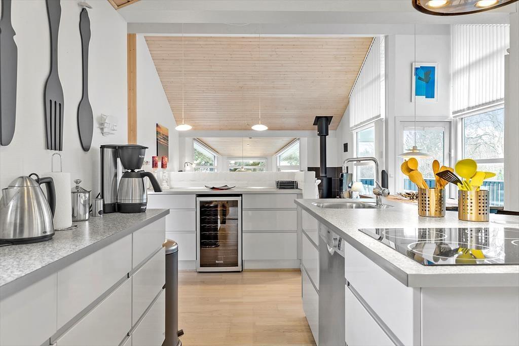 Når du træder indenfor, mødes du af et lyst og moderne interiør, der emmer af ro og hygge. Stuen og køkkenet ligger i åben forbindelse, hvilket skaber et dejligt rummeligt miljø, der er perfekt til at samles. Det lyse køkken er praktisk indrettet, så du nemt kan tilberede lækre feriemåltider, mens du samtidig kan følge med i samtalerne eller nyde udsigten til den omkringliggende natur. I stuen sørger pille ovnen for en ekstra hyggelig atmosfære, især når vejret byder på en kølig brise fra havet. De to badeværelser giver god plads til, at alle kan få deres egen ro, og en dejlig sauna venter på dig efter en lang dag med leg på stranden eller en cykeltur gennem de nærliggende klitter.