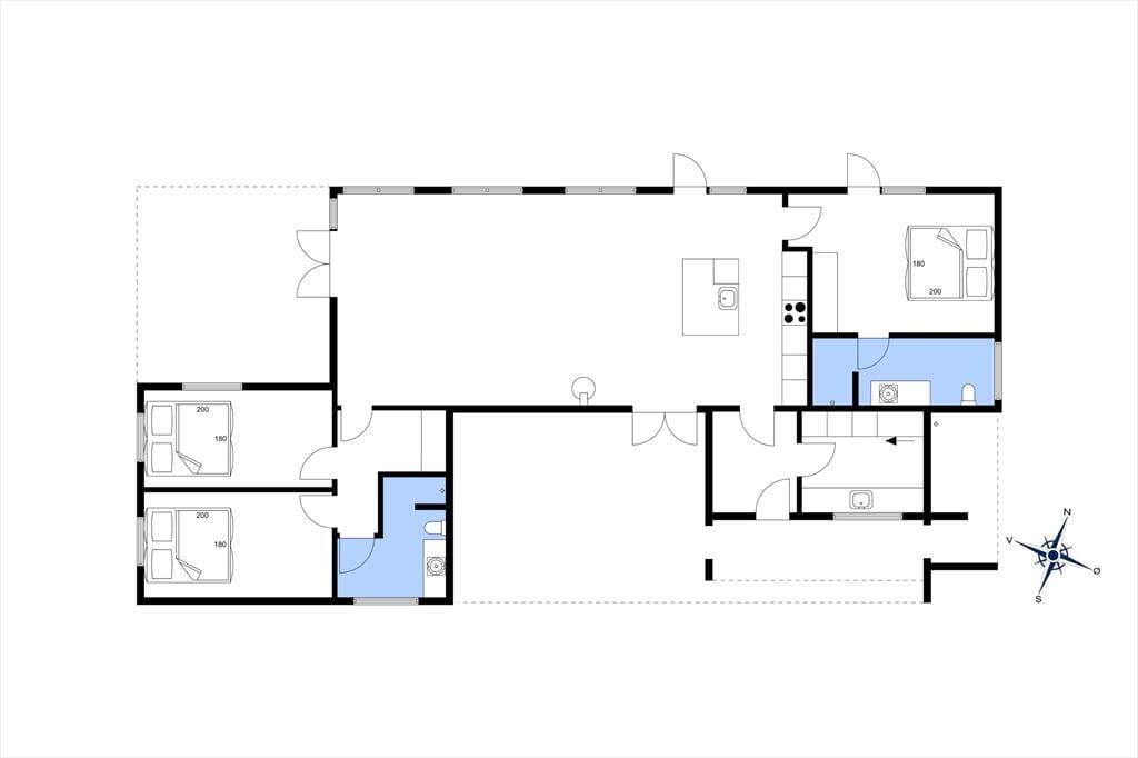 Når du træder indenfor i dette sommerhus, bliver du straks mødt af en lys og stilren indretning, hvor store panoramavinduer trækker naturen helt tæt på. Stuen med sin behagelige hjørnesofa og brændeovn indbyder til hyggelige stunder med familien – måske med en god bog eller en spændende film på fladskærms-tv’et. Det moderne køkken er fuldt udstyret og har både quooker og vinkøleskab, så du kan forkæle dine gæster med kulinariske oplevelser. De tre rummelige soveværelser tilbyder bløde senge, hvor du kan vågne op til lyden af bølgerne og synet af havets blå horisont. To stilfulde badeværelser gør det nemt at finde plads til hele familien, selv i feriens travleste morgener.