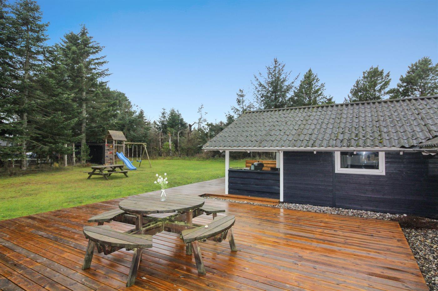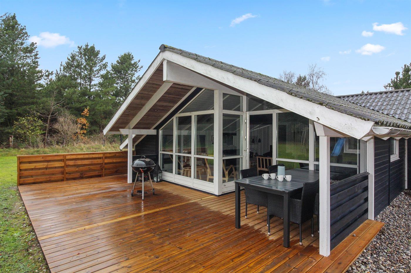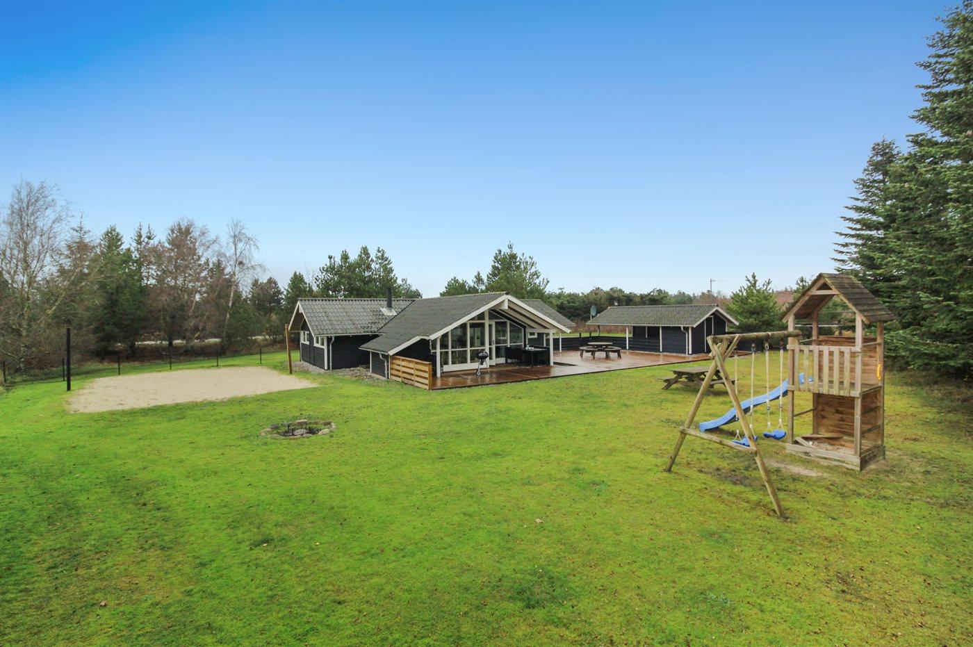 Ferieboligen er beliggende på en 1841 m² stor naturgrund. Grunden er indhegnet. Der er 1300 m til havet. Nærmeste forretning er beliggende i en afstand af 800 m. Til ferieboligen hører åbent terrasseareal. Desuden er der overdækket terrasse. Der er redskabsrum. Gynge. Sandkasse. Rutchebane. Beachvolley. Gasgrill står til rådighed. Der er carport til rådighed. Der er installeret stik til opladning af elbil. Parkering ved ferieboligen.
