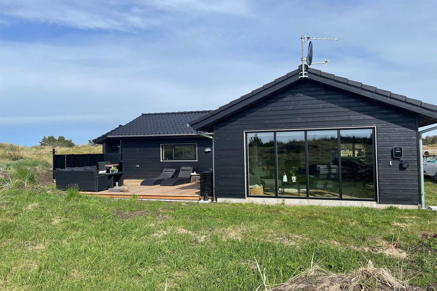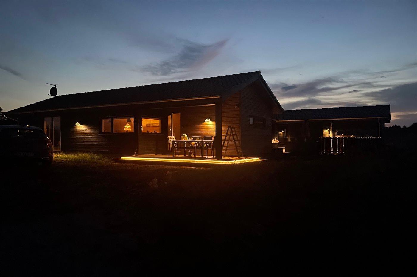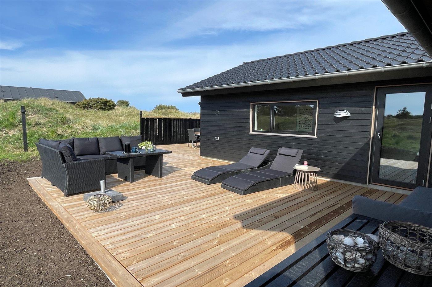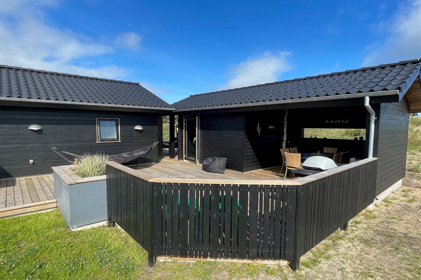 Ferieboligen er beliggende på en 6500 m² stor naturgrund. Der er 1200 m til havet. Der er en sø i en afstand af 3000 m. Nærmeste forretning er beliggende i en afstand af 1500 m. Til ferieboligen hører åbent terrasseareal. Desuden er der overdækket terrasse. Udendørs bruser. Gasgrill står til rådighed. Der er installeret stik til opladning af elbil. Type 2 stik. Med 11 kW ladeeffekt. Parkering ved ferieboligen.