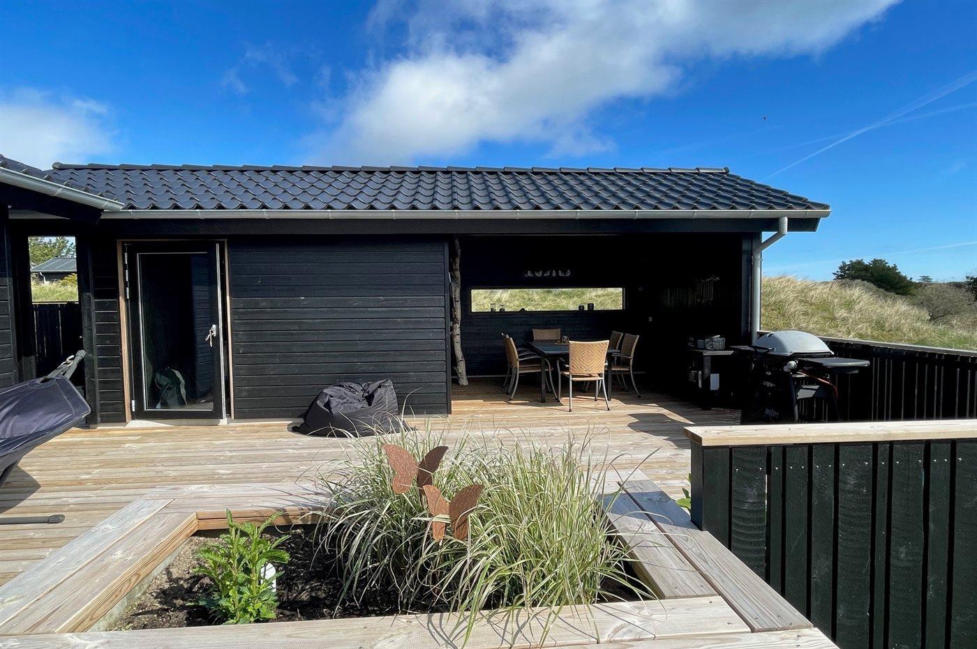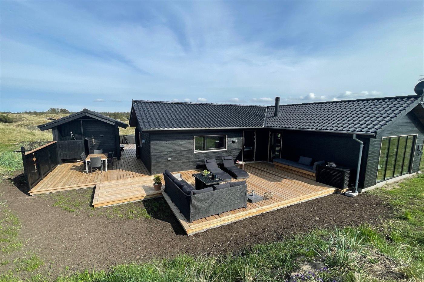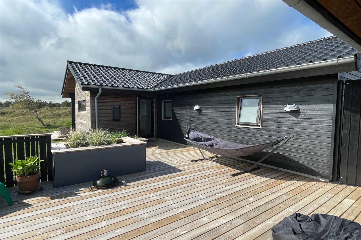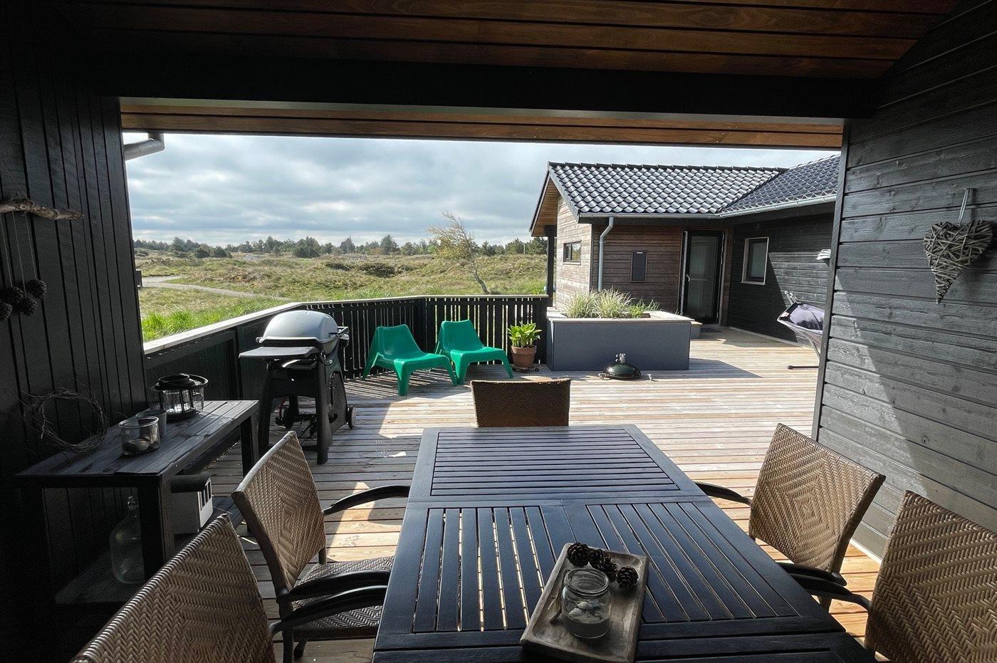Ferieboligen er beliggende på en 6500 m² stor naturgrund. Der er 1200 m til havet. Der er en sø i en afstand af 3000 m. Nærmeste forretning er beliggende i en afstand af 1500 m. Til ferieboligen hører åbent terrasseareal. Desuden er der overdækket terrasse. Udendørs bruser. Gasgrill står til rådighed. Der er installeret stik til opladning af elbil. Type 2 stik. Med 11 kW ladeeffekt. Parkering ved ferieboligen.