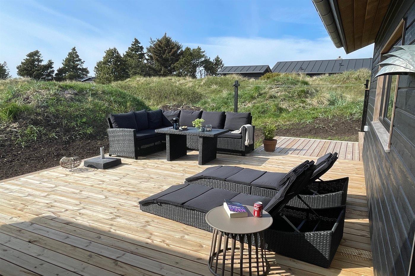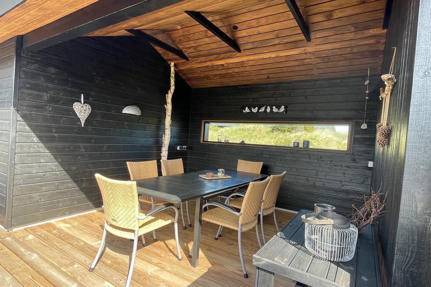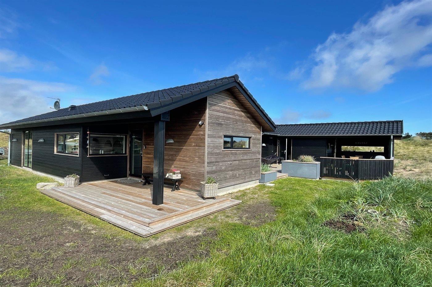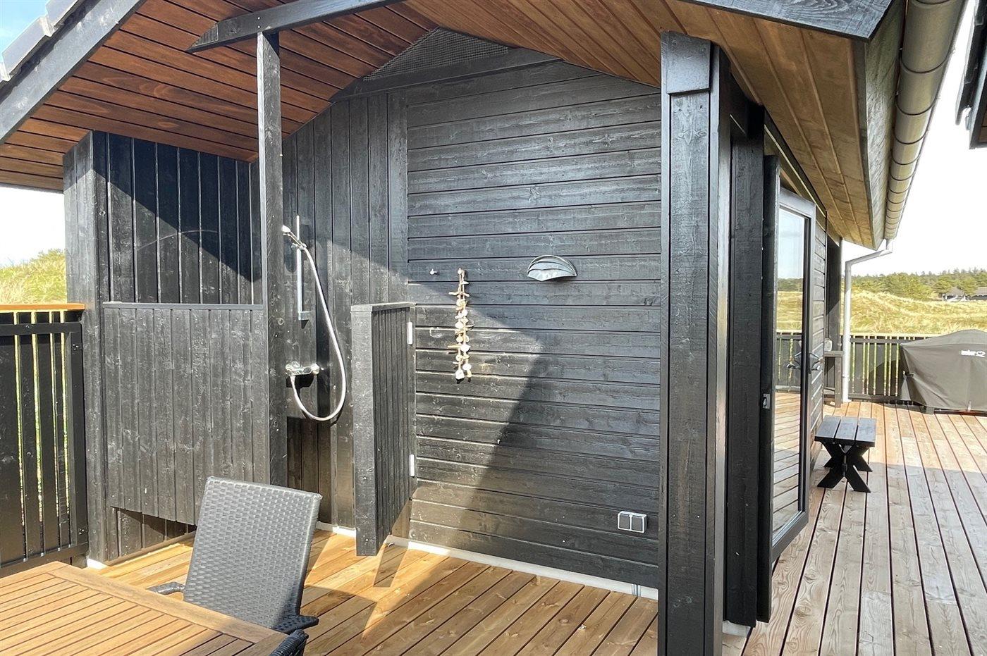 Ferieboligen er beliggende på en 6500 m² stor naturgrund. Der er 1200 m til havet. Der er en sø i en afstand af 3000 m. Nærmeste forretning er beliggende i en afstand af 1500 m. Til ferieboligen hører åbent terrasseareal. Desuden er der overdækket terrasse. Udendørs bruser. Gasgrill står til rådighed. Der er installeret stik til opladning af elbil. Type 2 stik. Med 11 kW ladeeffekt. Parkering ved ferieboligen.