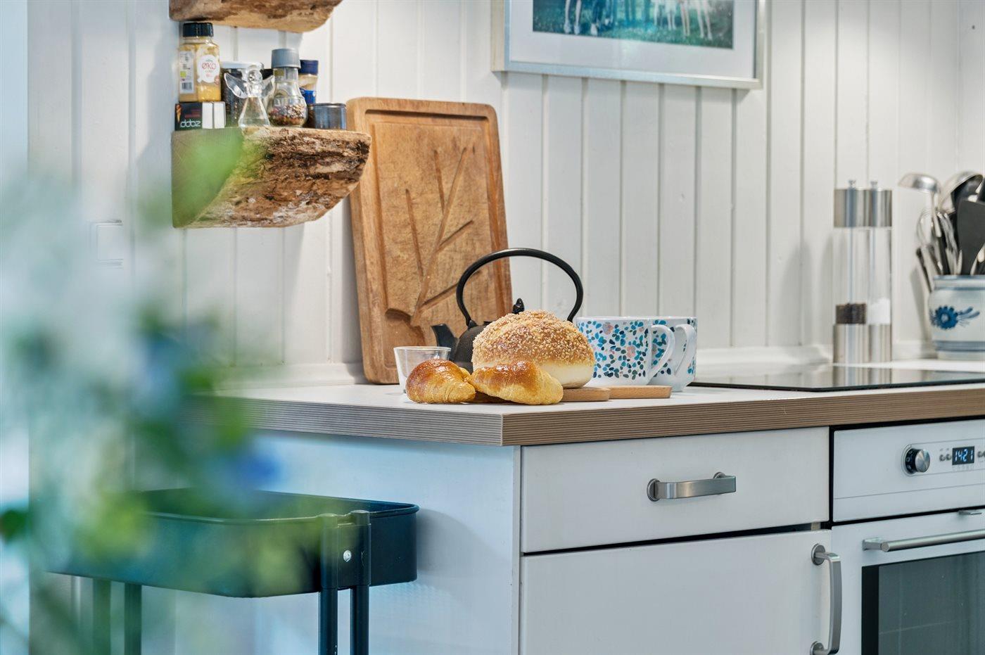Køkkenet er udstyret med 1 køleskab. Der er 4 keramiske kogeplader, varmluftovn, mikrobølgeovn samt opvaskemaskine.