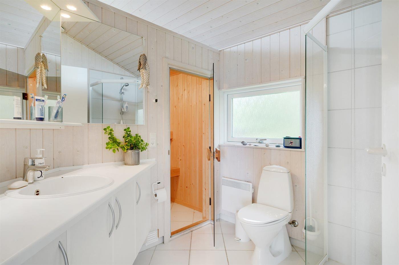 Der er 1 badeværelse med bruseniche og 1 toilet.. Der er gulvvarme på 1 badeværelse. I saunaen er der mulighed for afslapning.