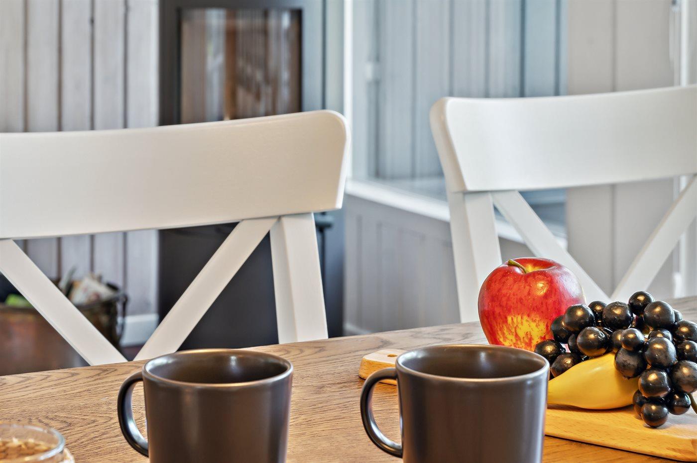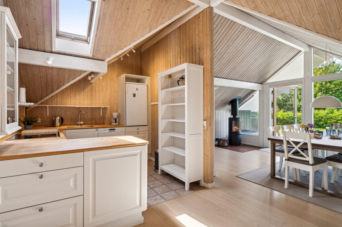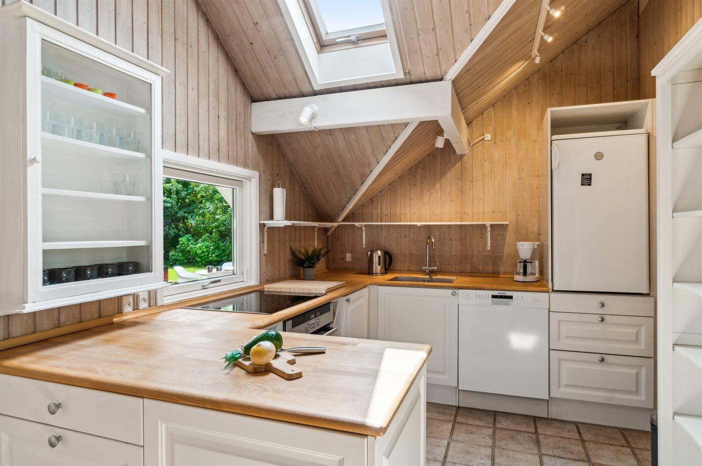 Køkkenet er udstyret med 1 køleskab. Der er 4 induktionskogeplader, varmluftovn, mikrobølgeovn samt opvaskemaskine.