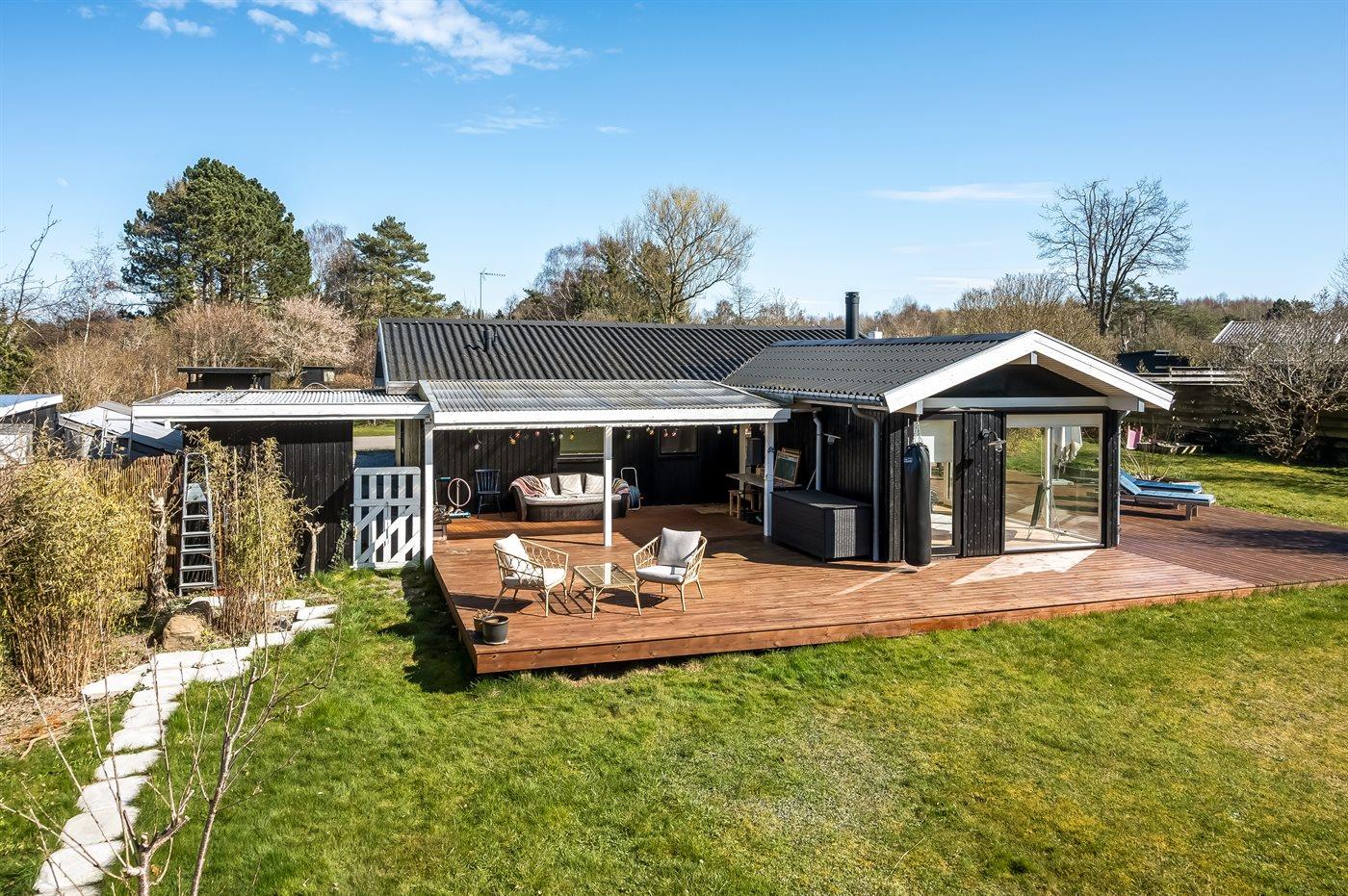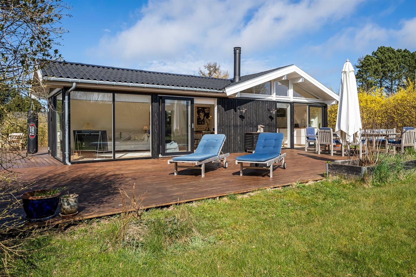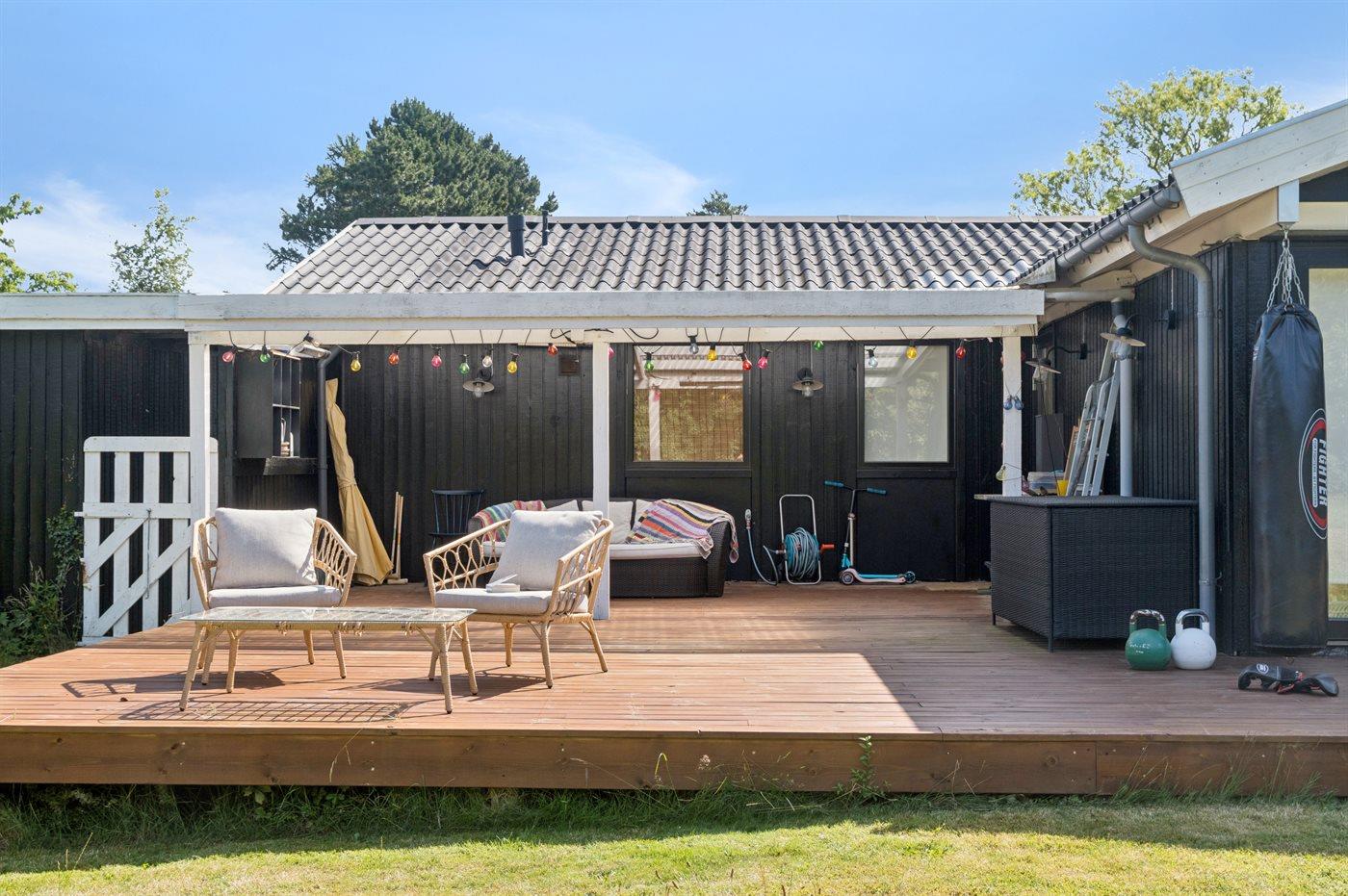 Dejligt sommerhus med plads til afslapning og hygge. Stort køkken-alrum med masser af lys og luft. Udsigt og adgang til haven – og den overdækkede terrasse. Tre soveværelser. Et dejligt badeværelse.