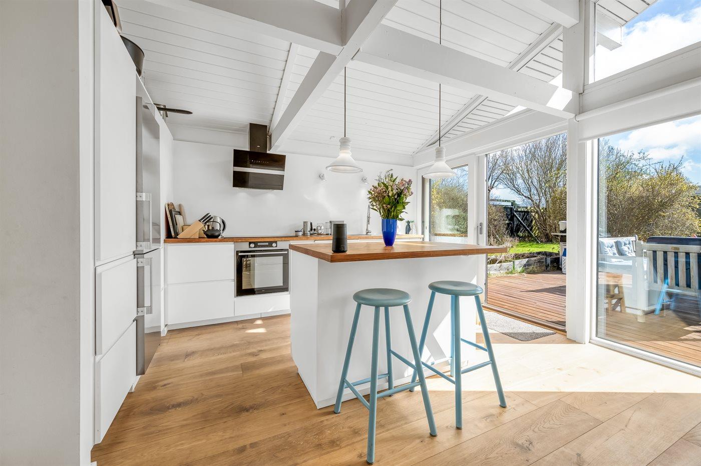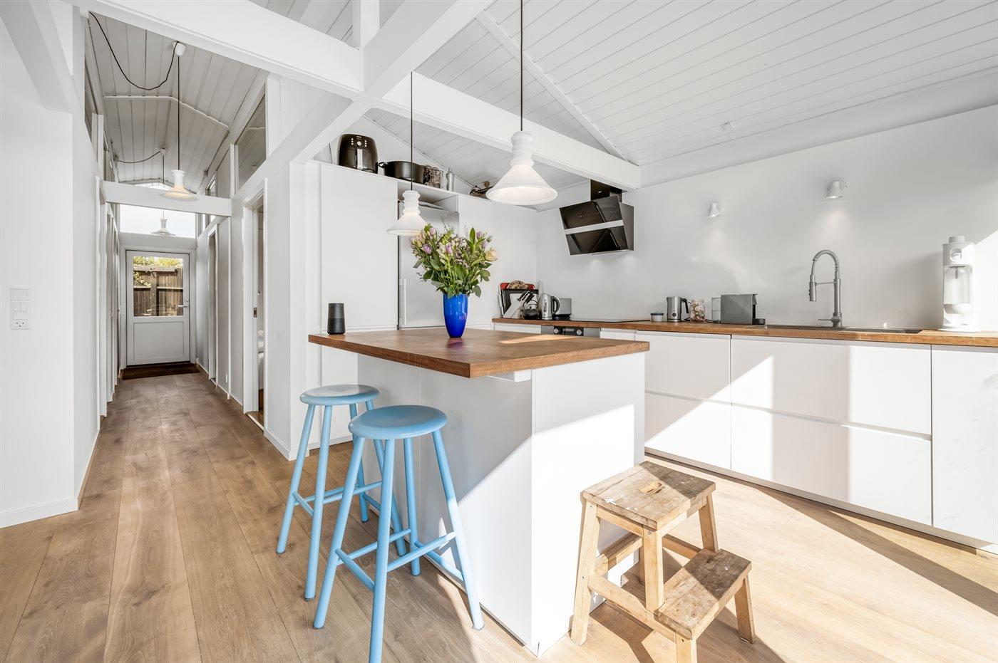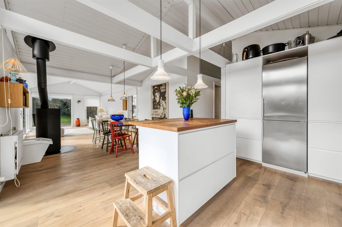 Køkkenet er udstyret med 1 køleskab. Der er 5 induktionskogeplader, varmluftovn, Airfryer samt opvaskemaskine.