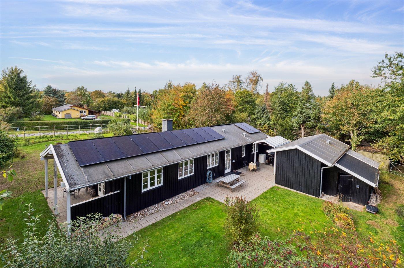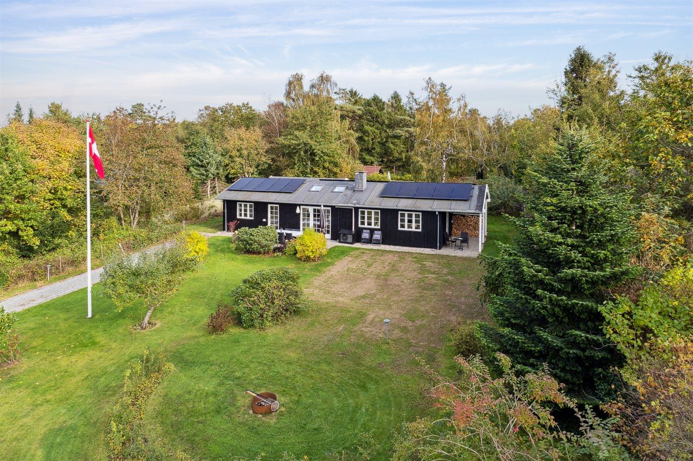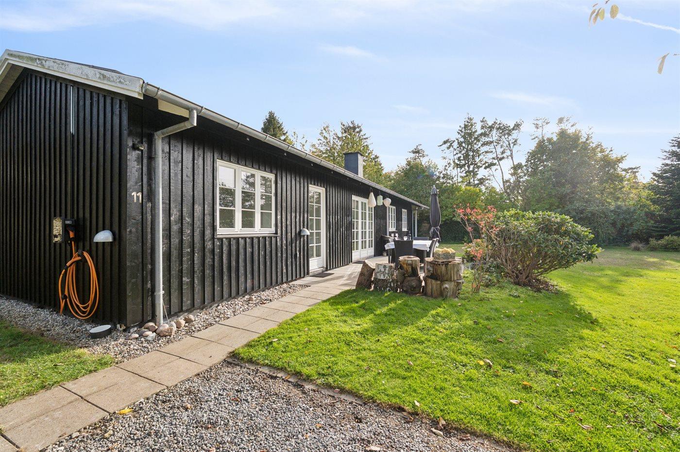 Ferieboligen er beliggende på en 1206 m² stor havegrund. Grunden er indhegnet. Der er 1300 m til havet. Nærmeste forretning er beliggende i en afstand af 1900 m. Til ferieboligen hører åbent terrasseareal. Desuden er der overdækket terrasse. Bålsted. Grill til rådighed. Der er installeret stik til opladning af elbil. Type 2 stik. Med 11 kW ladeeffekt. Parkering ved ferieboligen.