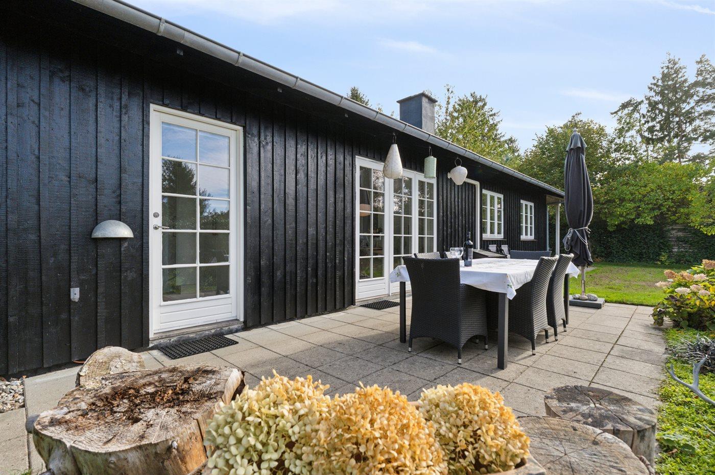 Moderne og lyst sommerhus ved Udsholt Strand med stor have og flere terrasser.