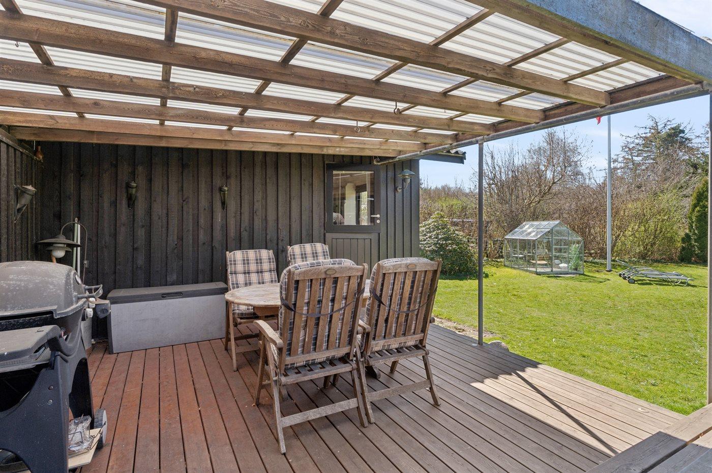 Ferieboligen er beliggende på en 1202 m² stor havegrund. Der er 1050 m til havet. Nærmeste forretning er beliggende i en afstand af 1150 m. Til ferieboligen hører åbent terrasseareal. Desuden er der overdækket terrasse. Der er redskabsrum. Udendørs bruser. Grill til rådighed. Parkering ved ferieboligen.