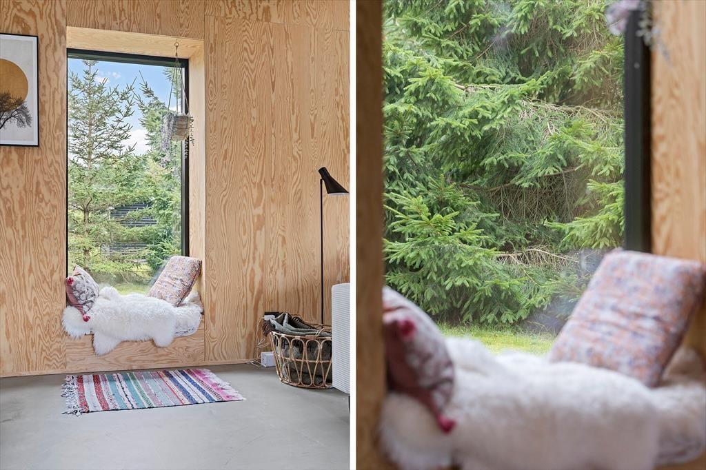 Indenfor fortsætter feriefølelsen, når du træder ind i et lyst og venligt sommerhus, hvor naturmaterialer, loft til kip og store vinduespartier skaber luft og ro. Indretningen er enkel og nordisk med varme toner, teksturer og små detaljer, der giver karakter.