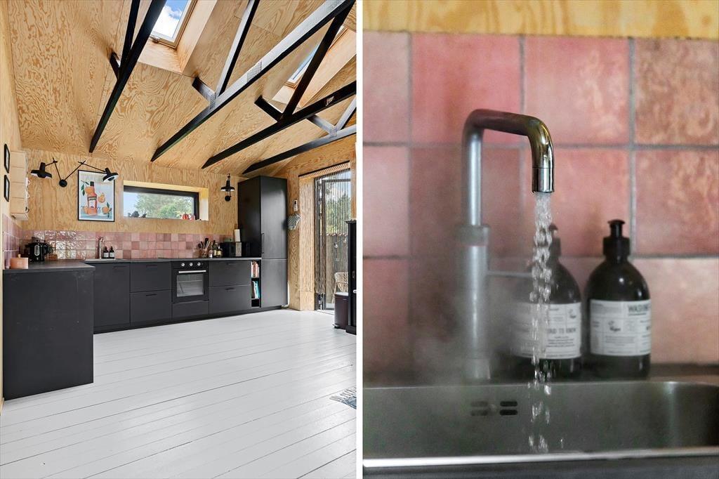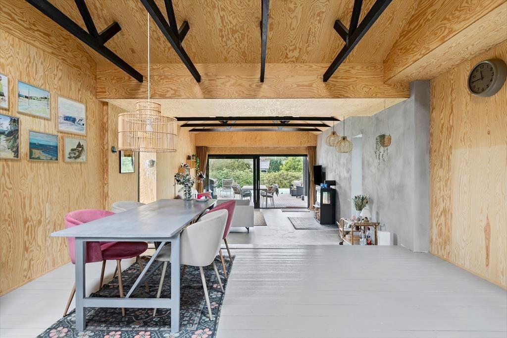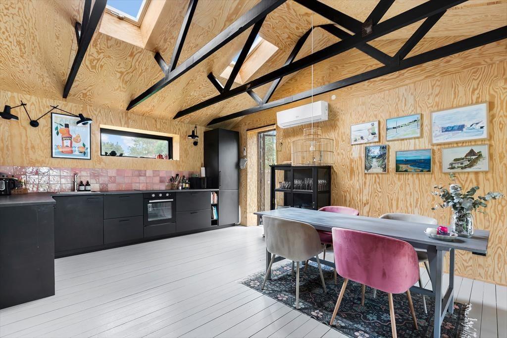 I det åbne og stilfulde køkken-alrum, der er designet med funktionalitet og æstetik i fokus, kan I tilberede feriens måltider og hygge omkring spisebordet med gode snakke. Efter en dag med sjove aktiviteter kan I synke ned i opholdsstuens sofa og slappe af med en god bog, film, brætspil eller nyde hinandens selskab med et glas vin i hånden.