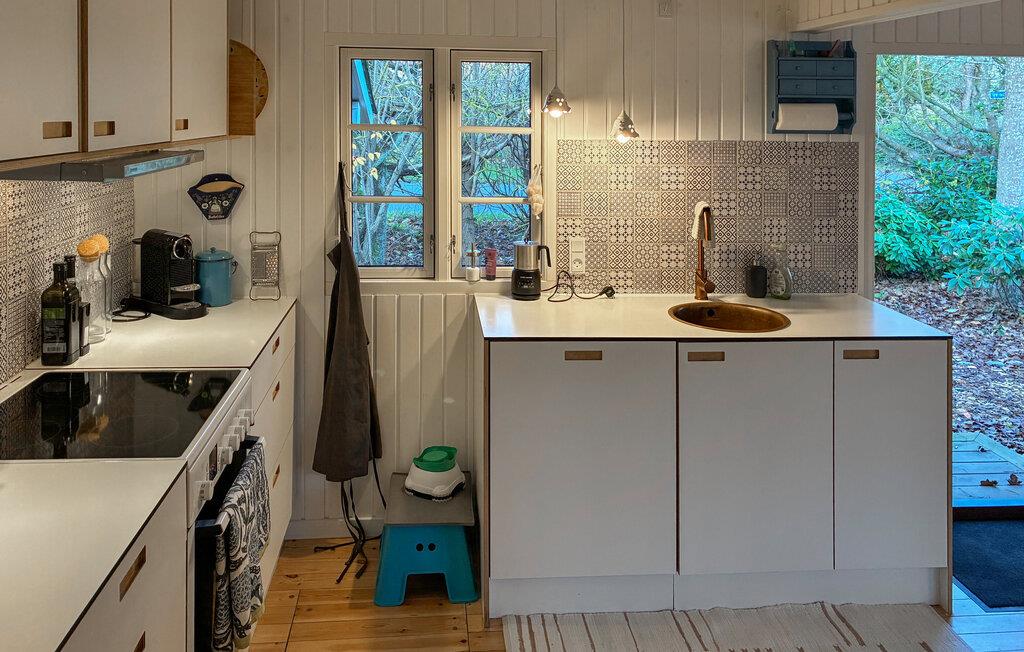 Træd ind i den smukke opholdsstue og slap af i den behagelige sofa. De store vinduer skaber en varm atmosfære og forbinder problemfrit interiøret med haven. Udnyt det åbne køkken, som med sine praktiske faciliteter tilbyder ideelle betingelser for at tilberede jeres måltider. Spiseområdet med brændeovn giver mulighed for afslappende aftener i hyggelig varme.
