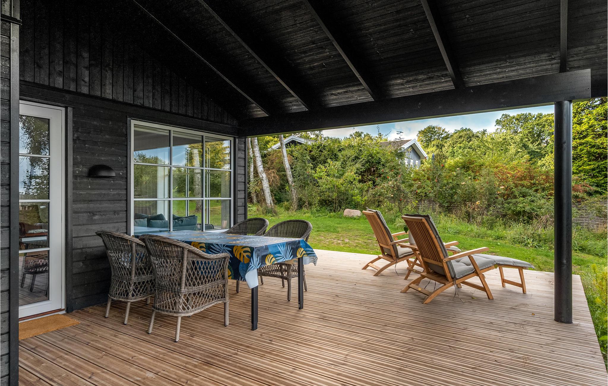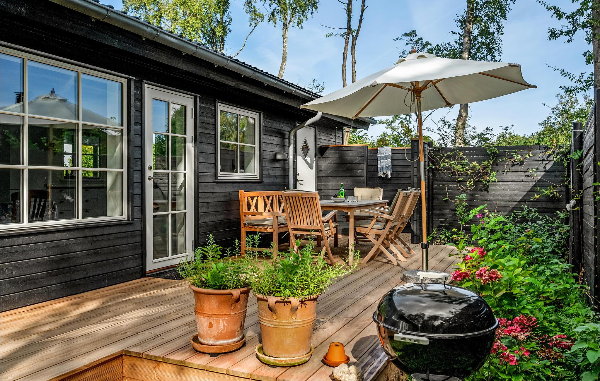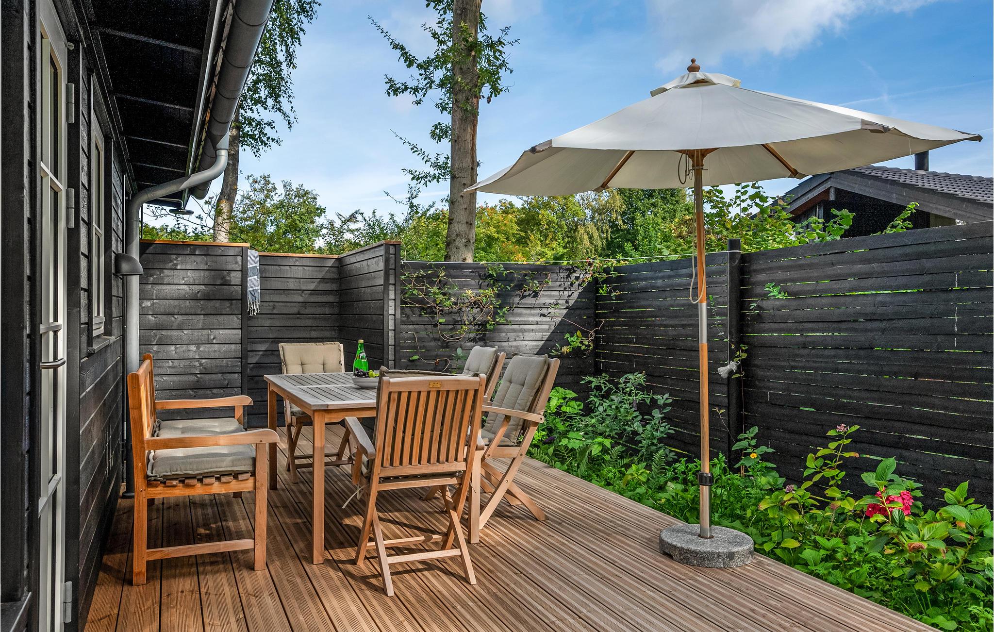 Huset har privat have og en stor træterrasse med både åbne og overdækkede arealer. Her kan I nyde solen fra liggestolene eller spise eller læse en god bog i skyggen. Børnene vil elske at lege i haven. I har også grill til rådighed, så I kan holde hyggelige grillaftener.