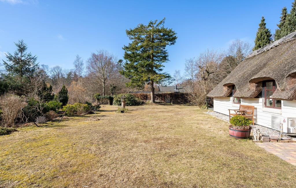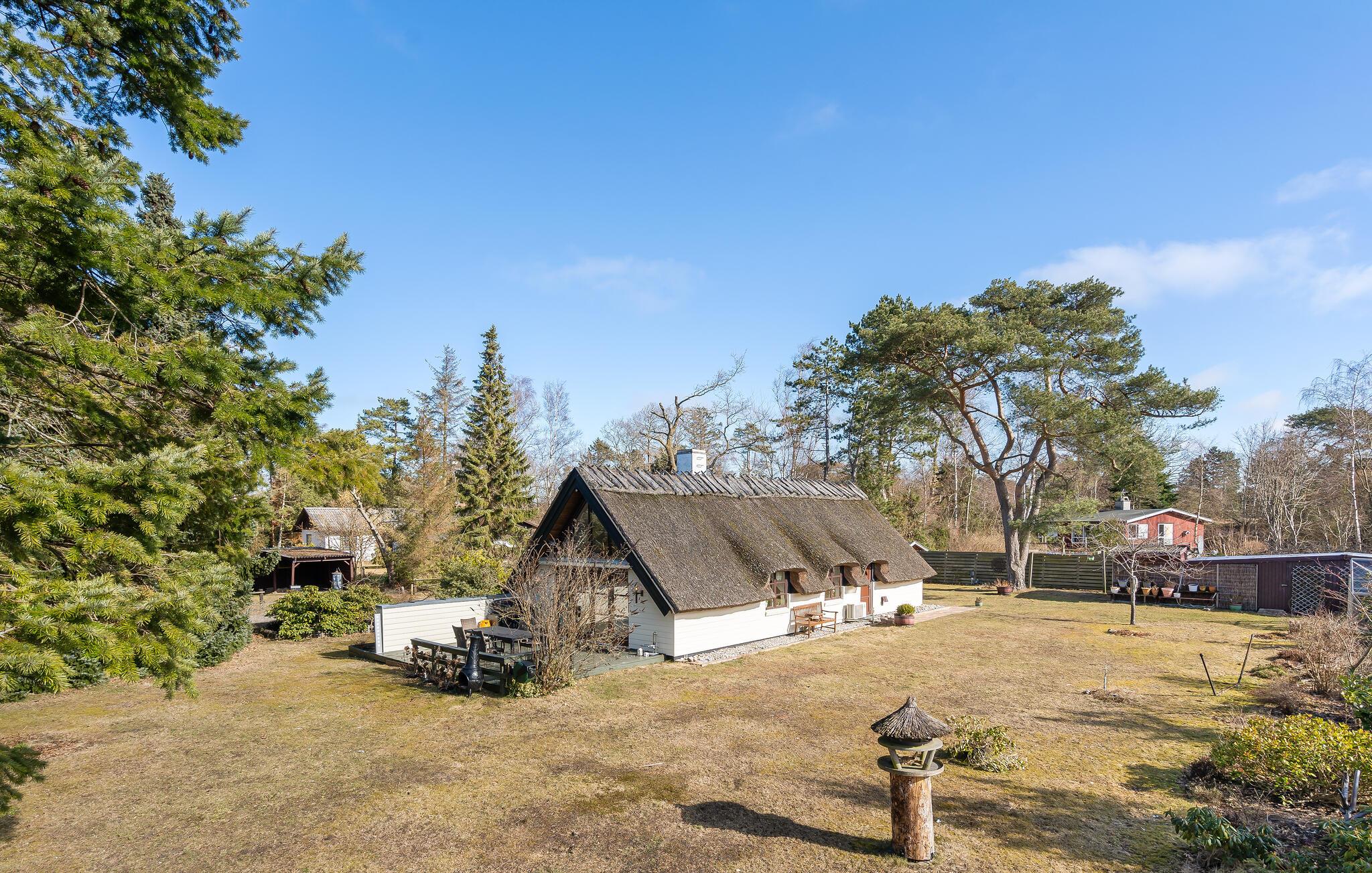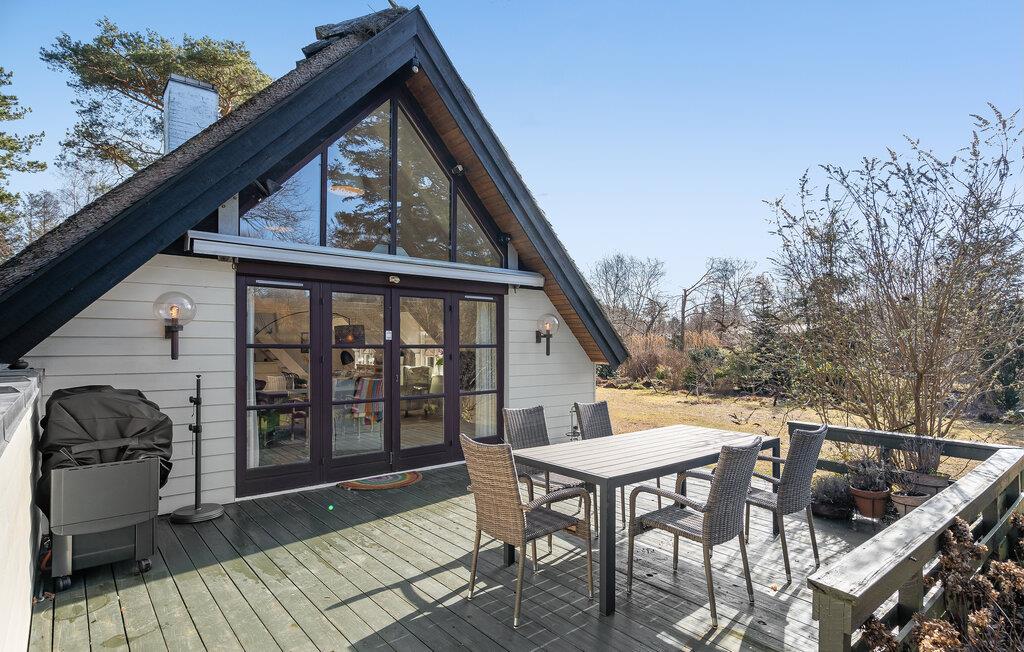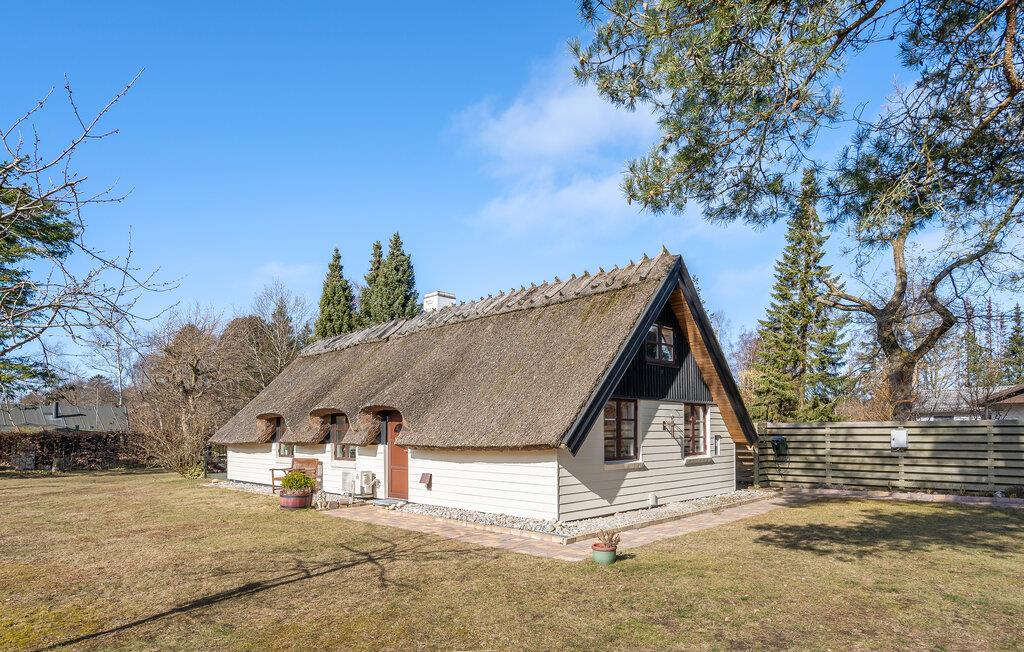 Stilfuldt sommerhus med stråtag, stor terrasse og pejs nær Udsholt Strand i naturskønne omgivelser.