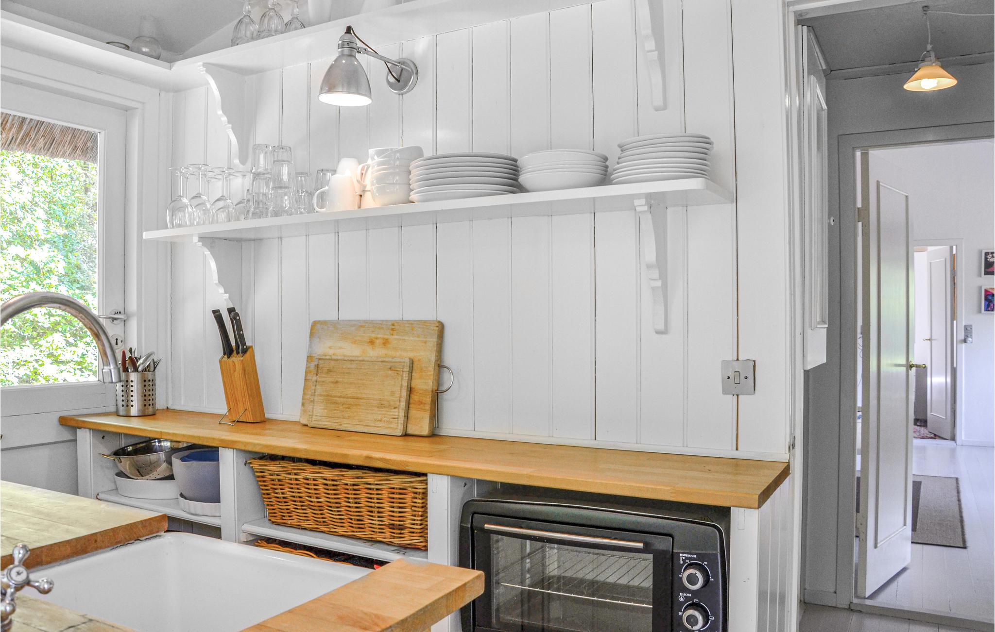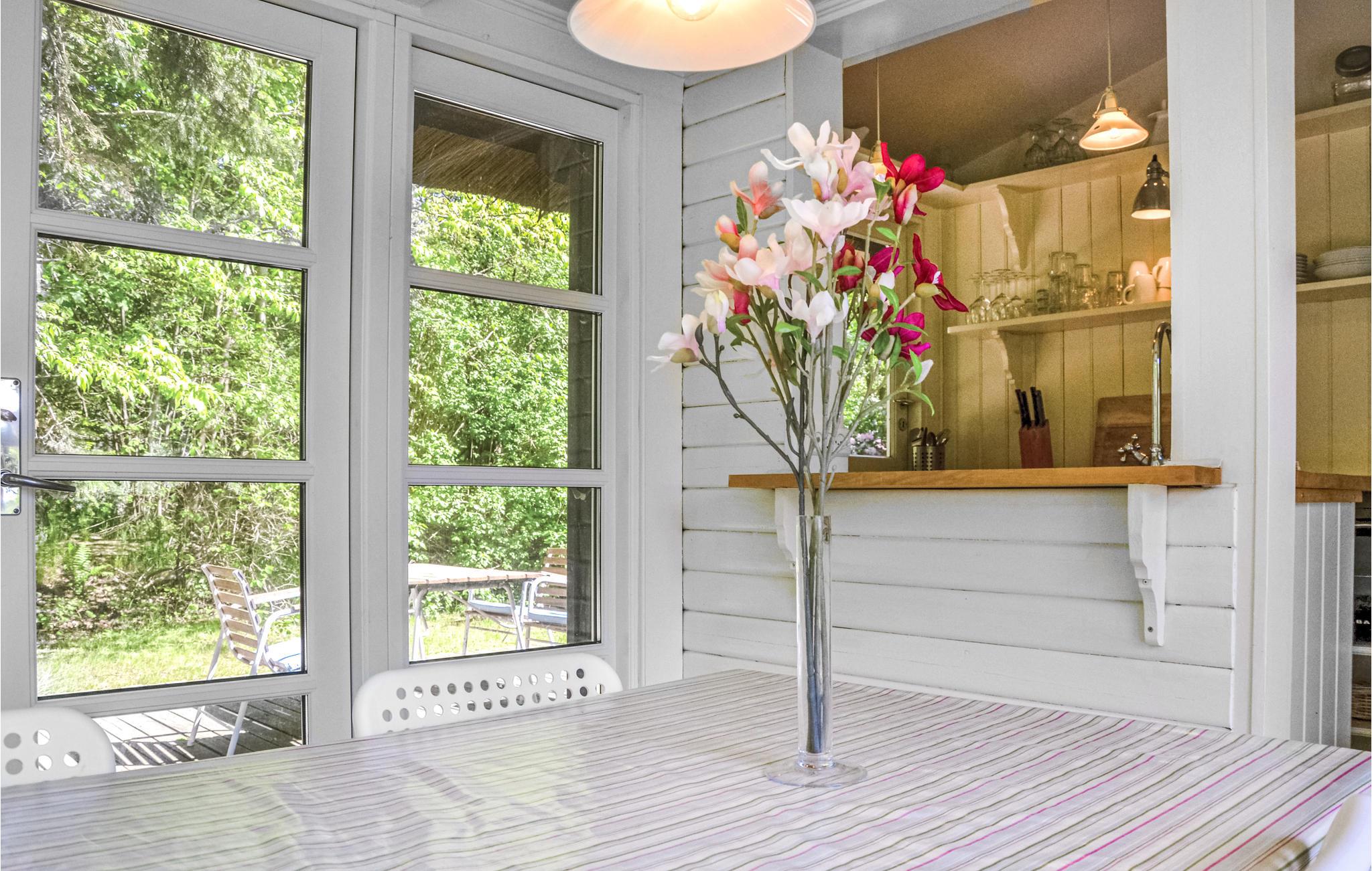 Charmerende stråtækt sommerhus, der er yderst fredeligt beliggende på en stor, skøn naturgrund for enden af en lille, lukket grusvej. Sommerhuset ligger kun 120 m fra Kattegat med privat sti direkte til stranden. Huset er lyst og smagfuldt indrettet i hyggelig bondehusstil med en højloftet stue, en god brændeovn og store glaspartier. Det store soveværelse vender mod nord, og det andet soveværelse er sydvendt. Det rustikke, åbne køkken ligger i forbindelse med den lyse udestue. Den dejlige, store terrasse omkranser huset mod både nord, øst og vest, så I har altid mulighed for at sidde i sol/skygge. Fra grunden er der havkig, når I sidder på morgenterrassen og nyde kaffen.