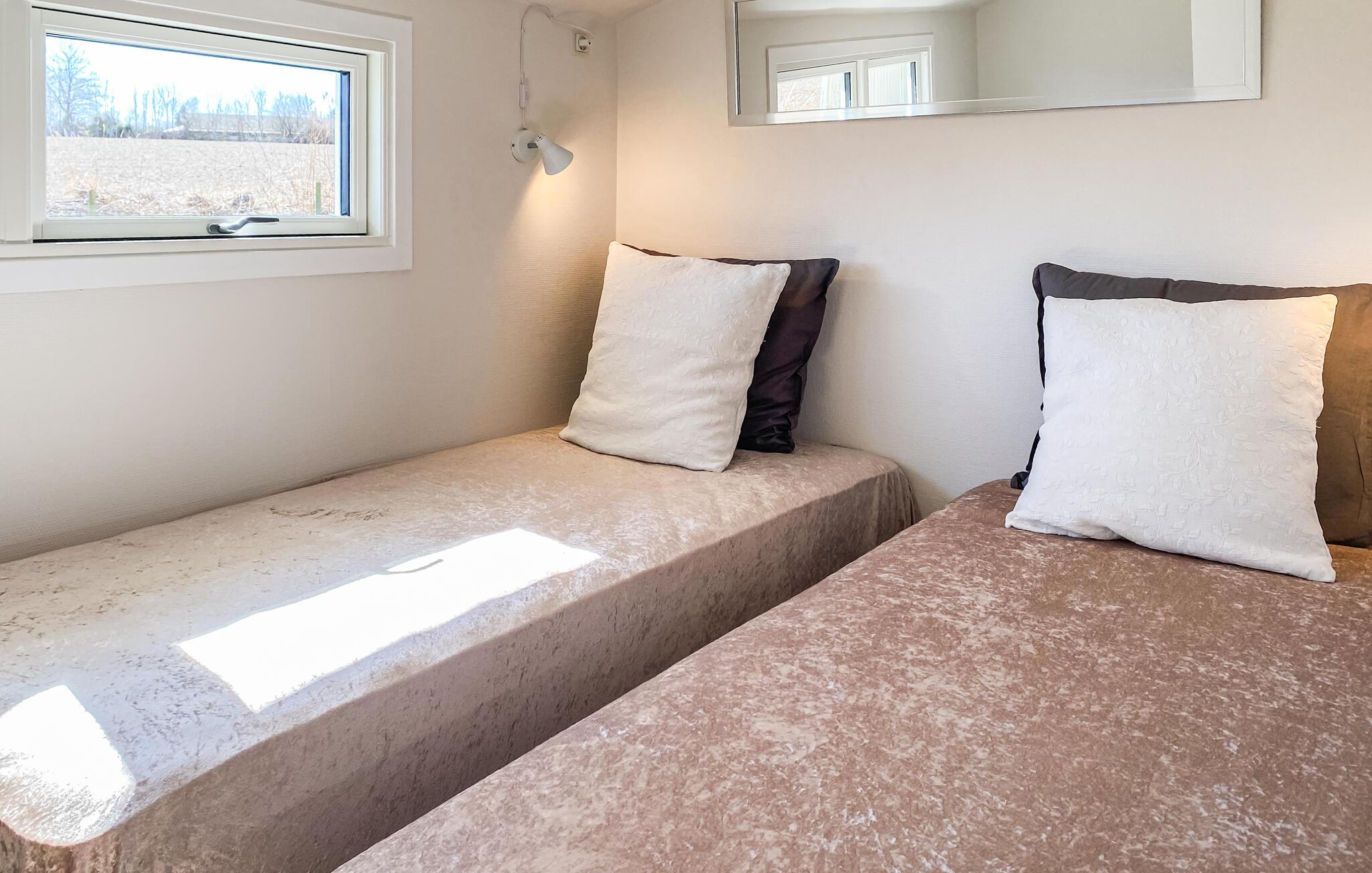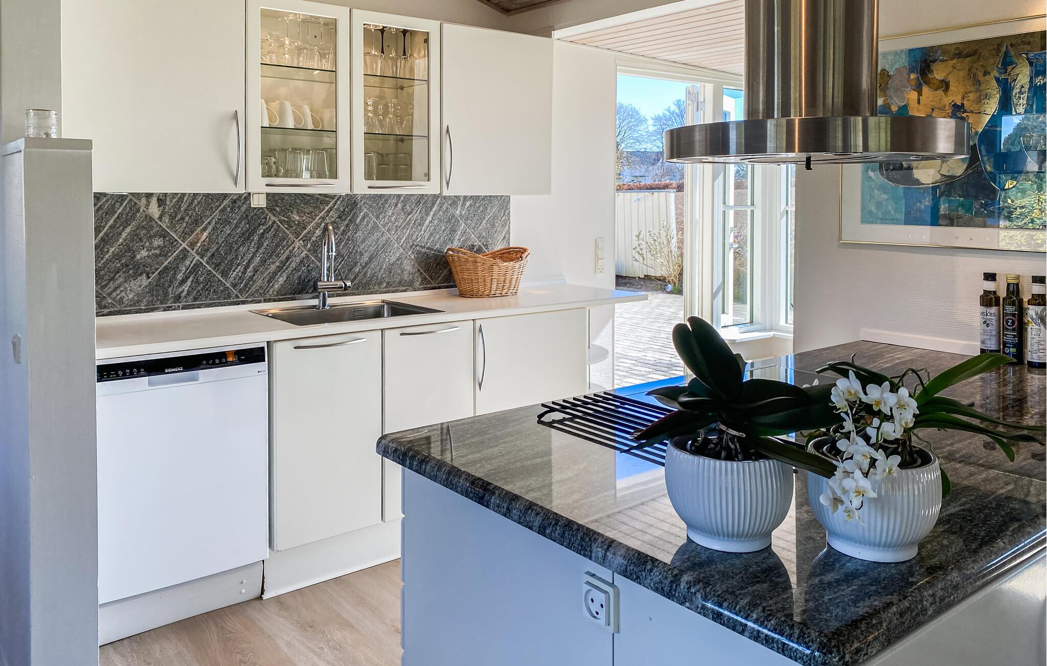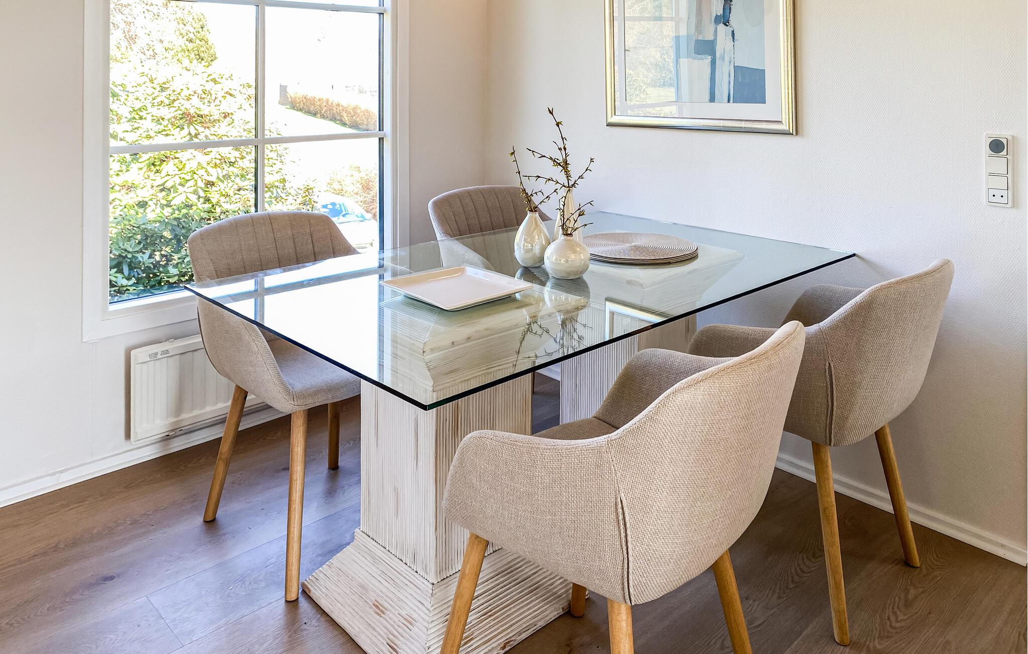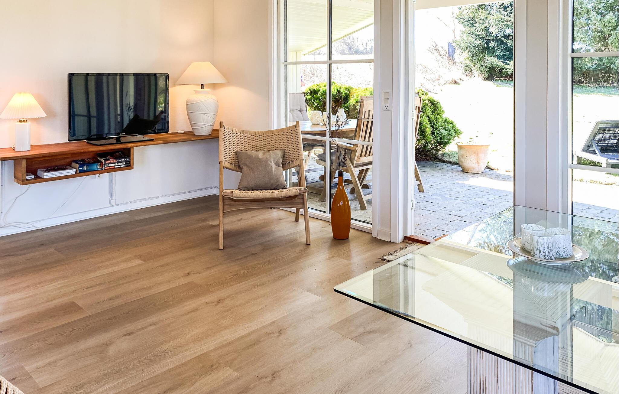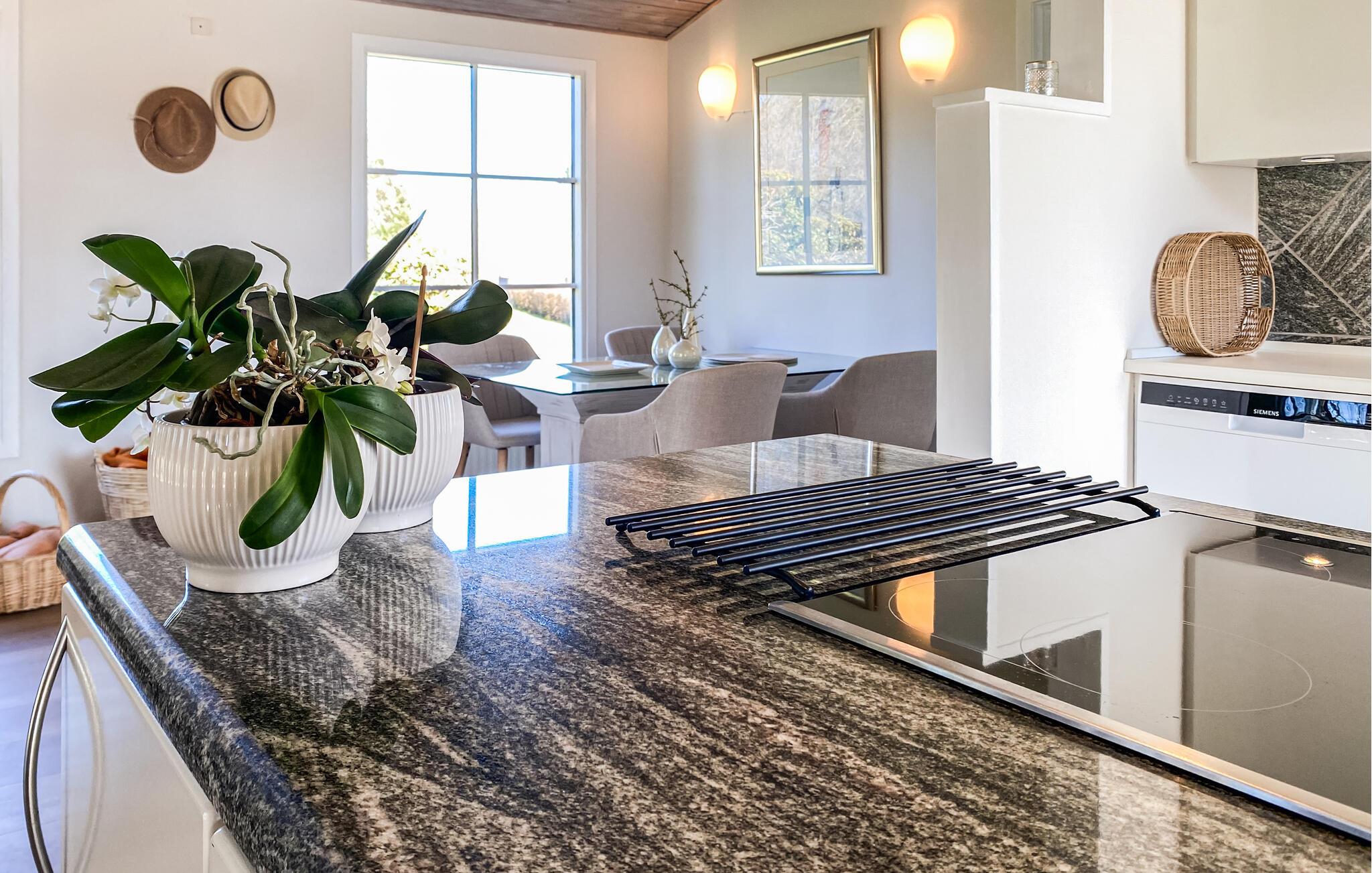 Træd ind i den rummelige stue, og nyd den lyse og smagfulde indretning. Store vinduer sørger for masser af dagslys og åbner udsigten til det omkringliggende landskab. Tag plads i sofaen, og glæd jer til rolige stunder i opholdsområdet. Benyt den åbne forbindelse til spisepladsen, som er indrettet med et stilfuldt bord og komfortable stole. Tilbered måltider i det veludstyrede køkken, der imponerer med moderne faciliteter og god arbejdsplads.
