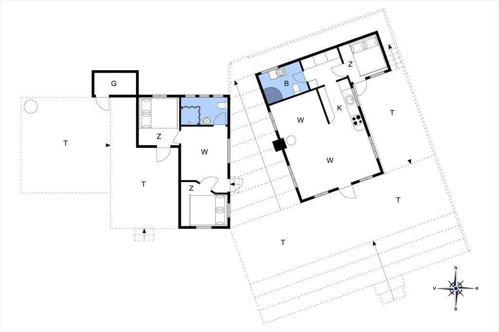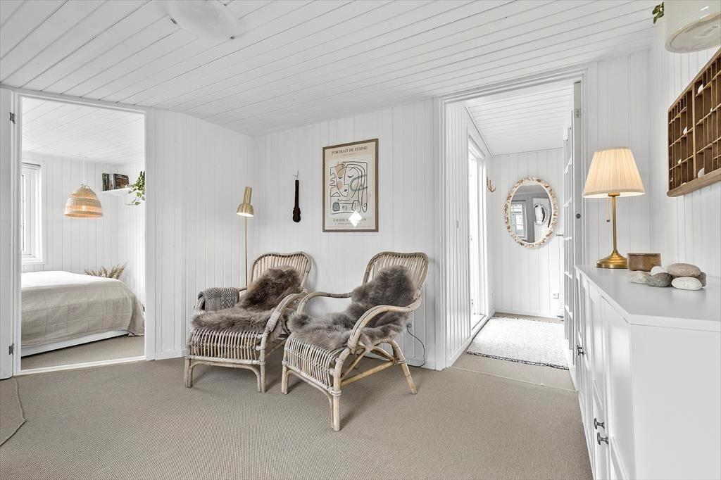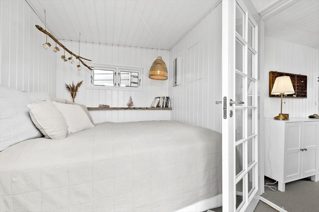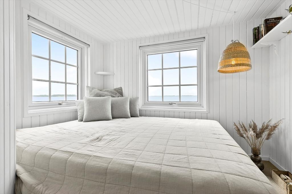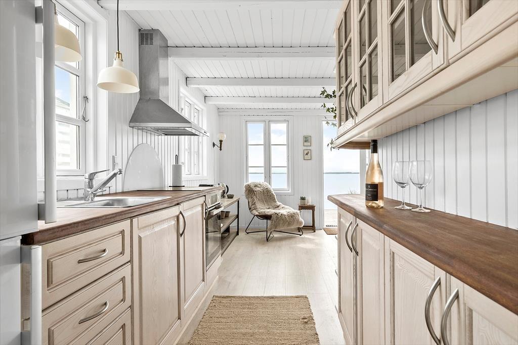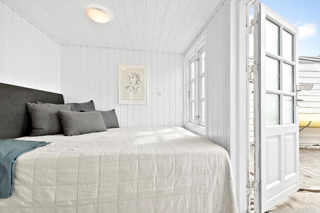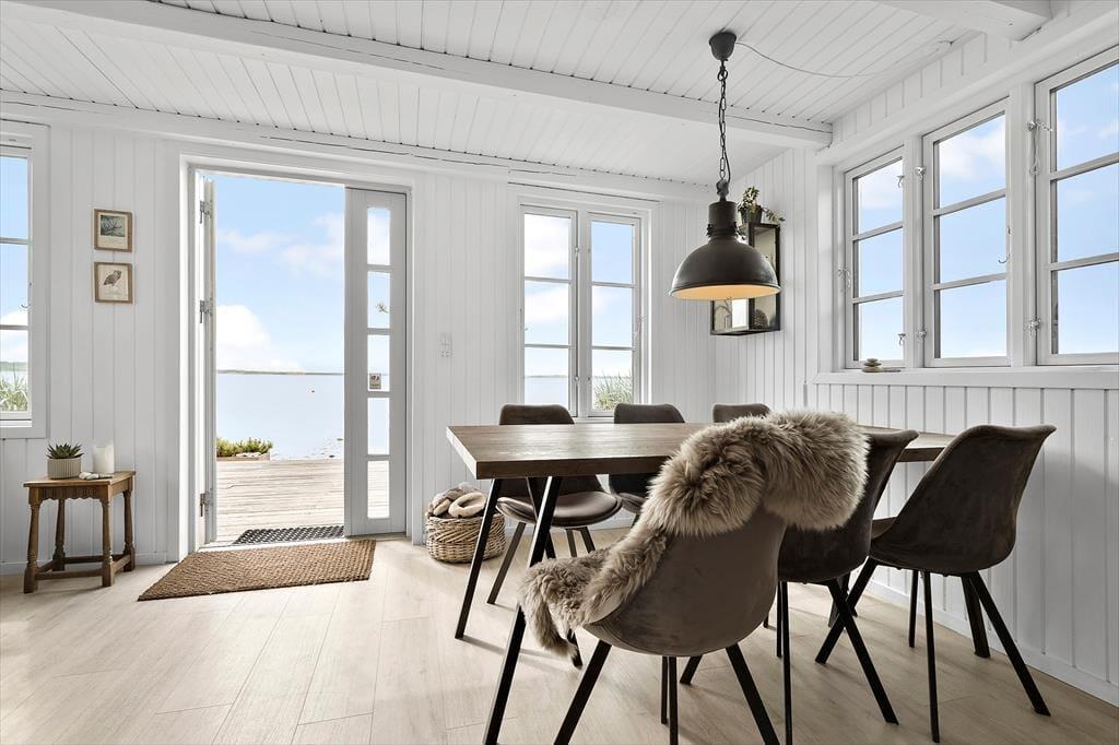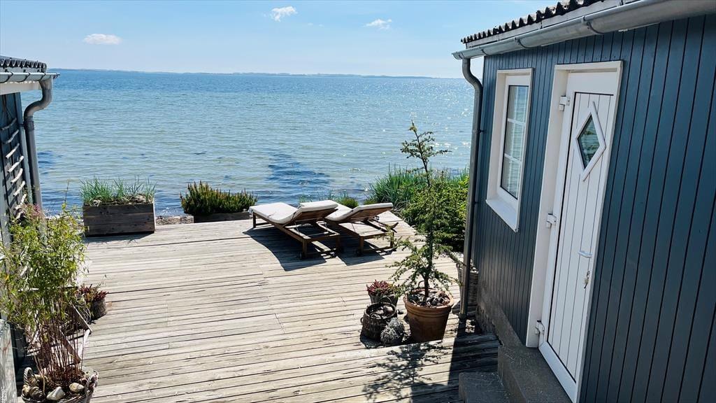 Tænk at vågne op til bølgeskvulp og havfugles kvidren! Her får du to skønne strandhuse, forbundet af en dejlig træterrasse og beliggende direkte ud til stranden – nogle dage kan du endda træde direkte fra terrassen ned i vandet. Huset er indrettet med ægte bohemestrandhusstemning og masser af hygge, og fra alle rum kan I nyde den smukke udsigt over stranden. Det ene hus har et åbent opholdsrum med stue, spisekrog og køkken i ét, en brændeovn og varmepumpe, soveværelse med dobbeltseng samt et badeværelse med bruser. Det andet hus tilbyder hele to soveværelser med dobbeltsenge, et rummeligt fællesrum og badeværelse med bruser – perfekt til både familier og vennepar.