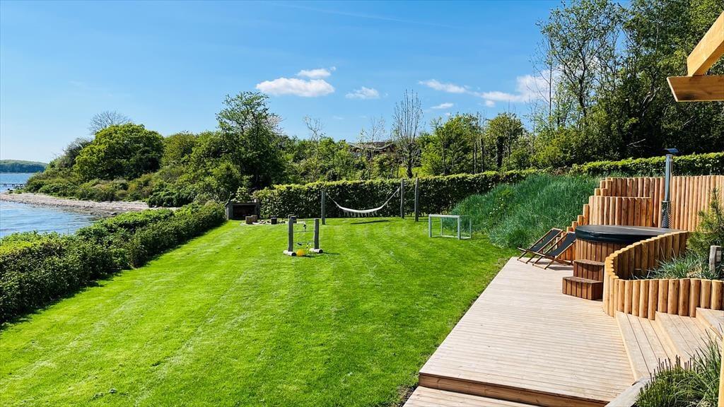 Med en helt fantastisk strandhave, hvor I er i første række til stranden, er I klar til lange dage under åben himmel. Her er kræset for detaljerne: et skønt græsareal med bålplads og hængekøje, og masser af plads til leg og spil – men vær forsigtig med bolden, den kan nemt ende i vandet! Nyd livet på de dejlige terrasser, hvor I kan finde jer til rette i hyggelige kroge og tage en pause fra dagens aktiviteter. Huset har endda en enmandskajak til små ture på vandet, perfekt til både ro og eventyr. Som noget nyt er der lavet et vildmarksbad, så selv på en kølig dag kan du finde noget godt at lave udenfor.