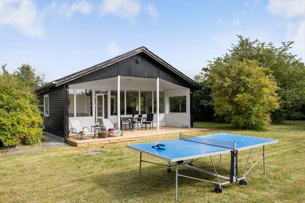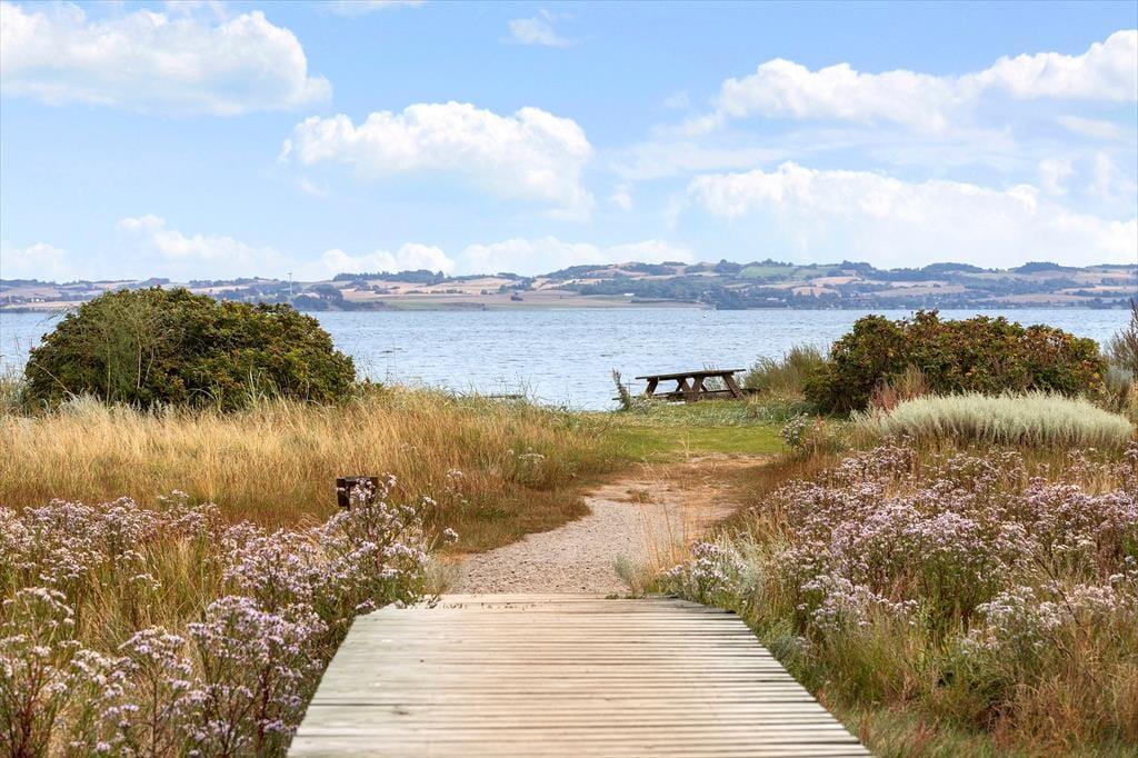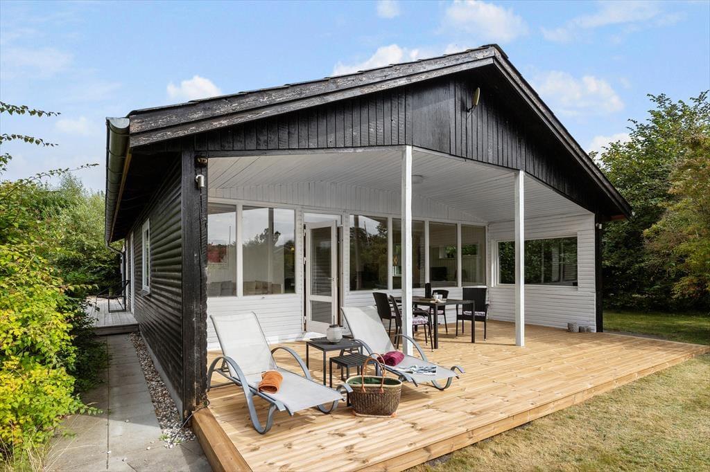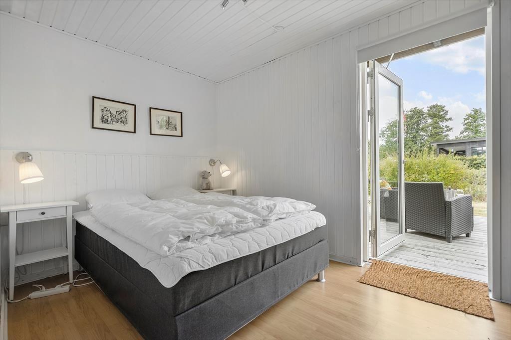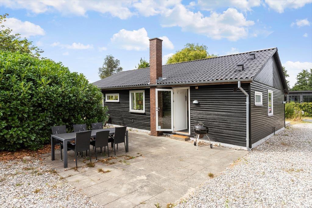 Sommerhuset ligger på en fredelig grund med god plads omkring dig – her kan du trække vejret helt ned i maven. Der er en stor terrasse med både sol og skygge, hvor du kan nyde morgenkaffen, læse en bog eller grille med familien. Den børnevenlige strand ligger bare 200 meter væk – perfekt til både badeture, sandslotte og lange gåture i aftensolen. Din hund er også velkommen, så hele familien kan være med på ferie.