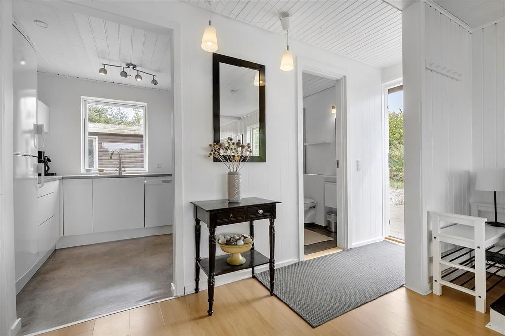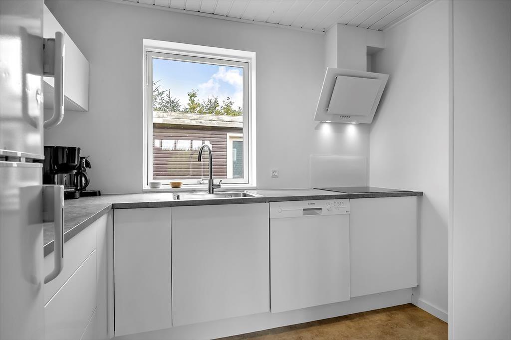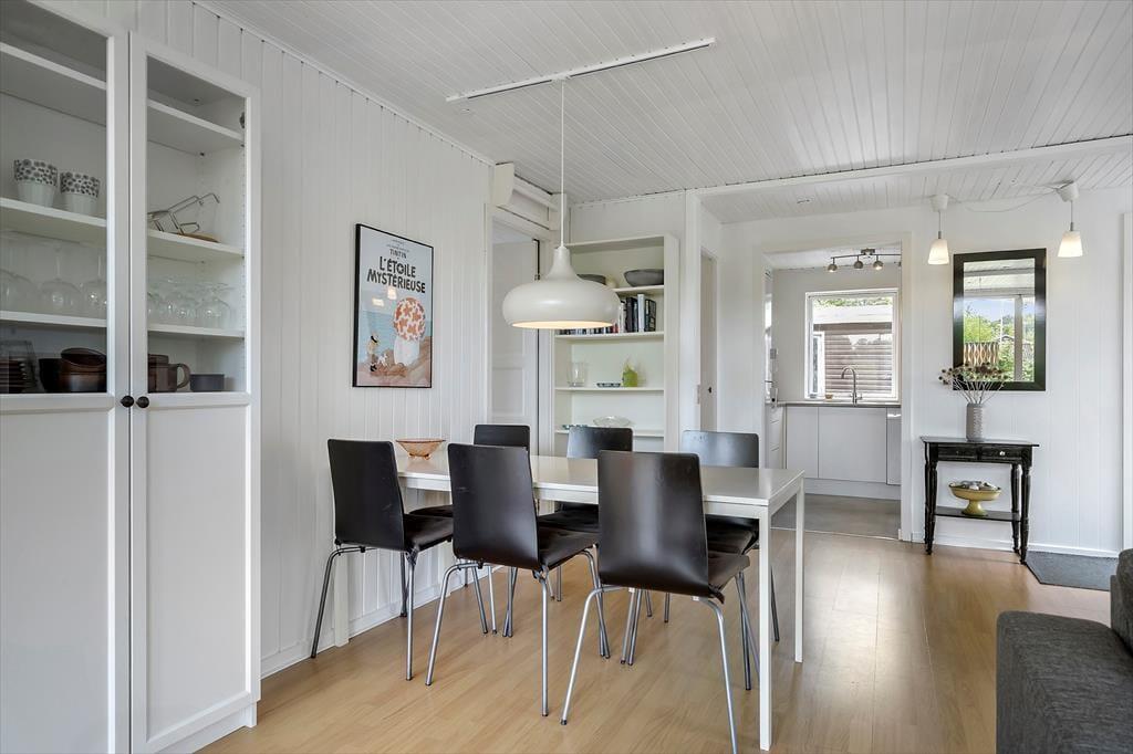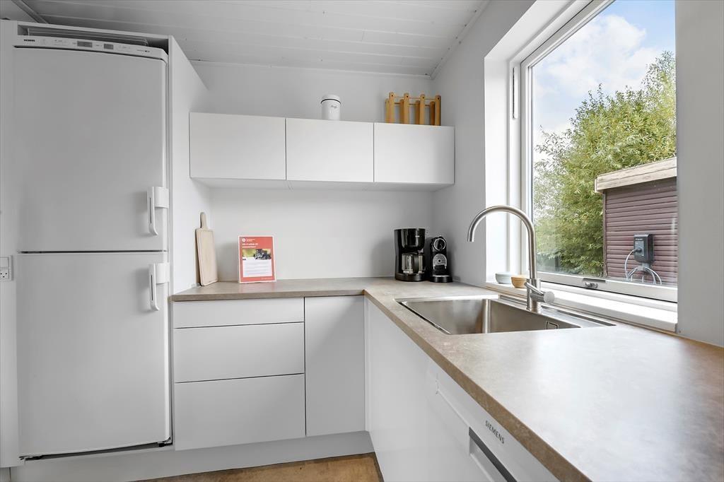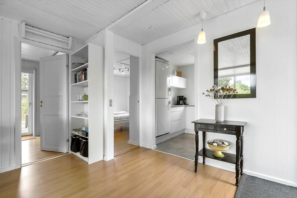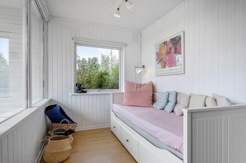 Sommerhuset ligger på en fredelig grund med god plads omkring dig – her kan du trække vejret helt ned i maven. Der er en stor terrasse med både sol og skygge, hvor du kan nyde morgenkaffen, læse en bog eller grille med familien. Den børnevenlige strand ligger bare 200 meter væk – perfekt til både badeture, sandslotte og lange gåture i aftensolen. Din hund er også velkommen, så hele familien kan være med på ferie.