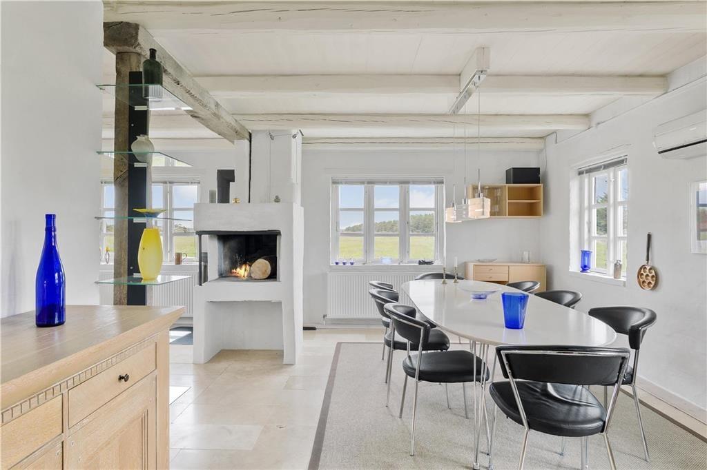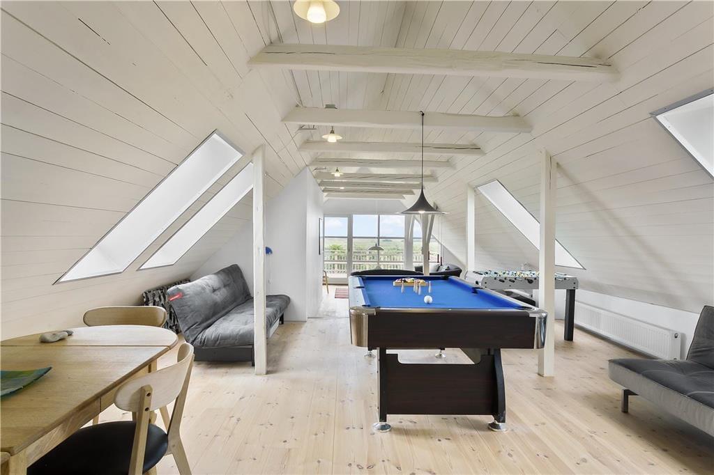Når du træder ind i sommerhuset på Skjærbakken 37, mødes du af en lys og indbydende atmosfære, hvor plads og komfort går hånd i hånd. Det store aktivitetsrum er hjemmets hjerte og inviterer til timevis af sjov med bordfodbold og billard – ideelt til børn og voksne, der elsker leg og konkurrence. Hele huset er designet med fokus på fællesskab, og der er masser af hyggelige kroge, hvor I kan samle jer til brætspil, afslapning foran brændeovnen eller en god film på sofaen. Her er plads til, at alle kan føle sig hjemme – også familiens firbenede medlemmer, da husdyr er mere end velkomne.
