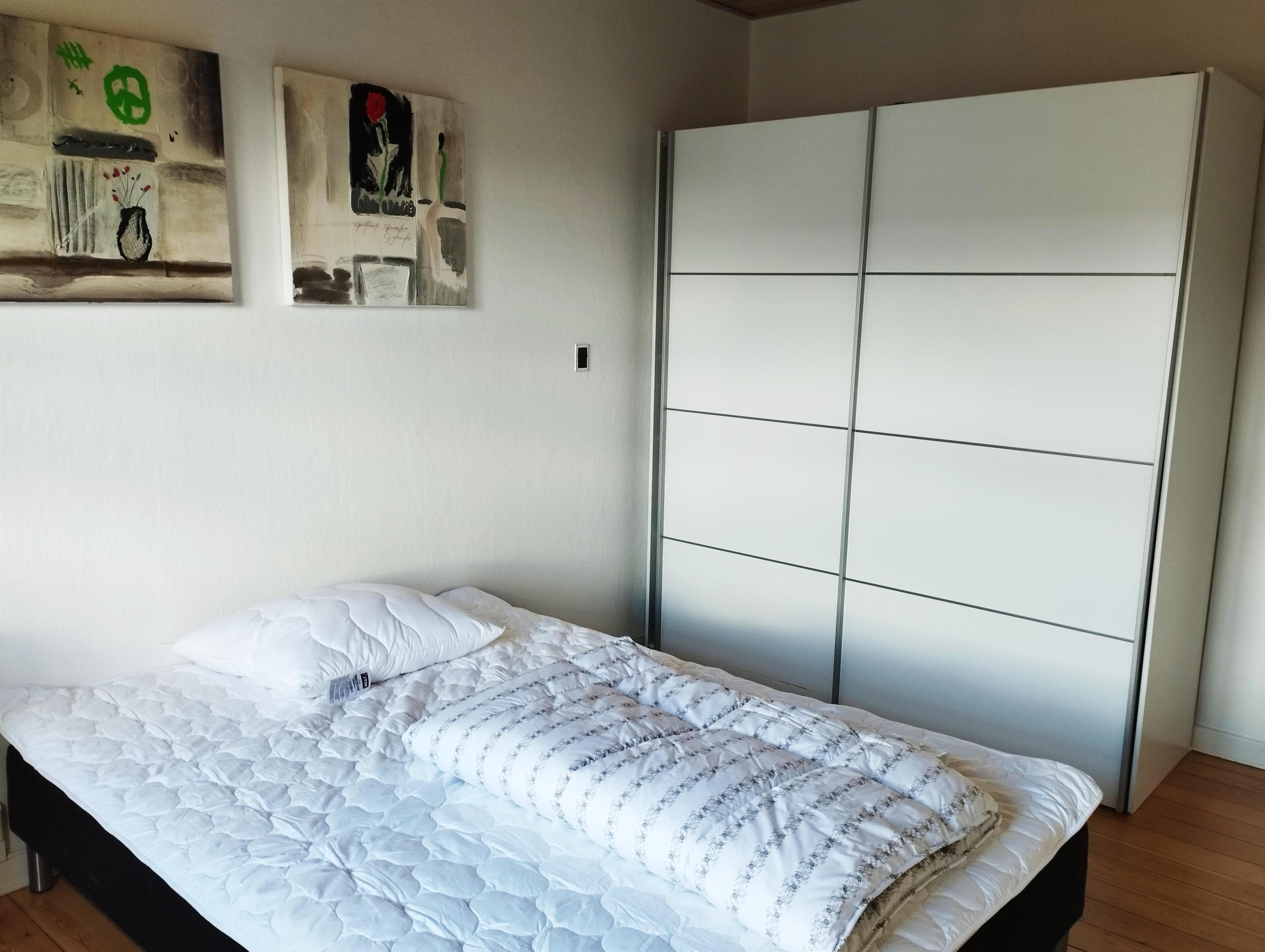 1 værelse med dobbeltseng, 1 værelse med enkelt seng, sovesofa i stuen.