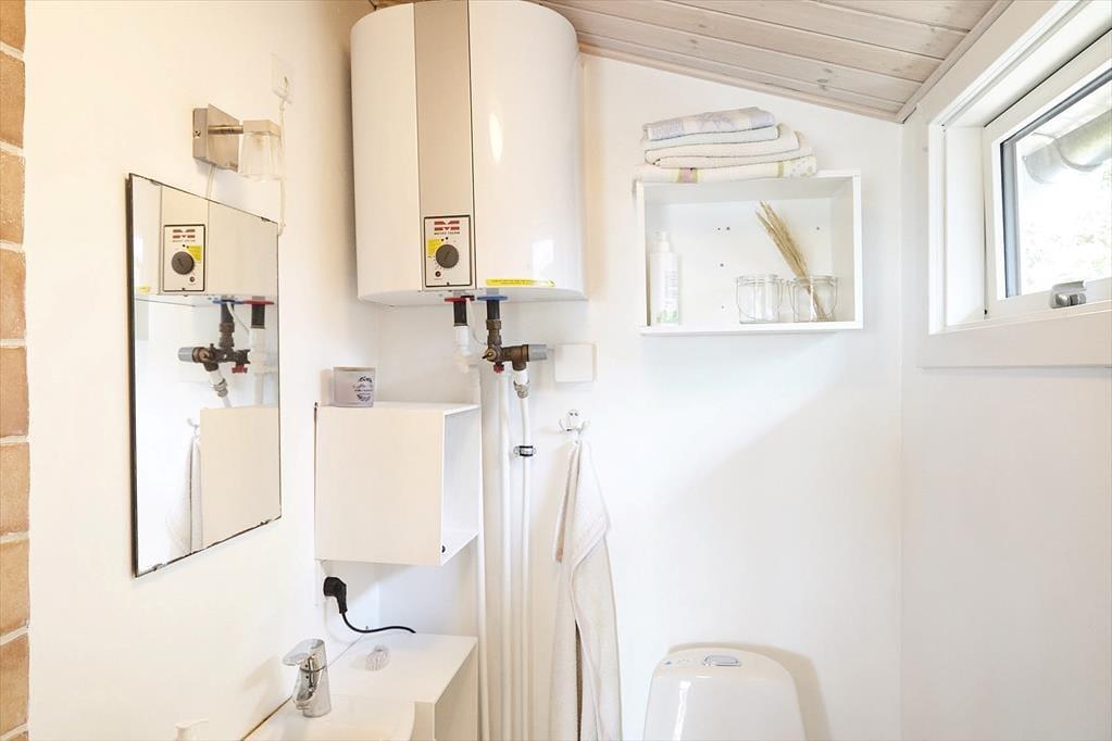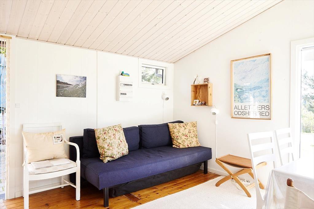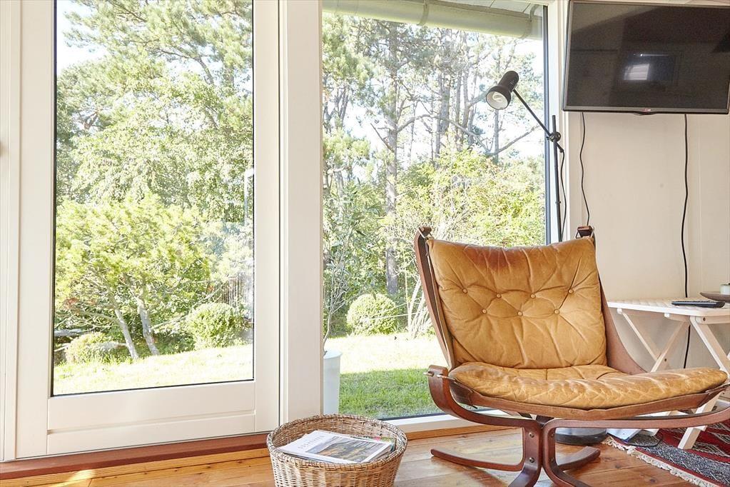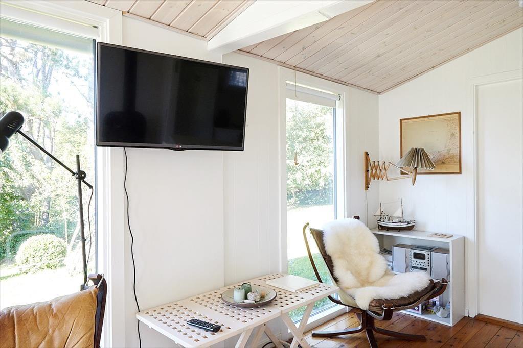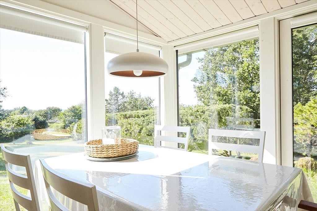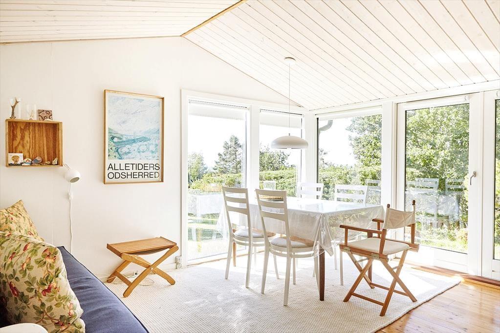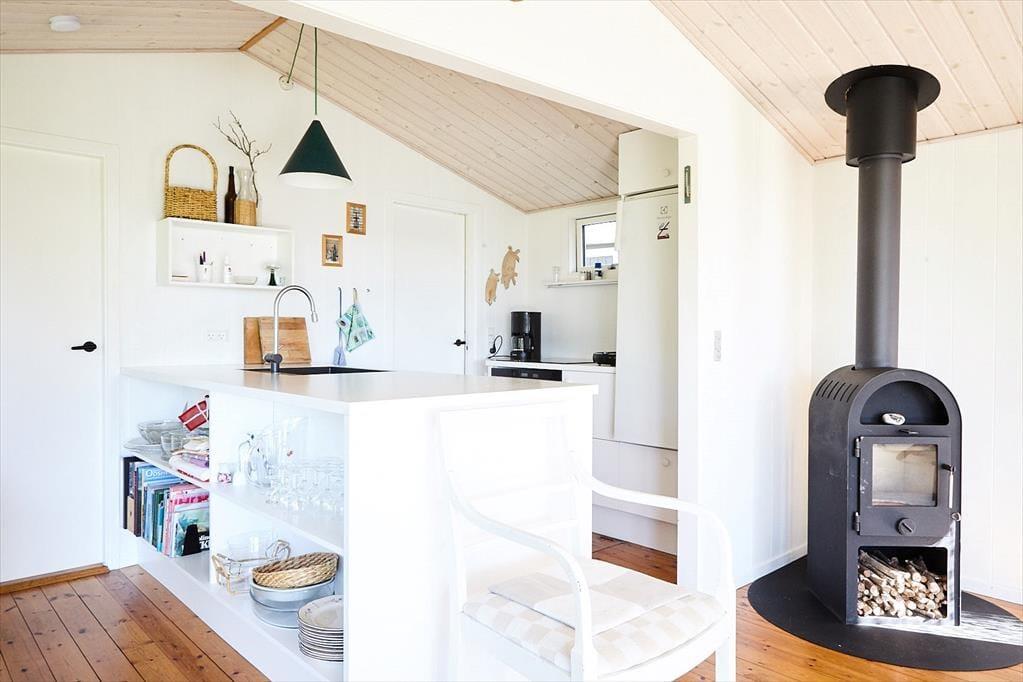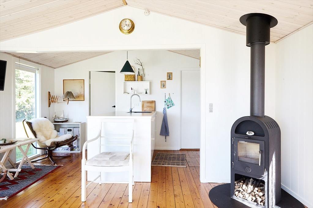 Fra køkkenet midt i det hyggelige sommerhus kan du se ud ad de vestvendte vinduer og skue havet i det fjerne og spidsen af Ordrup Næs, mens du forbereder et måltid. Når I sidder ved spisebordet, har I udsigt til den store pragtfulde naturgrund og havet fra det højt beliggende sommerhusområde. Her er lyst og venligt, ro og fred, og i baghaven grænser grunden op til mere natur. Brændeovnen sørger for, at du altid kan holde varmen i huset, uanset du overnatter i soveværelset eller på sovesofaen i stuen.