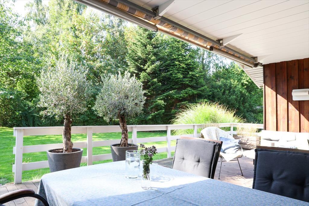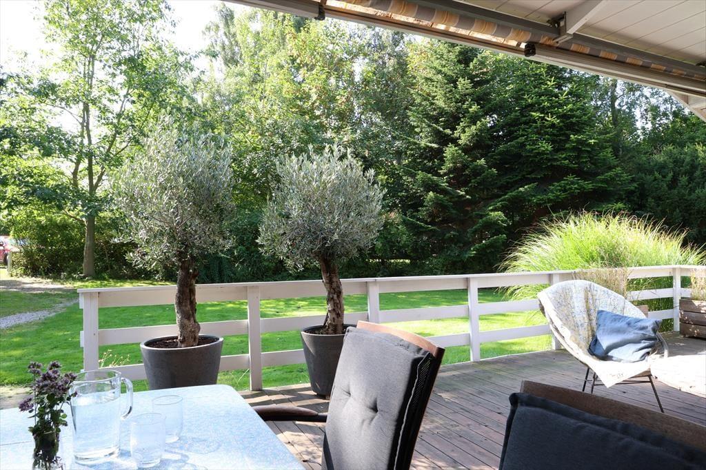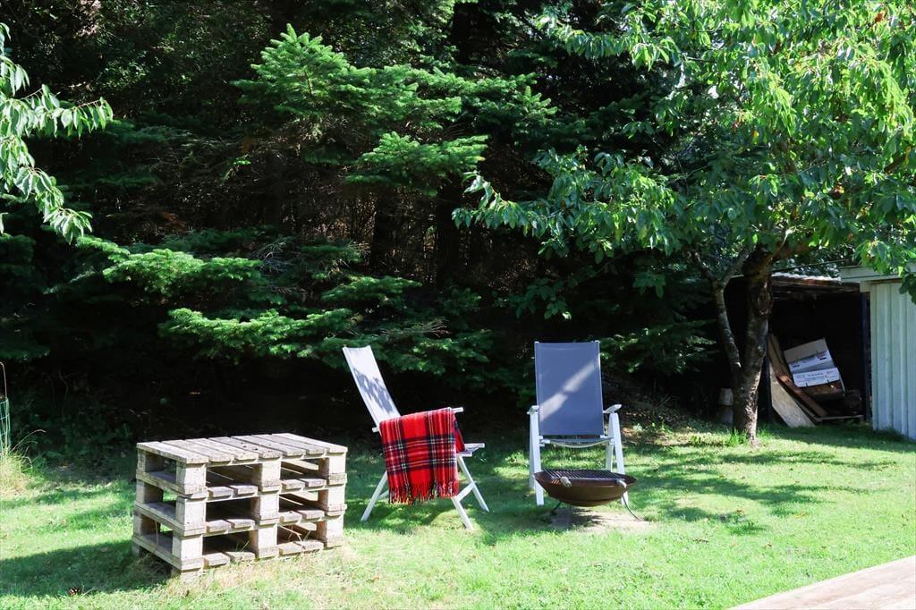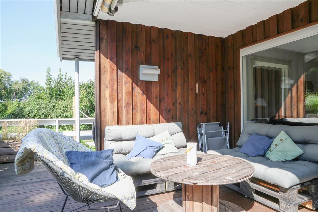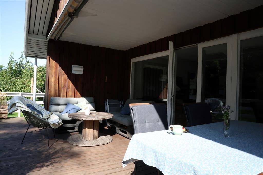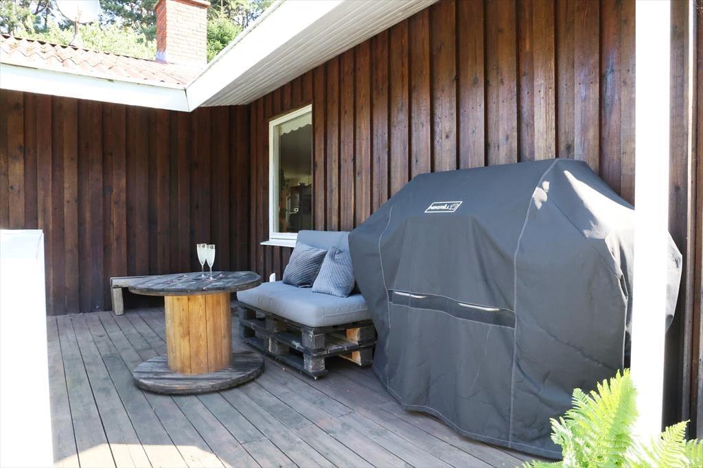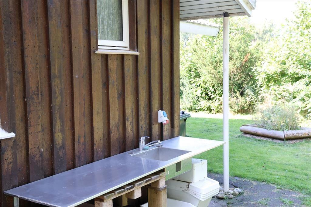 Udendørs er der masser af plads at boltre sig på, der er god plads til udendørs aktiviteter for både børn og voksne, her kan der hygges med medbragte havespil eller spilles en fodboldkamp. Skal det bare være ren og skær afslapning, så kan solen nydes terrassen. Bliver solen for meget er der en god overdækket terrasse med direkte adgang fra stuen. Når aftenen falder på, kan der tændes op i bål stedet og hygges med snobrødsbagning.