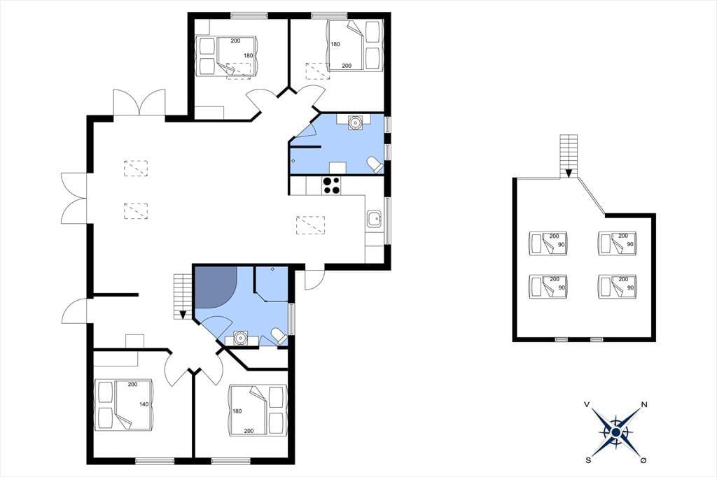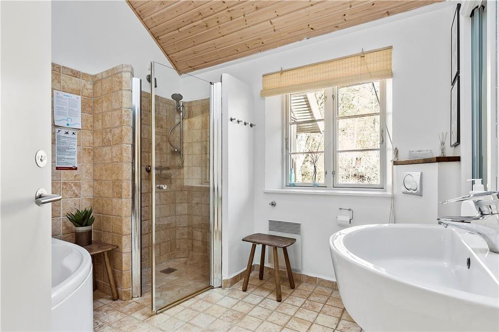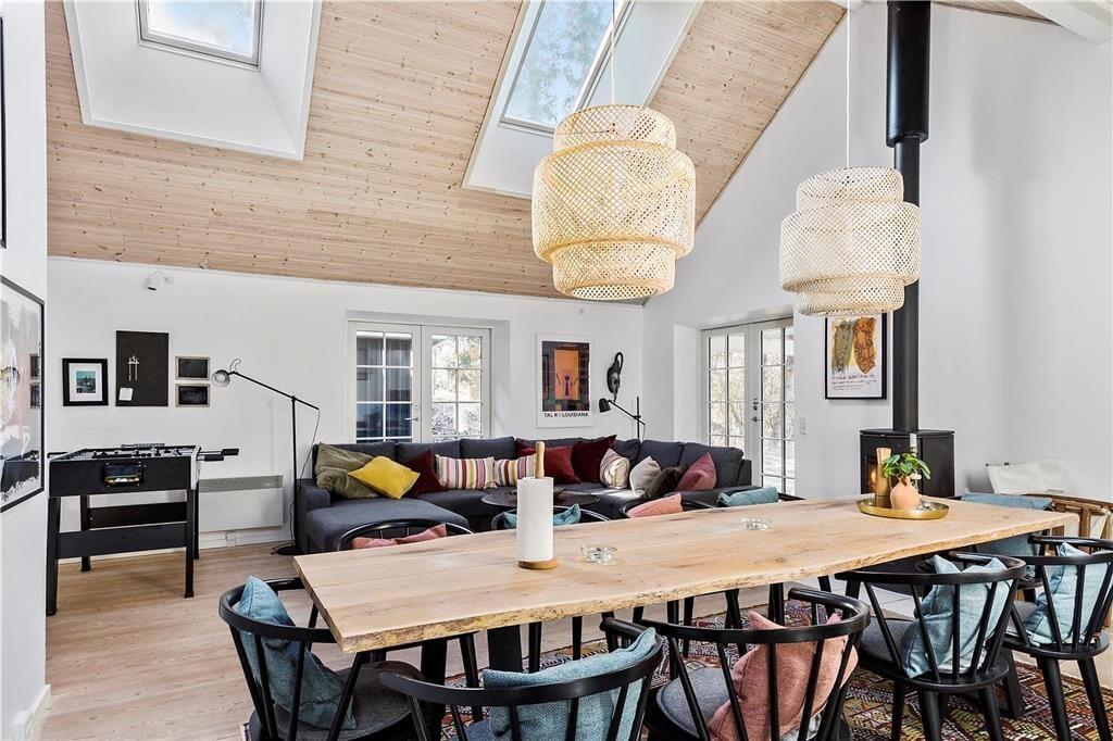 Skøn stue, med plads til aktiviteter eller afslapning. Fra denne er der opgang til stor hems med 4 sovepladser. Stort åbent køkken med plads nok til at samles og hjælpe hinanden med madlavningen. 4 soveværelser, alle med dobbeltsenge i nogle af dem er der kig til nattehimlen, så hvis du har svært ved at sove kan du medbringe sovebriller. To dejlige badeværelser, det ene med spa og sauna. Dejlig terrasse, dels overdækket og dels åben, her kan der både grilles og solen kan nydes i fulde drag. Husk der også er træningsstativ/legestativ i haven.