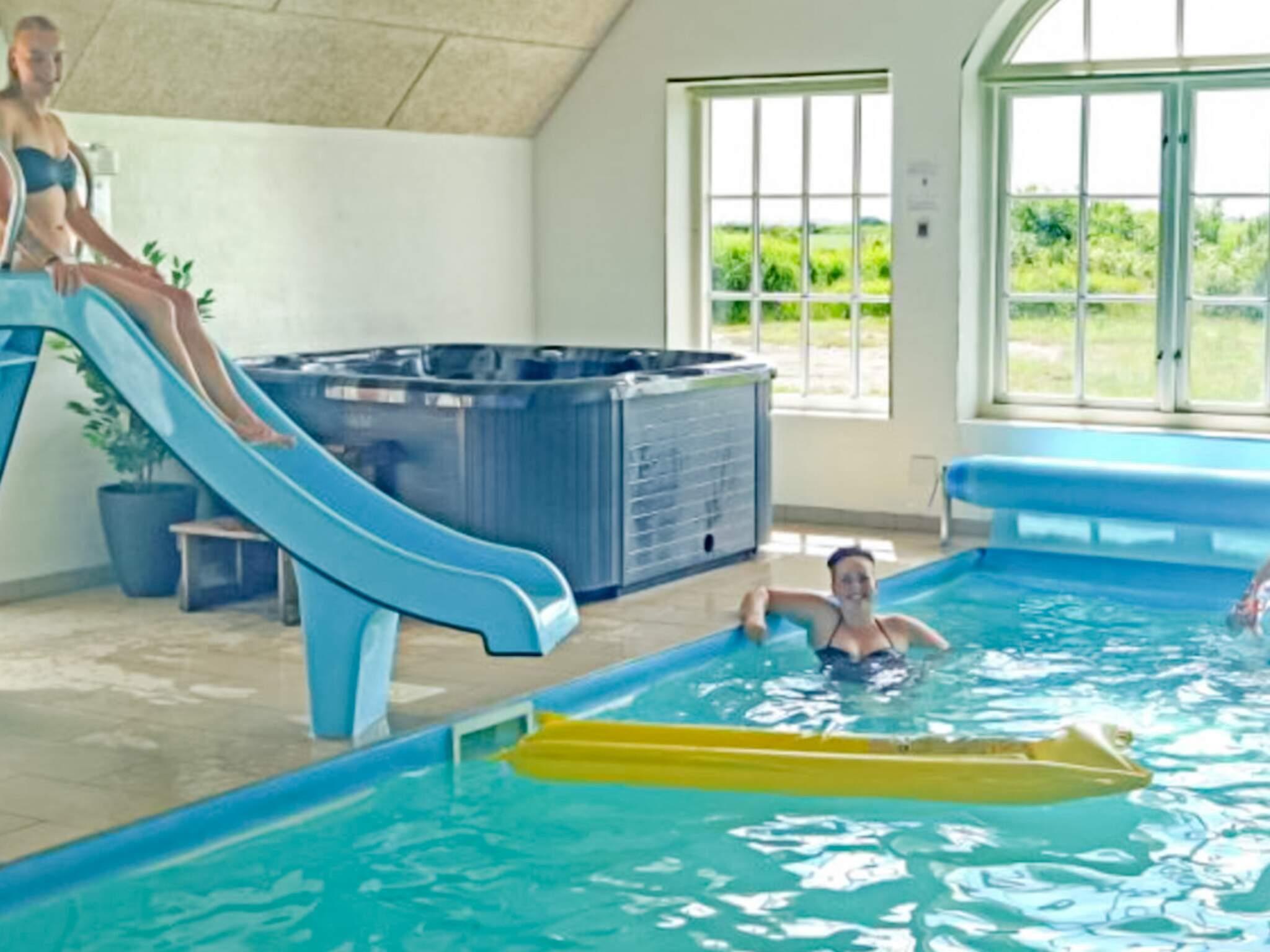 Huset på 300 m² ligger på 3500 m² naturgrund ca. 2 km fra Vesterhavet, som altid er et besøg værd uanset årstid. I det herlige poolrum kan hele familien more sig i den store pool eller det indbydende spabad. For de spillelystne er der aktivitetsrum med billard og TV med parabol. På den lukkede terrasse er der stor mulighed for at nyde solen i havemøblerne og aftensmaden fra grillen. Til børnene er der gynge og sandkasse. I poolhuset er der 3 badeværelser med toilet, håndvask, bruseniche og gulvarme. Huset opvarmes med jordvarme. Luksus Poolhuset har 20 sovepladser: 4 værelser med dobbeltsenge, 2 værelser med hver 4 køjepladser, 1 værelse med 2 enkeltsenge og 1 sovesofa i aktivitetsrum. 2 husdyr er tilladt. Der er ikke TV2 kanal eller betalingskanaler i huset. Fiberbredbånd 1000/1000. RYGNING ER IKKE TILLADT.
