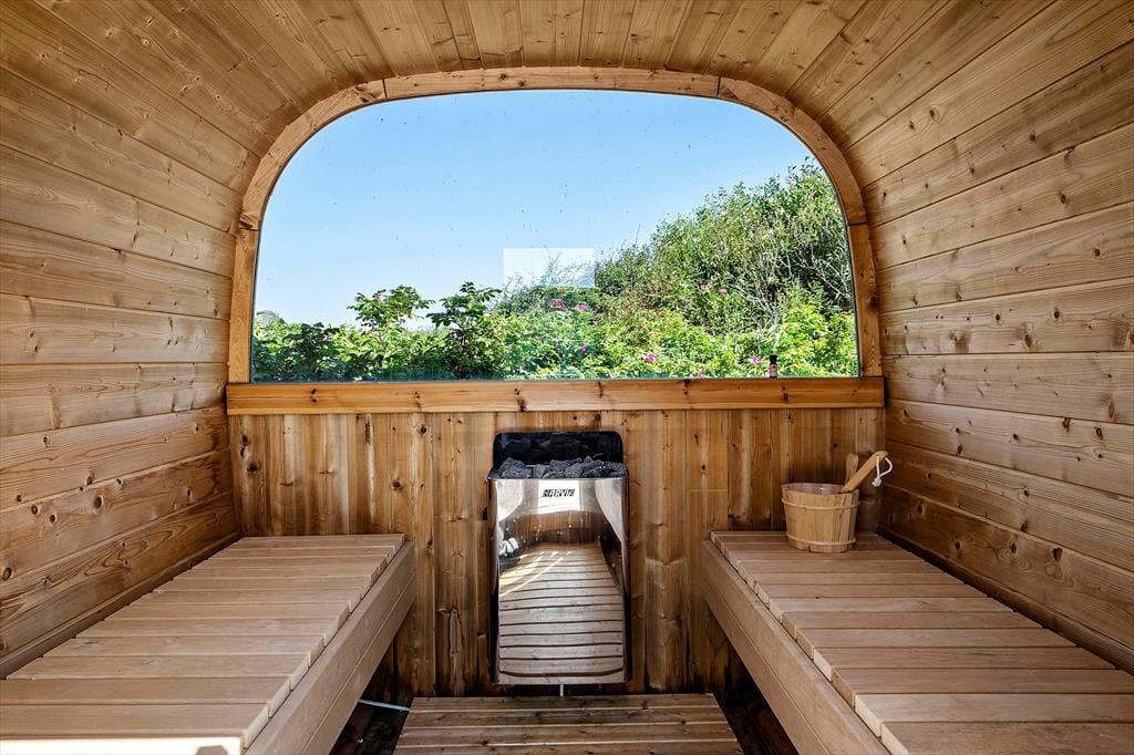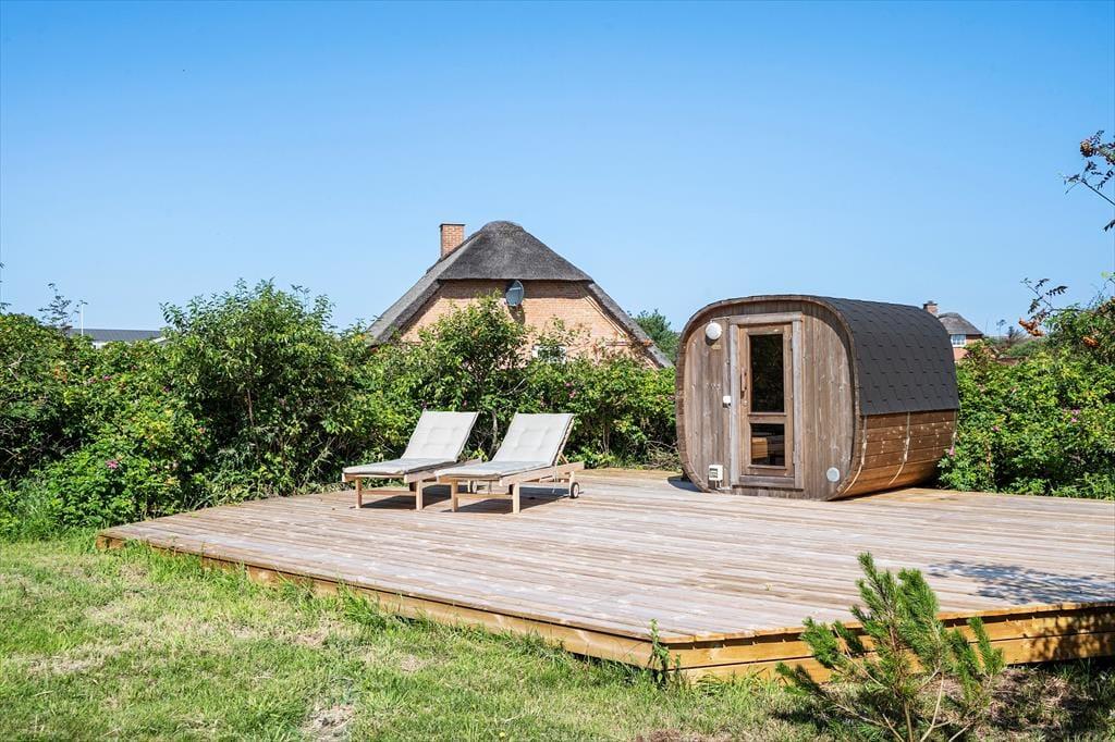 Feriehuset ligger på en skøn naturgrund på 2700 m² med gode lækroge, hvor man kan nyde solen uforstyrret. Her er både en dejlig vestvendt træterrasse og en lukket sydvendt terrasse med komfortable havemøbler — perfekt til afslapning fra morgen til aften. Som noget ekstra kan I glæde jer til den skønne udendørs sauna, der kan bruges året rundt. Der er parkering lige ved huset, og i garagen finder I forskellige udendørs spil, som hele familien kan hygge sig med.